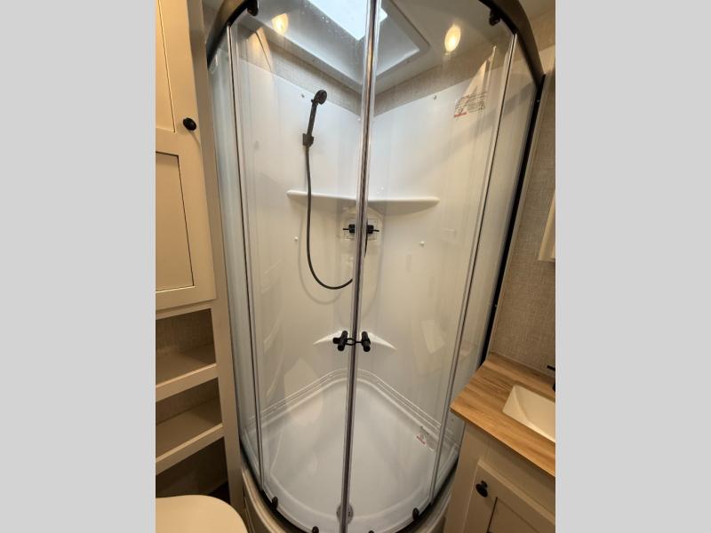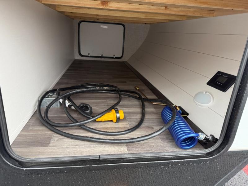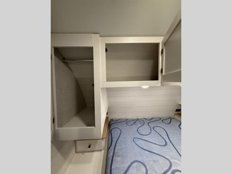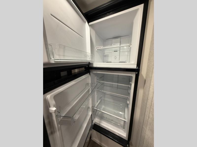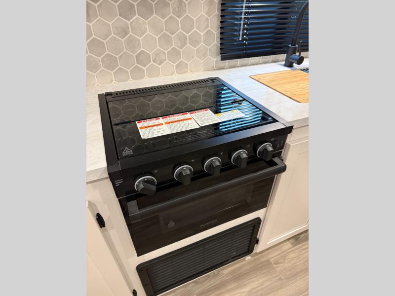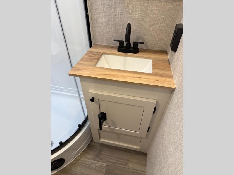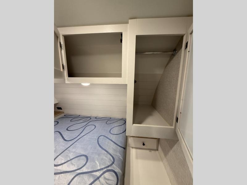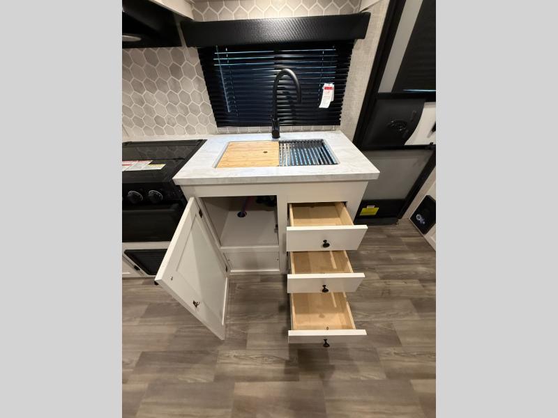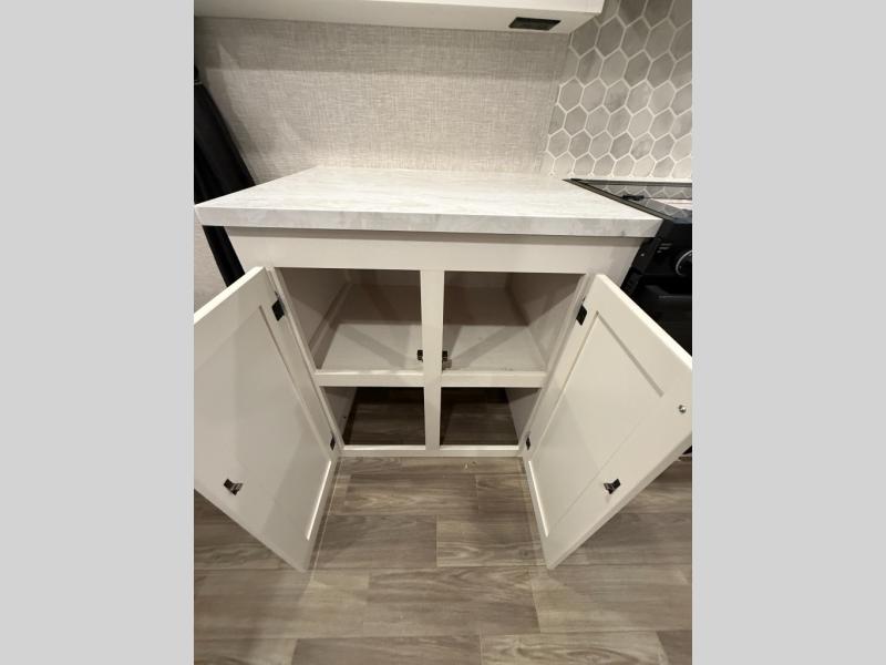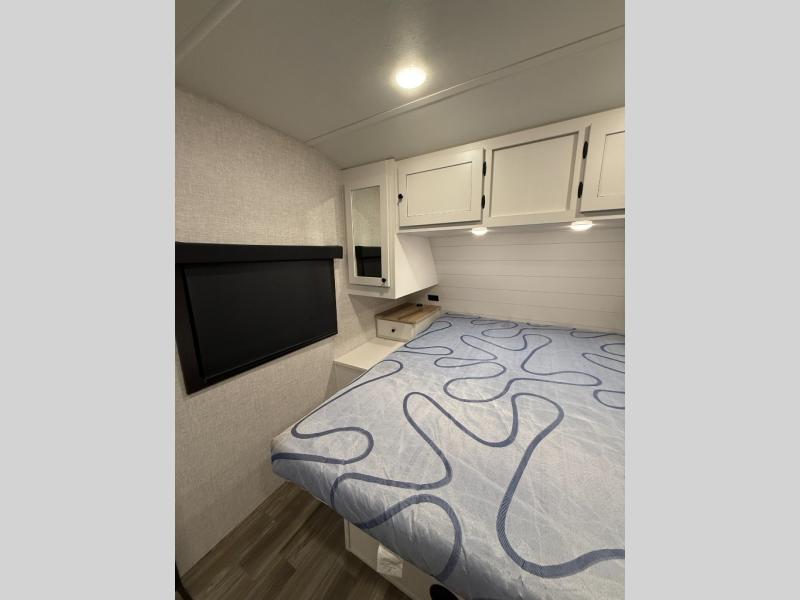 This travel trailer is the perfect couple's getaway! It features a front queen bed with wardrobes on either side for your clothes, overhead cabinets, and a privacy curtain to draw at night. You can prepare your best meals with the three burner cooktop with a 17" oven, enjoy them at the L-sofa with a table which is conveniently across from the entertainment center that has a smart HDTV, and store any leftovers in the 10 cu. ft. refrigerator. The rear corner bathroom has a radius shower to freshen up in each morning, a medicine cabinet to store your toiletries, and a linen closet to keep your towels close.