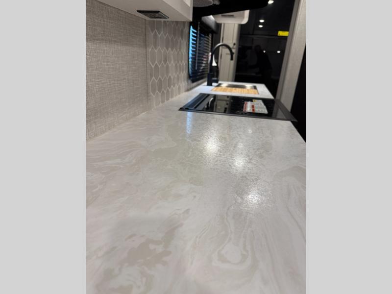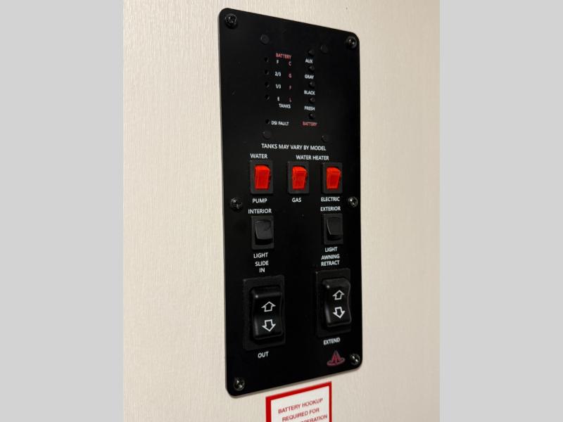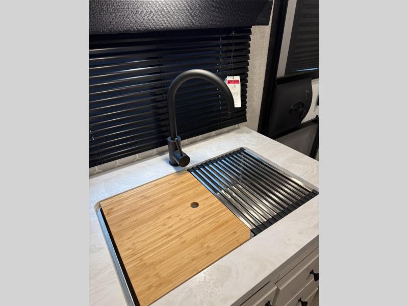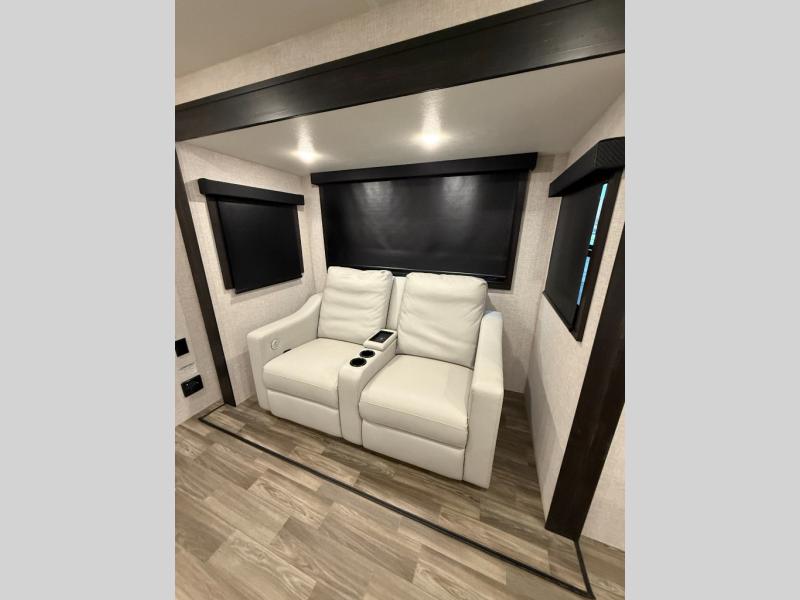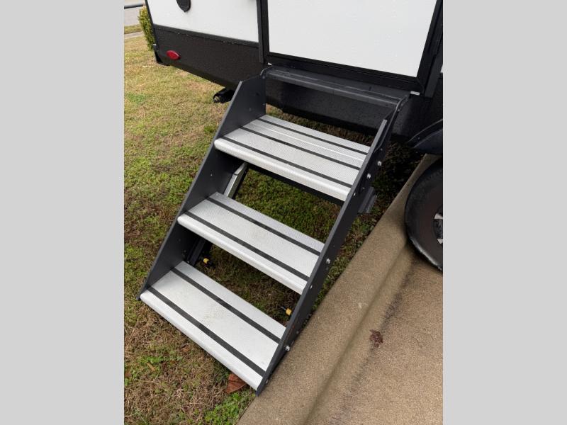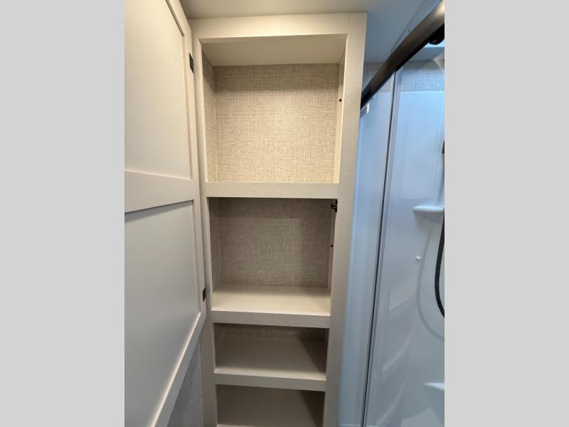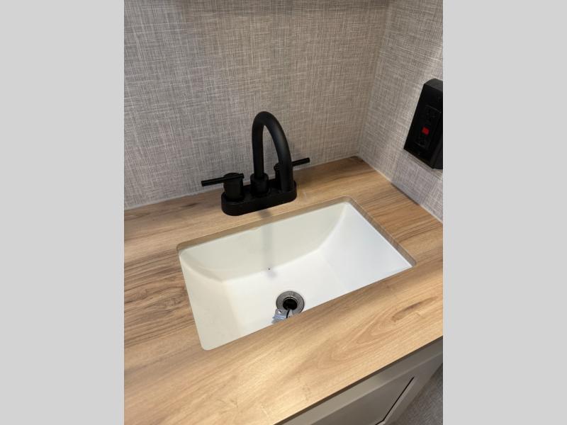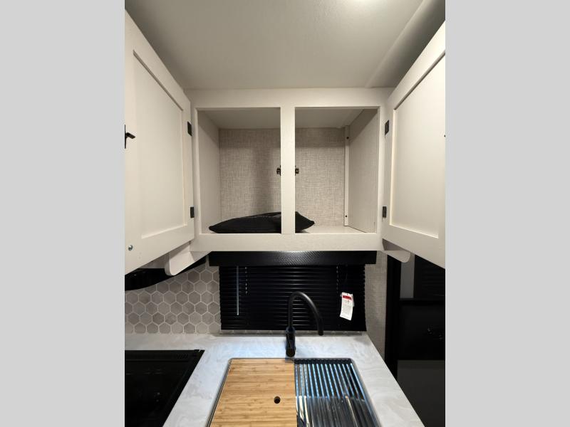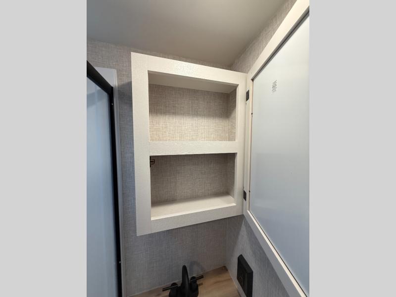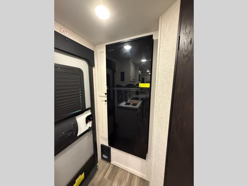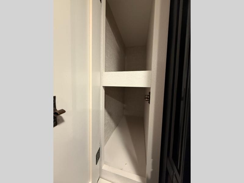 This travel trailer is the perfect couple's getaway! It features a front queen bed with wardrobes on either side for your clothes, overhead cabinets, and a privacy curtain to draw at night. You can prepare your best meals with the three burner cooktop with a 17" oven, enjoy them at the L-sofa with a table which is conveniently across from the entertainment center that has a smart HDTV, and store any leftovers in the 10 cu. ft. refrigerator. The rear corner bathroom has a radius shower to freshen up in each morning, a medicine cabinet to store your toiletries, and a linen closet to keep your towels close.