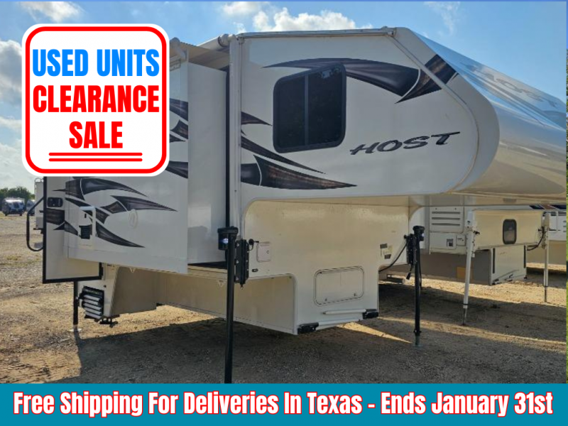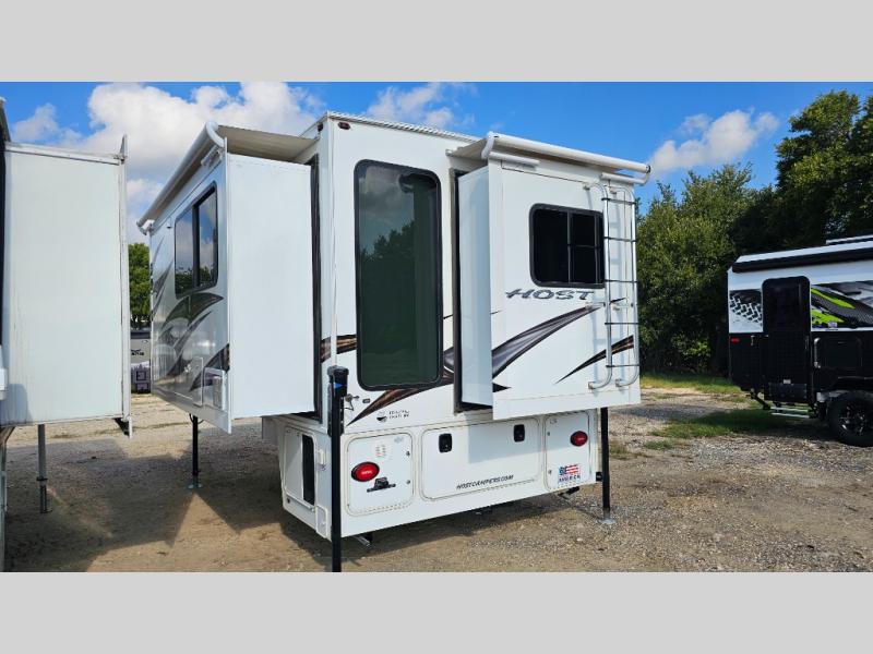 With any Host Industries Host Campers truck camper, there is ease of setting up with electric jacks with a wireless remote, and security when traveling thanks to the heavy duty camper tie down brackets. Each is constructed with two or three slide outs giving you more interior space on an Ultralite 100% aluminum structure with vacuum bonded foam insulated walls, a floor and a ceiling, plus there is a one-piece TPO roof. Some conveniences include an enclosed service center, enclosed and heated holding tanks, large J-rail rain gutters, and access panels for the slide out motors, water tank and holding tanks to mention a few. And the interior is just as impressive from the style, decor choices, the 12 volt LED lighting system, the Grani-coat solid surface countertops, and the many options you can add to customize your Host Camper!