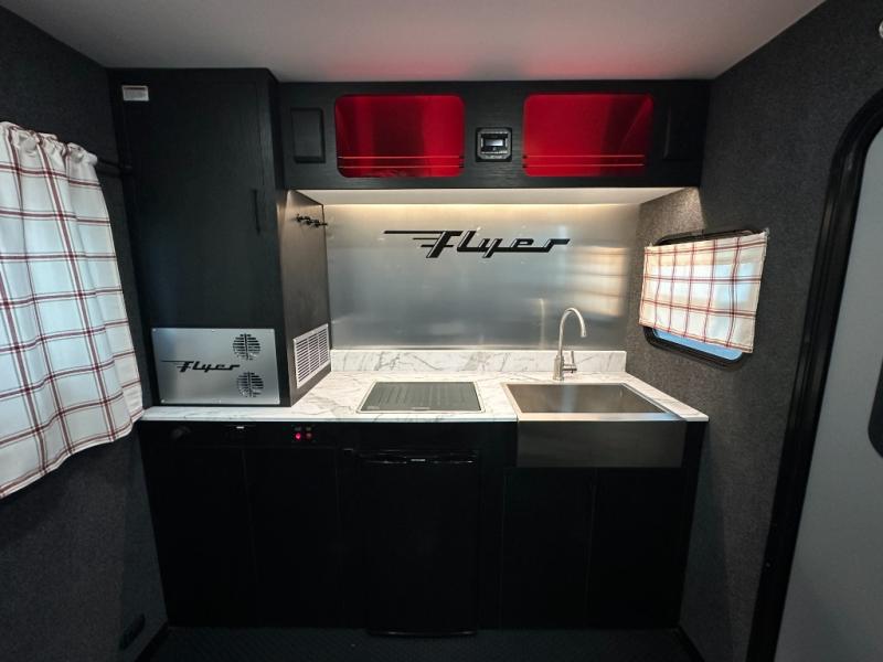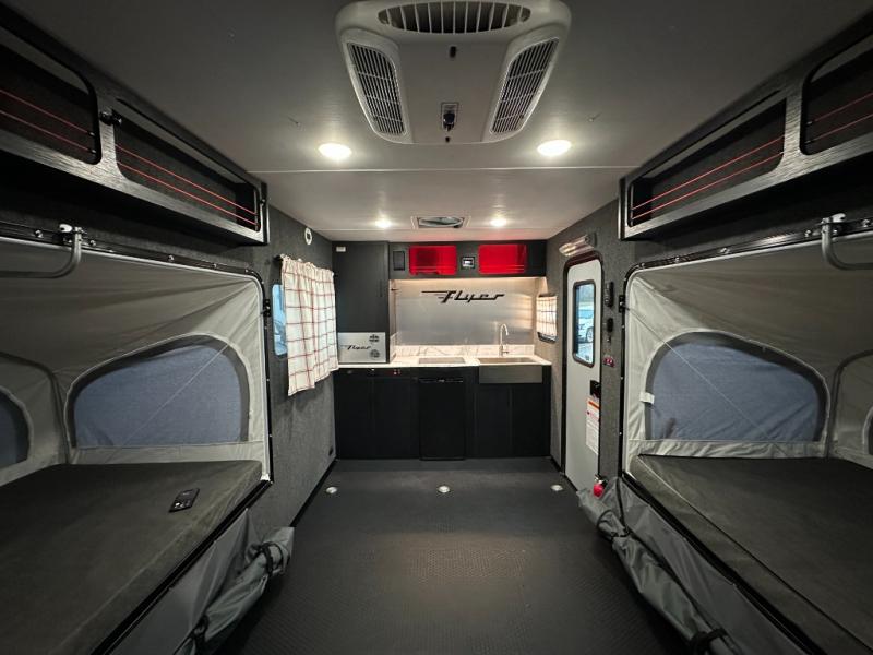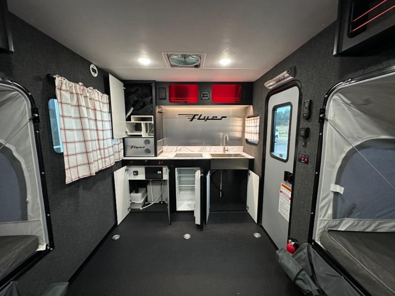 This Flyer expandable toy hauler is perfect for all your outdoor adventure! Not only does this toy hauler provide you with a spacious and versatile interior, but it also gives you a desirable cargo space so that you can bring along some toys for the adventure. This expandable comes standard with one tip-out bed, but you can easily add on the second optional tip-out bed which will add lots of extra room for sleeping and relaxing. The other feature found on this Flyer that is going to make your trips truly effortless is the front kitchen that comes with a two-burner stainless steel cooktop, a 3.1-cubic foot refrigerator, a large farmhouse sink, and an 8.5-gallon fresh water tank. This expandable toy hauler has a dry weight and net carrying capacity that ranges from 2,440-2,760 LBS.