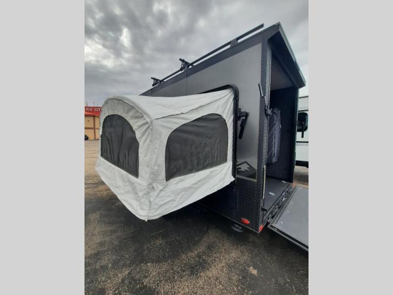 The inTech RV Flyer travel trailers and toy hauler expandables are ready for adventure whenever you are! With the all-aluminum, all-tube cage frame, the Flyer has been built with lightweight and long-lasting materials so that you can enjoy your unit for many, many years. The Flyer has a rugged design so that you can confidently explore new territory and go where traditional RVs cannot. The Flyer has a 2" rear receiver rated for 175 pounds which allows you to bring along your bikes, and the Bluetooth stereo has two speakers you can always have your best music playing. The optional roof rack will allow you to bring along kayaks, and there are more available options depending on the model you choose.