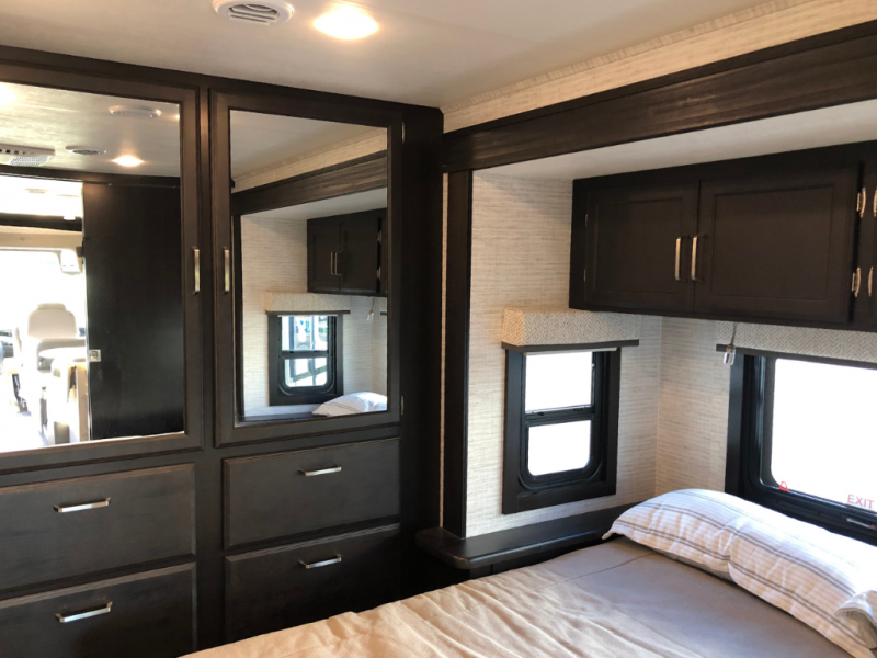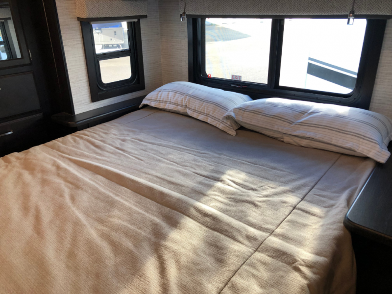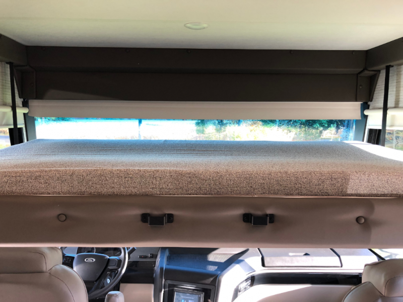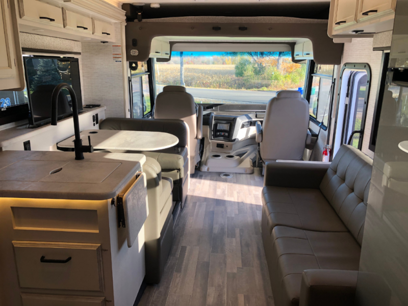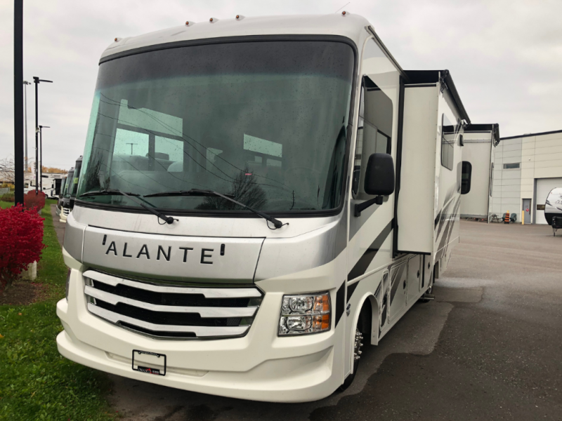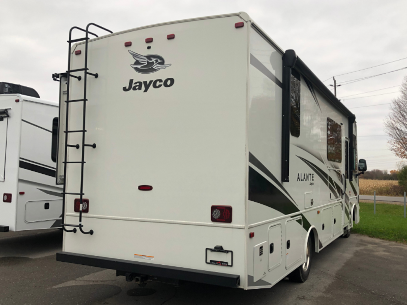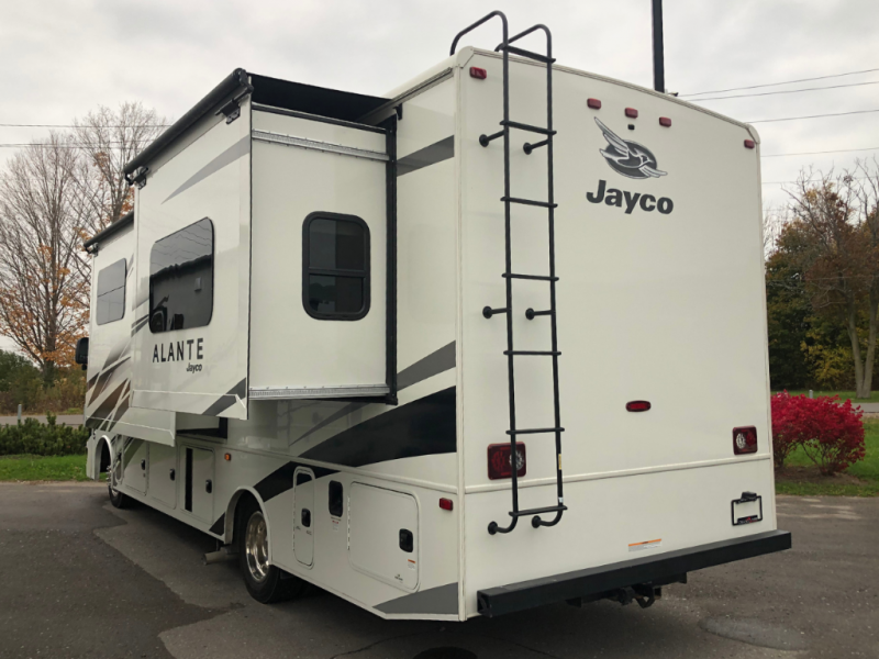 With any Alante Class A gas motorhome by Jayco, the mandatory Customer Value package provides JRide technology with a computer-balanced driveshaft ensuring smooth and efficient power transfer to the wheels, and SACHS shock absorbers offering independent adjustments to the road conditions. There is also a one-piece, seamless, crowned fiberglass roof, and an exterior entertainment center to watch shows and movies. The automatic hydraulic leveling jacks, 120 in. panoramic windshield, 200W solar panel, and the electric-powered entrance step will make traveling that much easier. And the interior equipment includes a Sony infotainment center with Apple CarPlay and Android Auto, a backup and side-view cameras for easy parking, plus a 6-way power driver seat for comfortable and safe driving. You will also love the power front privacy shade with manual side privacy shades, LED-lit hardwood fascia and countertops, a pop-up charging station in the kitchen and a USB port and wireless charging in the nightstands.