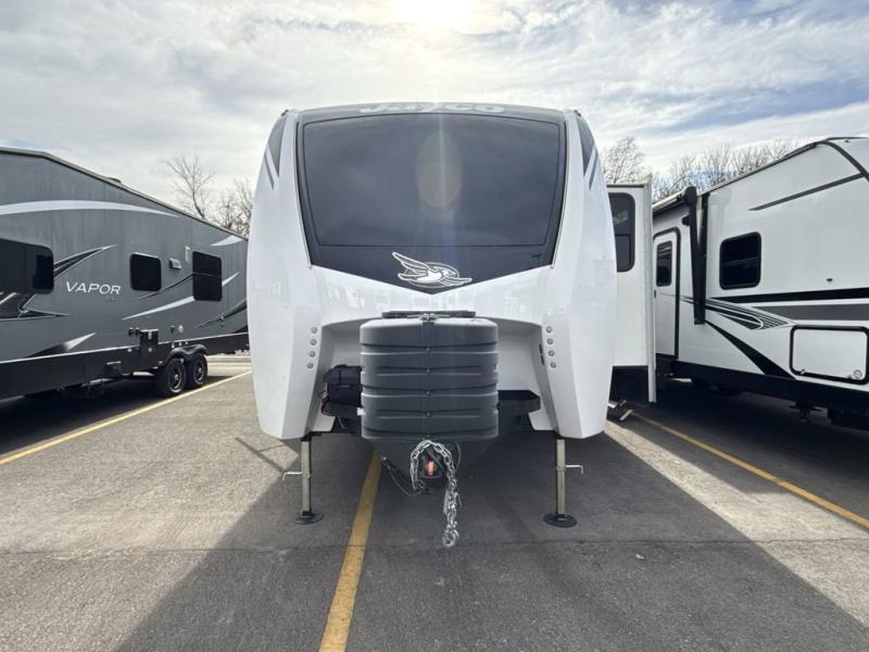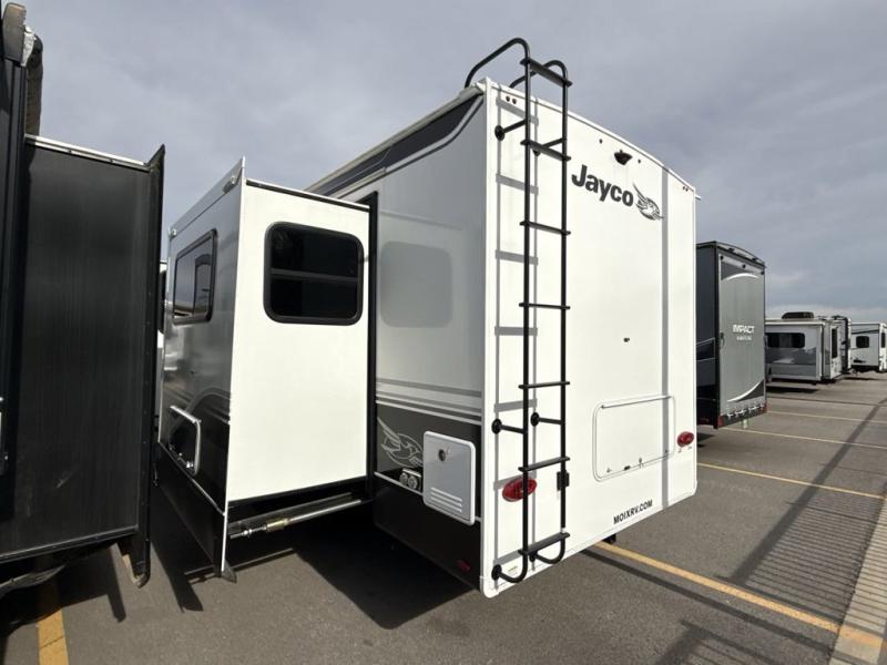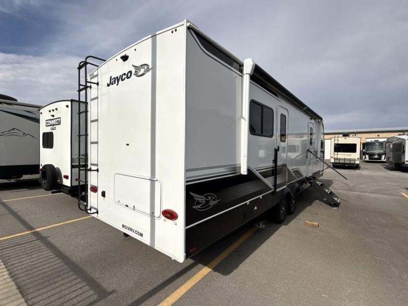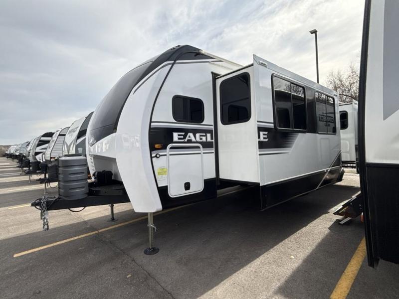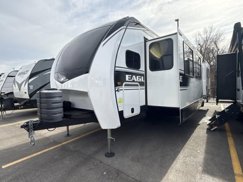 With any Eagle fifth wheel or travel trailer by Jayco you will appreciate durable construction materials, like the Magnum Truss Roof and the Stronghold VBL laminated walls. The JAYCOMMAND Smart RV system puts you in control of your RV's functions, and the 5 Star Handling Package will provide smooth towing from home to camp. Each model features Climate Shield zero-degree tested weather protection and the industry-exclusive HELIX cooling system that will keep you comfortable year around. Some of the exterior conveniences you are sure to love are the pass-through storage with Slam-Latch baggage doors and an automotive style front cap with max turn radius. The Eagle fifth wheels and travel trailers are designed to make you feel at home with solid hardwood slide fascia, residential vinyl flooring, a bathroom skylight, and plenty of storage for all your belongings.