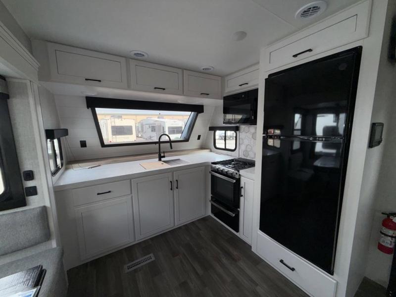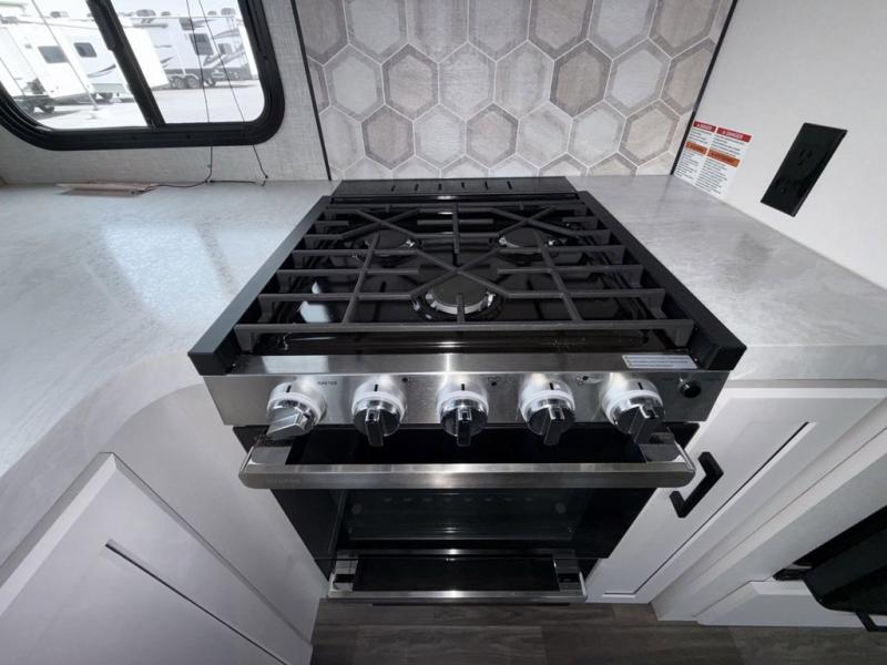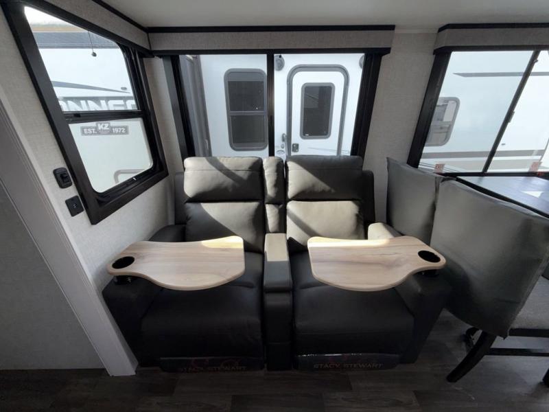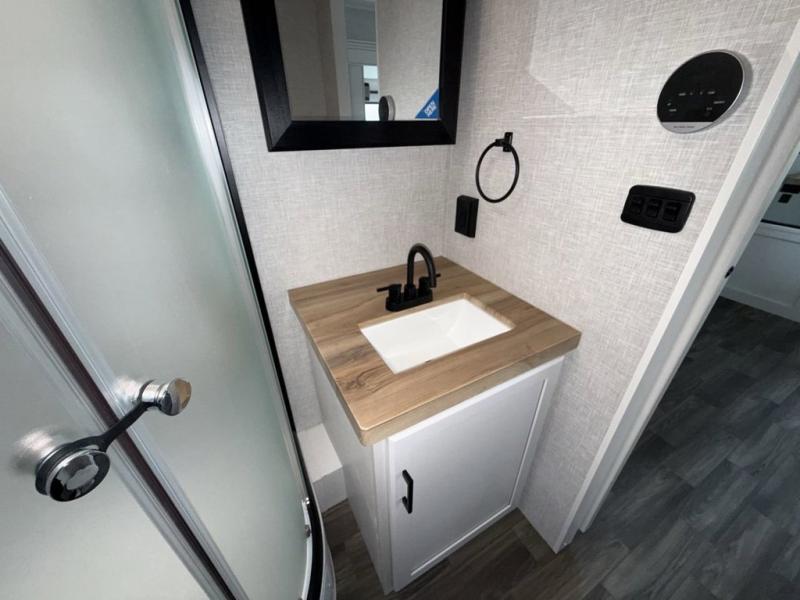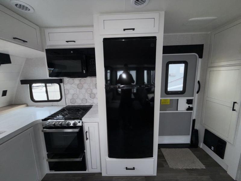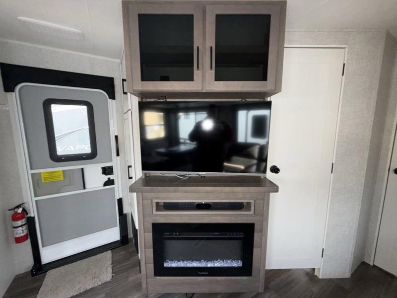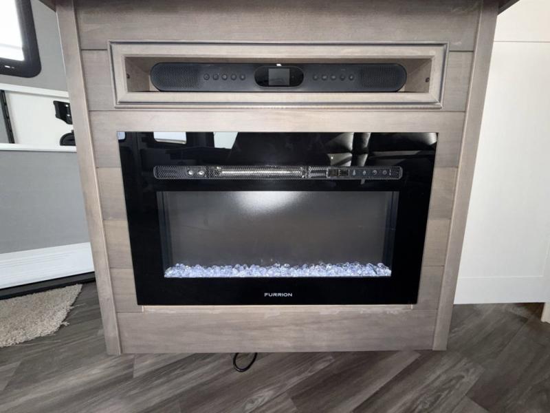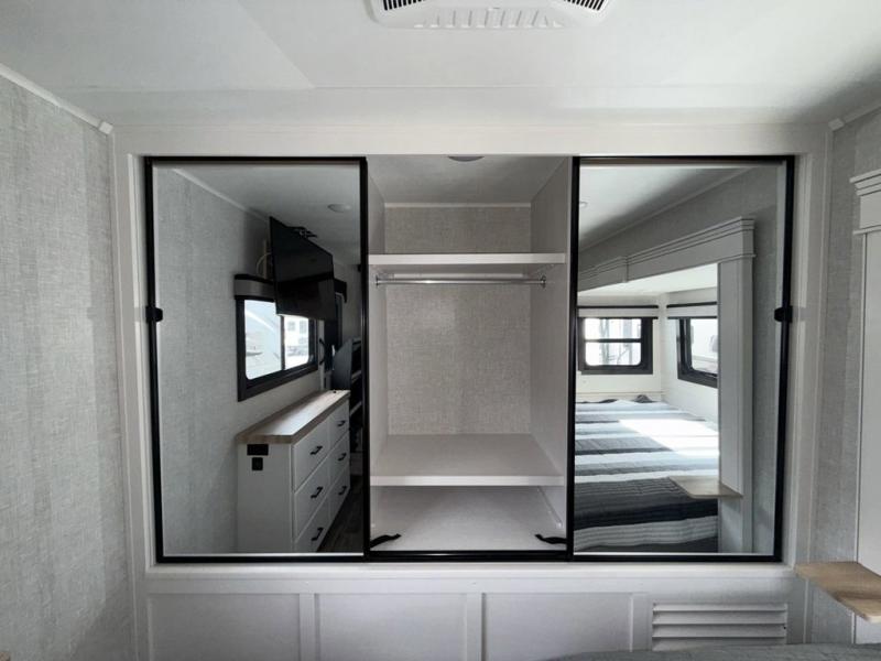 Escape the busyness of life for tranquil trips to the campground with this Eagle trailer. You will love the front kitchen with generous counter space, GE appliances, and a pantry by the entryway that can be used for food and more. If you're all hiked out, stay inside to relax on the theater seat across from the fireplace and entertainment center. There is also a free-standing table to dine at or play a game of cards. The dual entry bath will create a rear master suite, complete with a queen bed across from a dresser, a private exit door, plus a full-width wardrobe with washer and dryer prep!