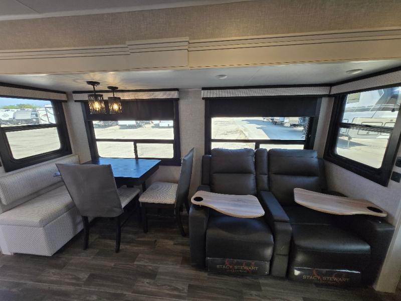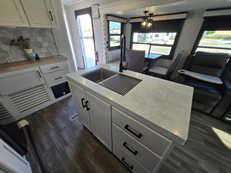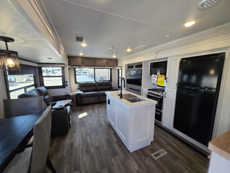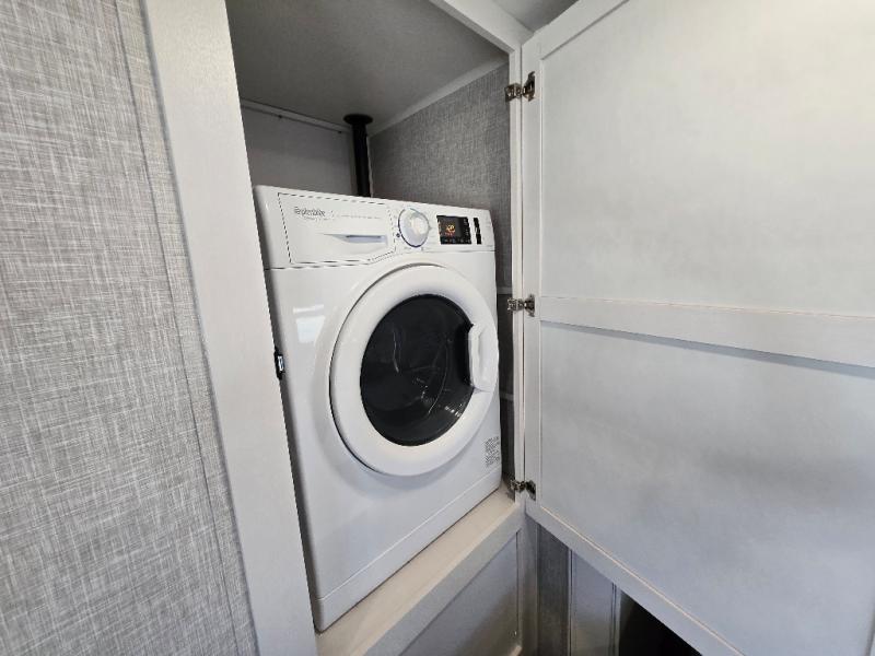 You will feel right at home camping in this travel trailer! It features a front private bedroom with a queen bed slide for more interior space, a dresser, a front wardrobe to hang your clothes, and a wardrobe that is prepped to add an optional washer and dryer. Start each morning getting squeaky clean in the full bathroom with the shower and then head to the kitchen to fry up some eggs on the stainless steel range. The kitchen island will help make meal prepping easier too, plus there is a hutch to store your dishes. Enjoy a relaxing evening by the fireplace and watch your favorite movie with the entertainment center while sitting on either the rear tri-fold sofa or the theater seating!