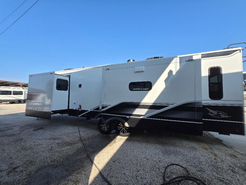 With any Eagle fifth wheel or travel trailer by Jayco you will appreciate durable construction materials, like the Magnum Truss Roof and the Stronghold VBL laminated walls. The JAYCOMMAND Smart RV system puts you in control of your RV's functions, and the 5 Star Handling Package will provide smooth towing from home to camp. Each model features Climate Shield zero-degree tested weather protection and the industry-exclusive HELIX cooling system that will keep you comfortable year around. Some of the exterior conveniences you are sure to love are the pass-through storage with Slam-Latch baggage doors and an automotive style front cap with max turn radius. The Eagle fifth wheels and travel trailers are designed to make you feel at home with solid hardwood slide fascia, residential vinyl flooring, a bathroom skylight, and plenty of storage for all your belongings.