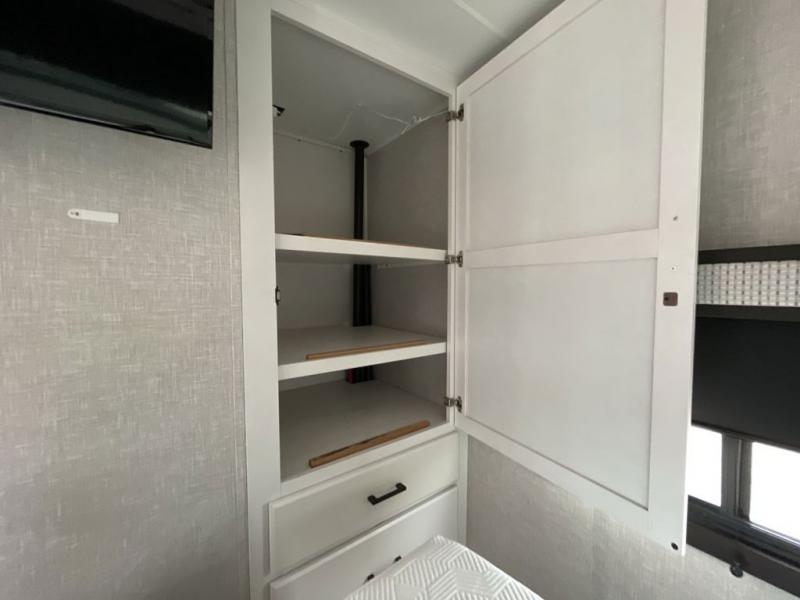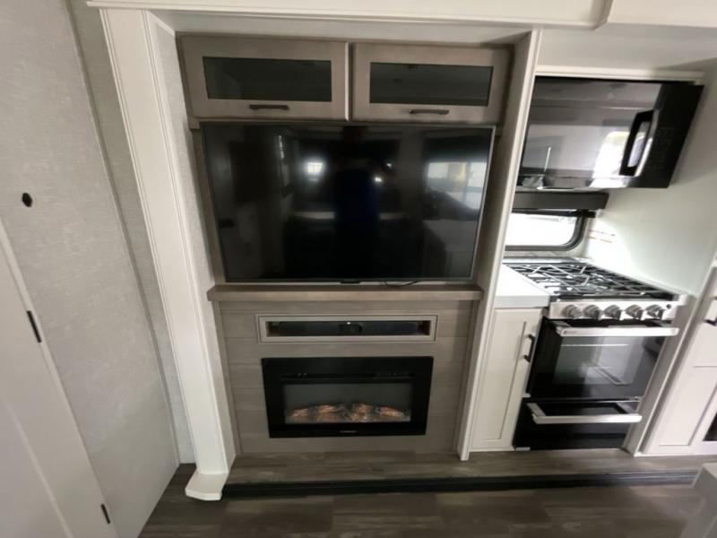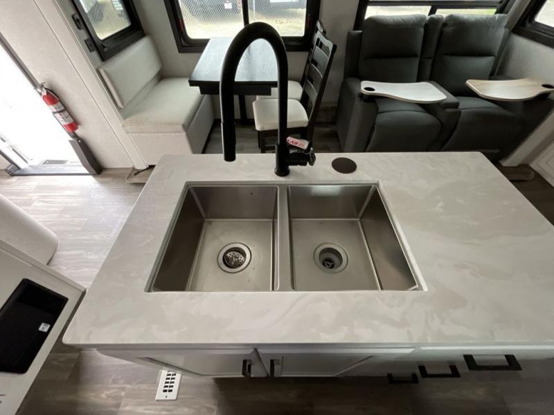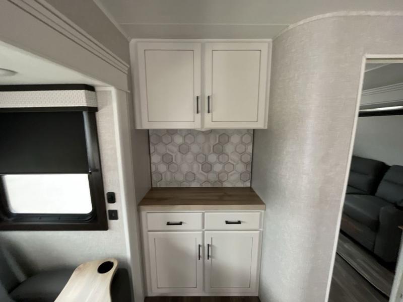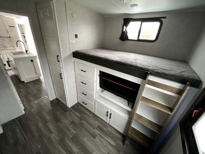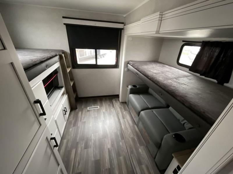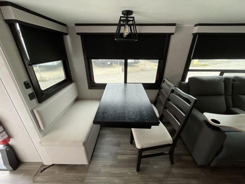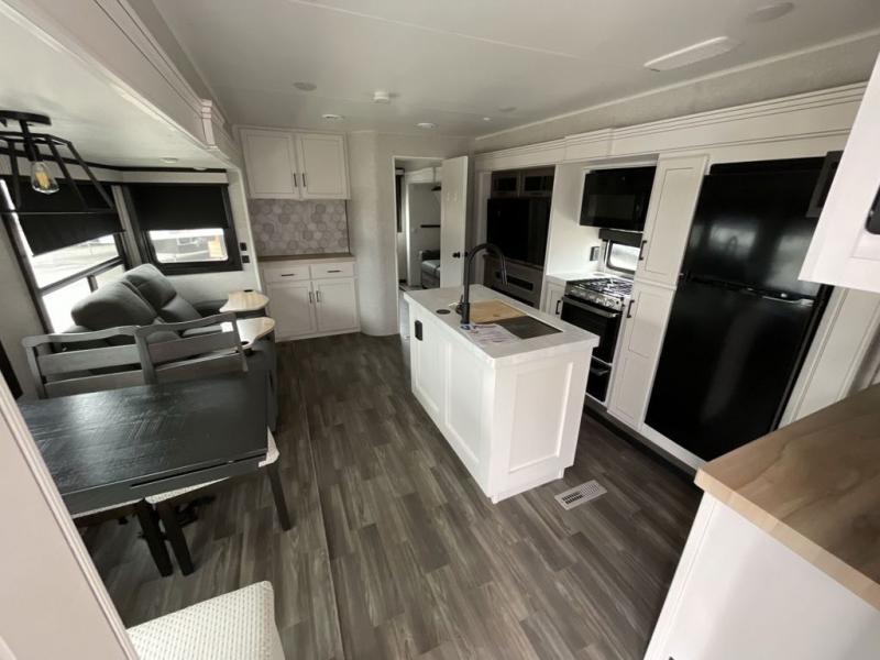 This travel trailer is perfect for your larger group or family! There is a rear private bunkhouse with two bunks, a tri-fold sofa, plus a slide out for more space. You will have the front private bedroom all to yourselves with a queen bed, and any other guests can sleep on the tri-fold sofa and booth dinette! There is also a wardrobe/linen closet with washer and dryer prep if you plan to add a washer and dyer for convenience. The chef can prepare their best meals with the kitchen island and will enjoy having two hutches to store the essentials. They could even cook at the outside kitchen to breathe in some fresh air and enjoy the beautiful scenery!