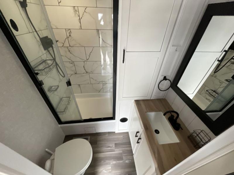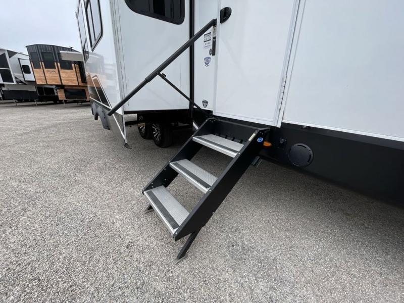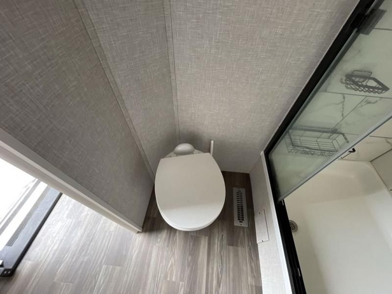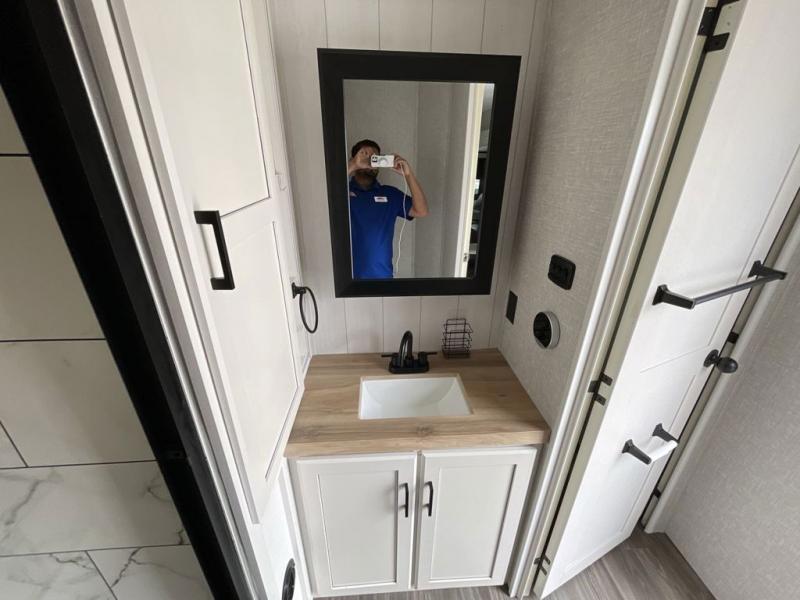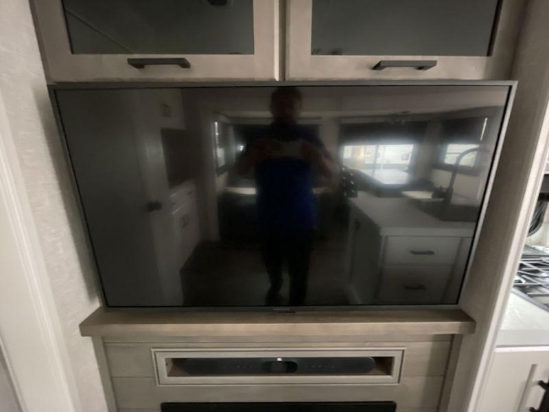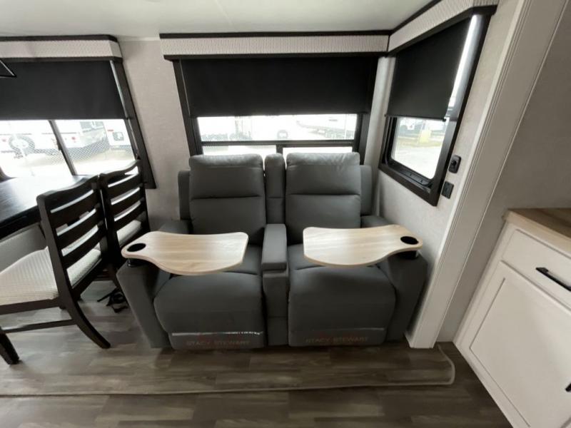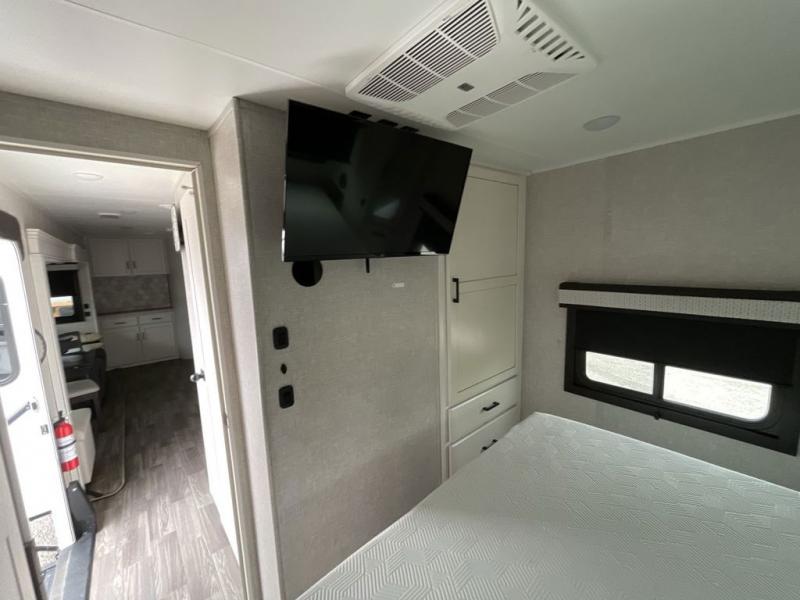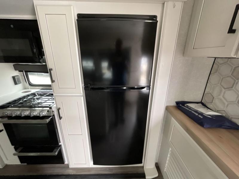 This travel trailer is perfect for your larger group or family! There is a rear private bunkhouse with two bunks, a tri-fold sofa, plus a slide out for more space. You will have the front private bedroom all to yourselves with a queen bed, and any other guests can sleep on the tri-fold sofa and booth dinette! There is also a wardrobe/linen closet with washer and dryer prep if you plan to add a washer and dyer for convenience. The chef can prepare their best meals with the kitchen island and will enjoy having two hutches to store the essentials. They could even cook at the outside kitchen to breathe in some fresh air and enjoy the beautiful scenery!
