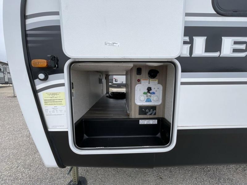 With any Eagle fifth wheel or travel trailer by Jayco you will appreciate durable construction materials, like the Magnum Truss Roof and the Stronghold VBL laminated walls. The JAYCOMMAND Smart RV system puts you in control of your RV's functions, and the 5 Star Handling Package will provide smooth towing from home to camp. Each model features Climate Shield zero-degree tested weather protection and the industry-exclusive HELIX cooling system that will keep you comfortable year around. Some of the exterior conveniences you are sure to love are the pass-through storage with Slam-Latch baggage doors and an automotive style front cap with max turn radius. The Eagle fifth wheels and travel trailers are designed to make you feel at home with solid hardwood slide fascia, residential vinyl flooring, a bathroom skylight, and plenty of storage for all your belongings.
