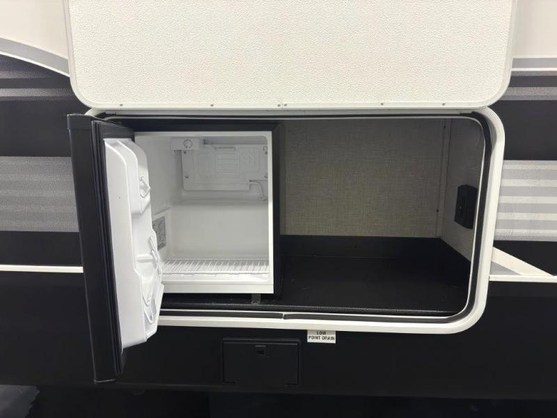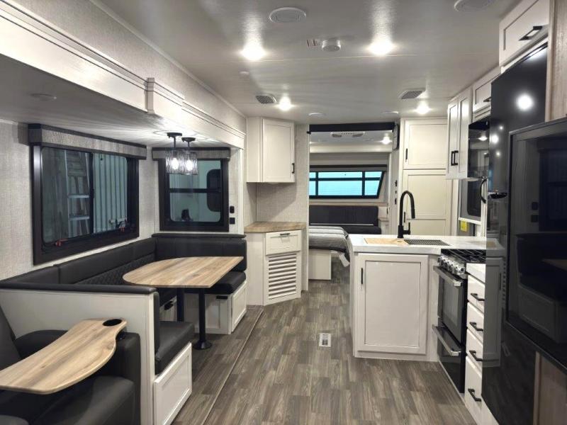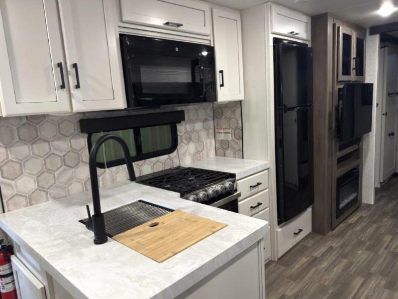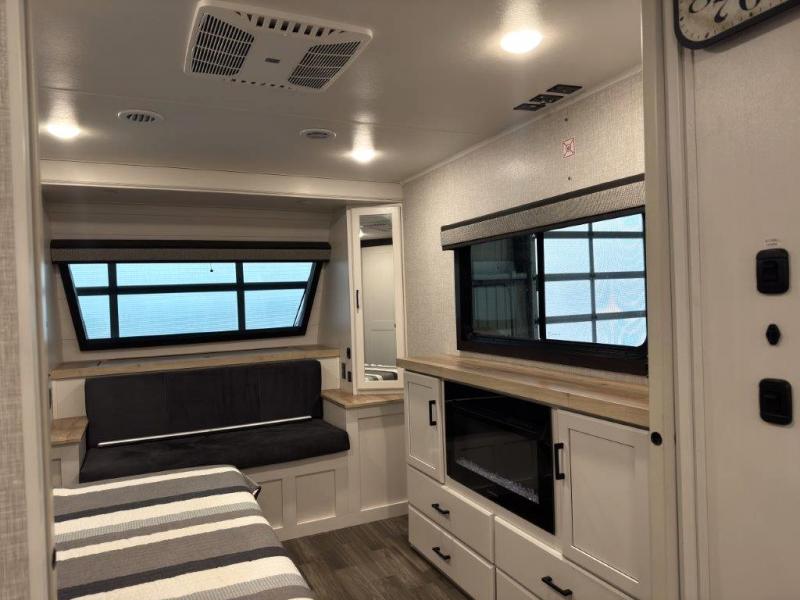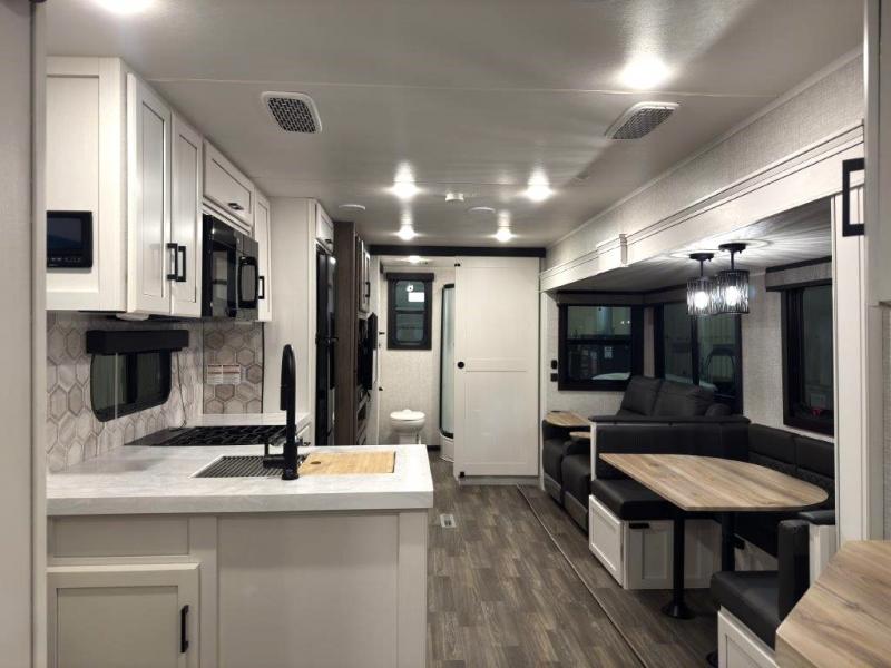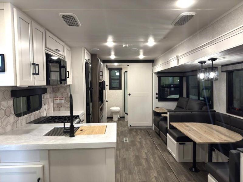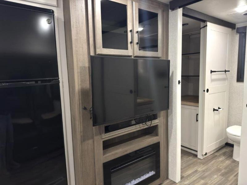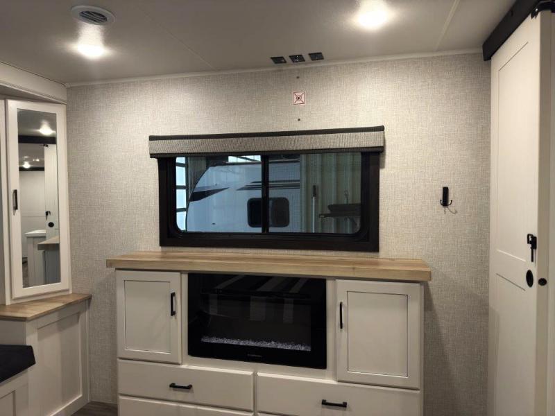Head to your favorite campsite and camp as long as you want with this travel trailer! The full rear bathroom has a radius shower to freshen up in each morning and a wardrobe/linen closet with washer and dyer prep. The tri-fold sofa offers a comfortable place to watch your favorite movie and enjoy the fireplace at the entertainment center. After the chef has prepared their best meal either indoors with the stainless steel range or at the outside kitchen, you can enjoy it at the U-shaped dinette then play a card game. The large corner hutch is big enough to store everyone's favorite snacks and the entry wardrobe helps to keep your coats out of the way. There is also a walk-in pantry hidden behind the entertainment center! The front private bedroom has a queen bed slide for more interior space and a dresser with TV prep and the ability to add an optional fireplace, as well as a bedroom bench seat to read a book with wardrobes on either sides for your clothes!