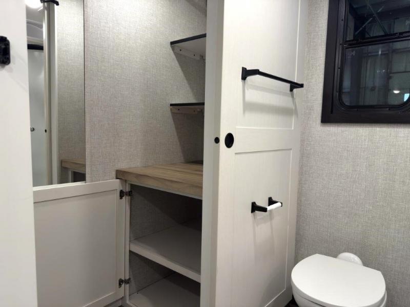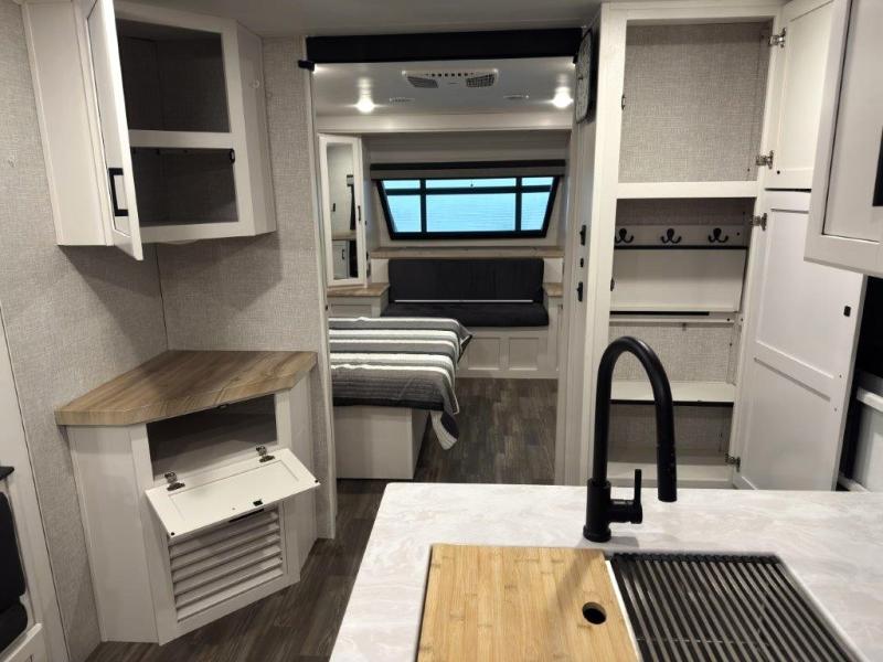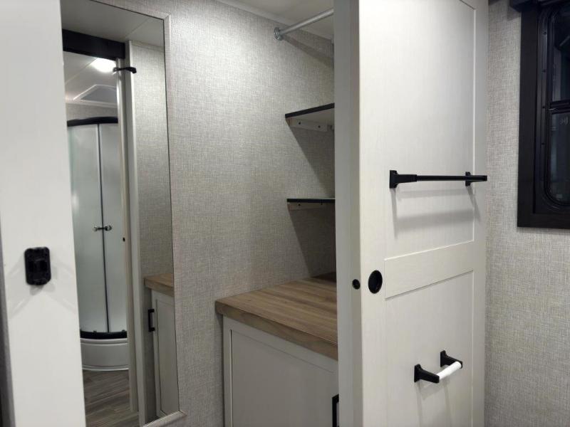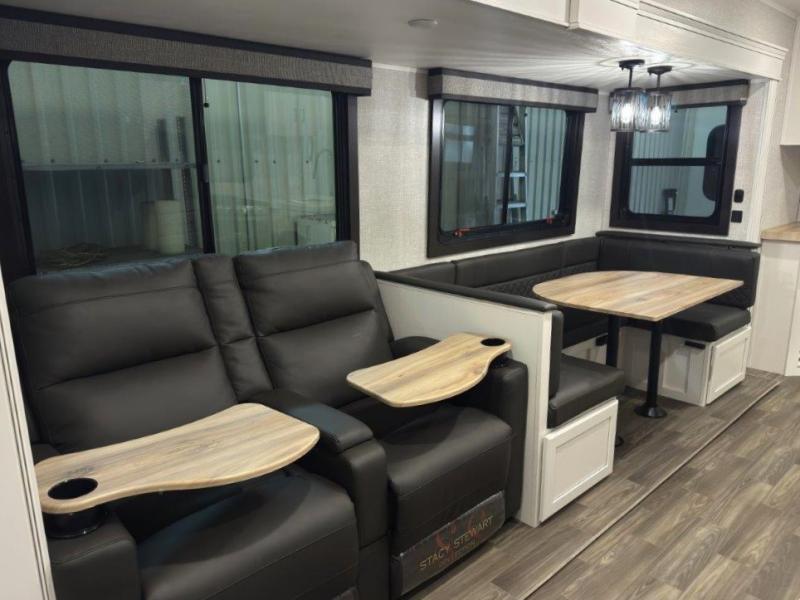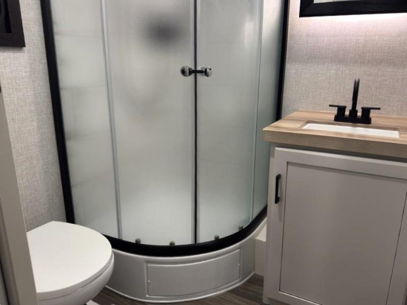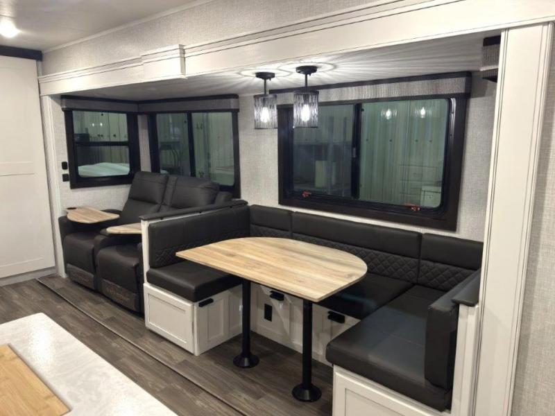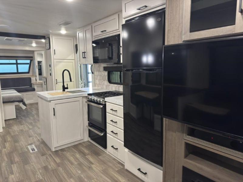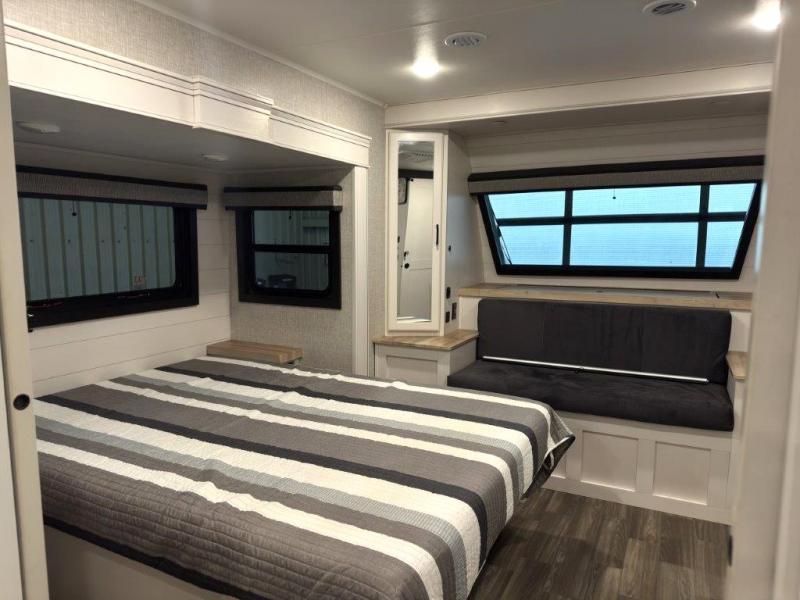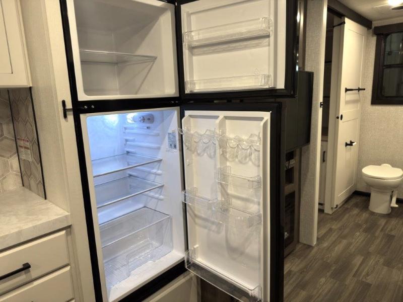 Head to your favorite campsite and camp as long as you want with this travel trailer! The full rear bathroom has a radius shower to freshen up in each morning and a wardrobe/linen closet with washer and dyer prep. The tri-fold sofa offers a comfortable place to watch your favorite movie and enjoy the fireplace at the entertainment center. After the chef has prepared their best meal either indoors with the stainless steel range or at the outside kitchen, you can enjoy it at the U-shaped dinette then play a card game. The large corner hutch is big enough to store everyone's favorite snacks and the entry wardrobe helps to keep your coats out of the way. There is also a walk-in pantry hidden behind the entertainment center! The front private bedroom has a queen bed slide for more interior space and a dresser with TV prep and the ability to add an optional fireplace, as well as a bedroom bench seat to read a book with wardrobes on either sides for your clothes!