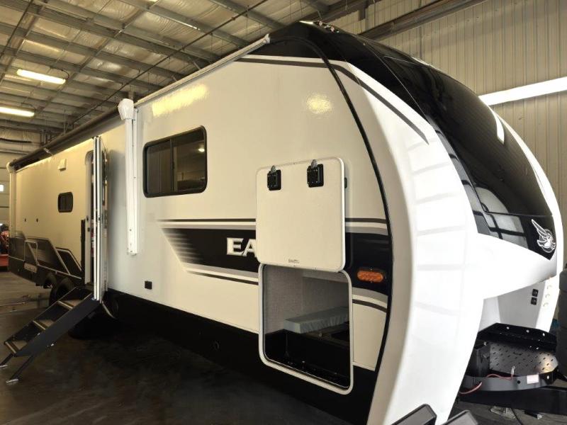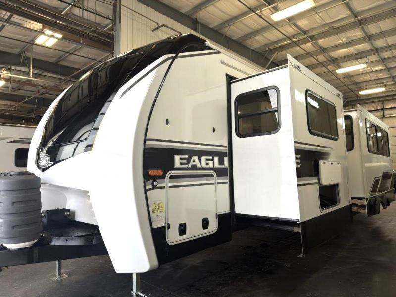 With any Eagle fifth wheel or travel trailer by Jayco you will appreciate durable construction materials, like the Magnum Truss Roof and the Stronghold VBL laminated walls. The JAYCOMMAND Smart RV system puts you in control of your RV's functions, and the 5 Star Handling Package will provide smooth towing from home to camp. Each model features Climate Shield zero-degree tested weather protection and the industry-exclusive HELIX cooling system that will keep you comfortable year around. Some of the exterior conveniences you are sure to love are the pass-through storage with Slam-Latch baggage doors and an automotive style front cap with max turn radius. The Eagle fifth wheels and travel trailers are designed to make you feel at home with solid hardwood slide fascia, residential vinyl flooring, a bathroom skylight, and plenty of storage for all your belongings.