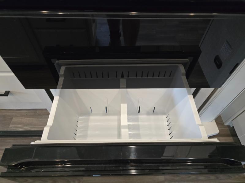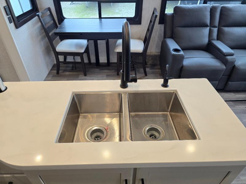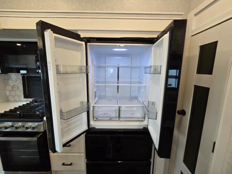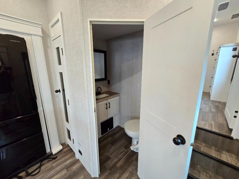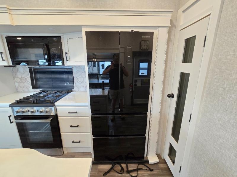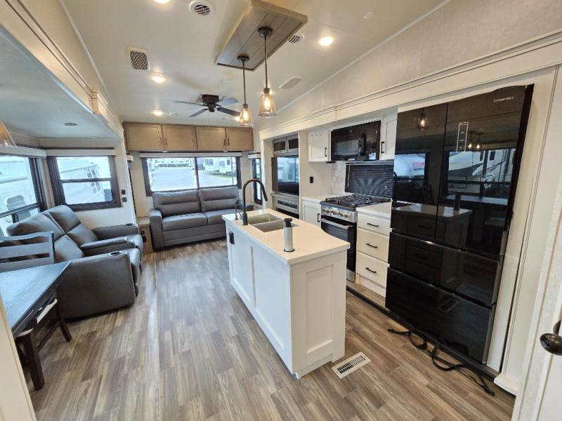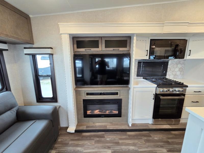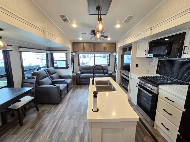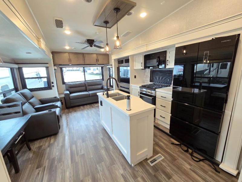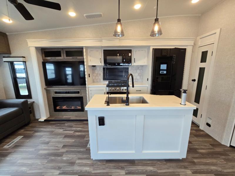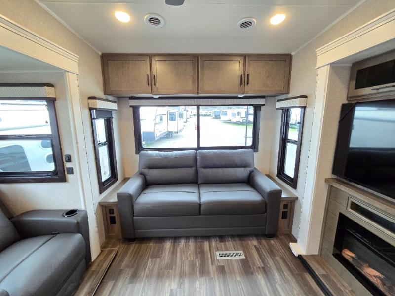 Enjoy a private bedroom suite in this fifth wheel! The king bed is positioned in a slide out for maximum room, and a sliding door leads to the front bath which is full of luxurious features. Enjoy a 30" x 60" shower with a seat. There's a walk-in front closet which has hanging space as well as prep for an optional washer and dryer. An additional wardrobe/linen closet provides some extra space. There's also a half-bath located off the kitchen, and that one has overhead storage also. You'll love the living area with its theater seats, tri-fold sofa, ceiling fan, and entertainment center with fireplace. The kitchen has a four-burner cooktop, center island with sink, 30" microwave oven over the range, and a 16 cu. ft. 12 volt refrigerator - perfect for cooking up great meals!