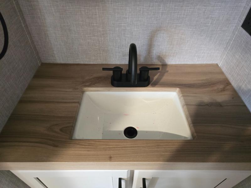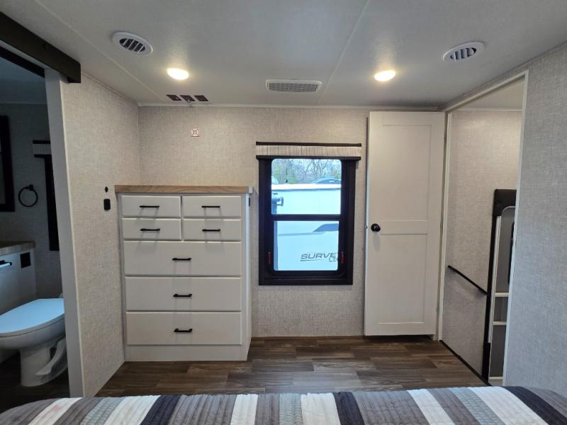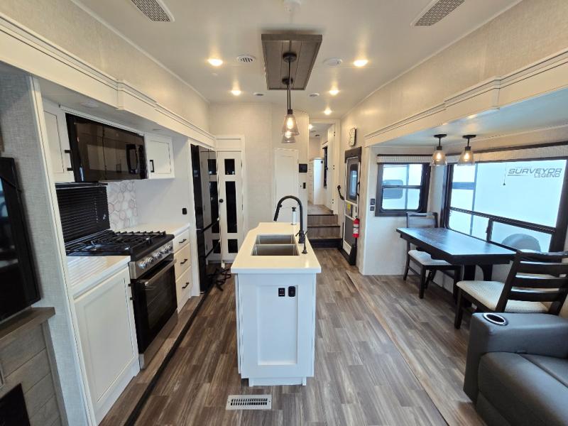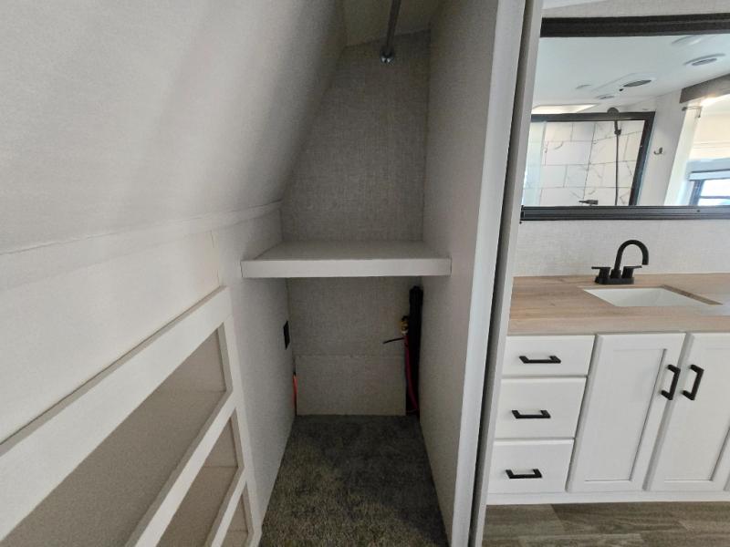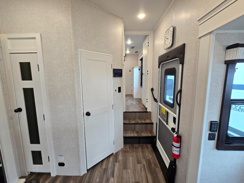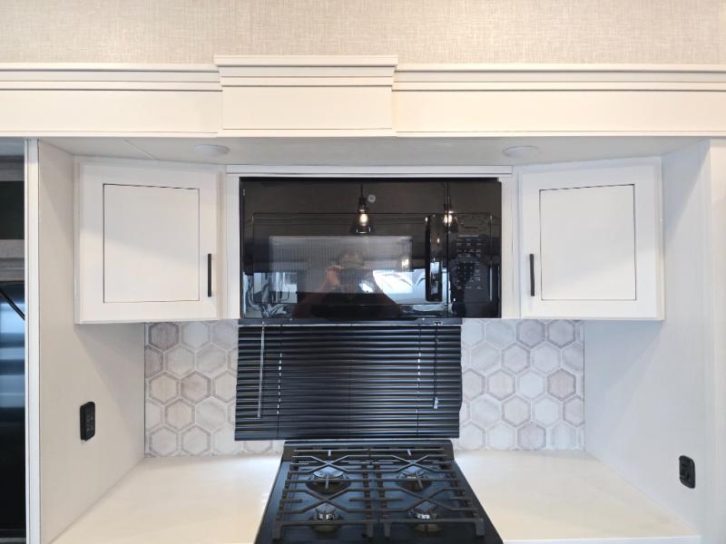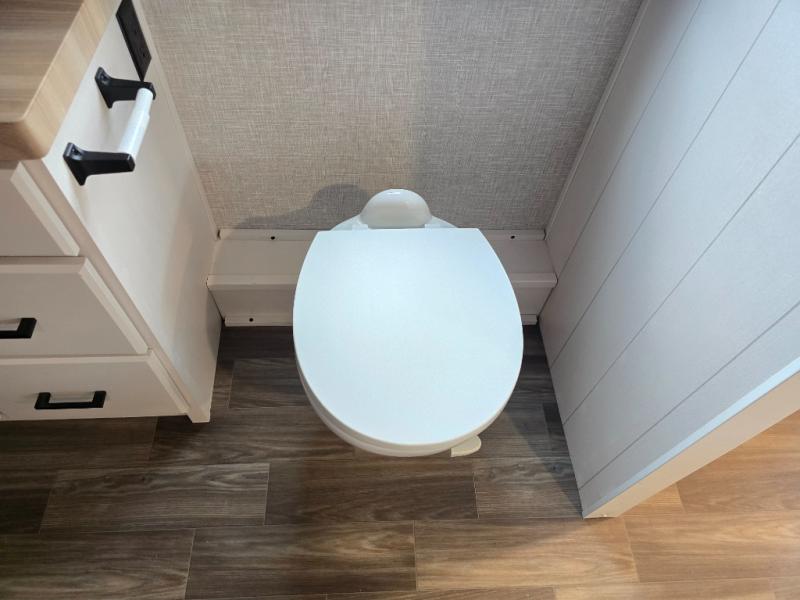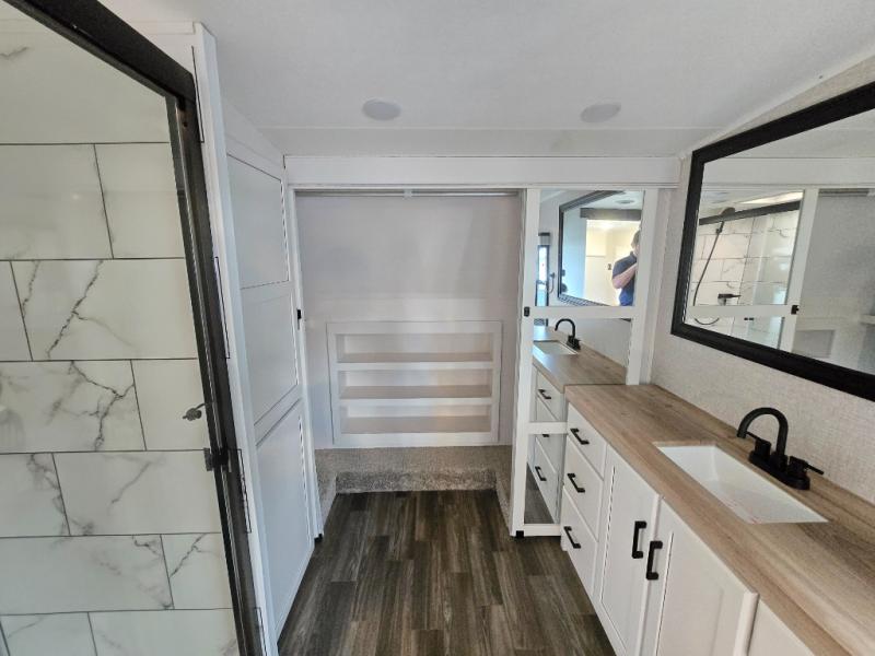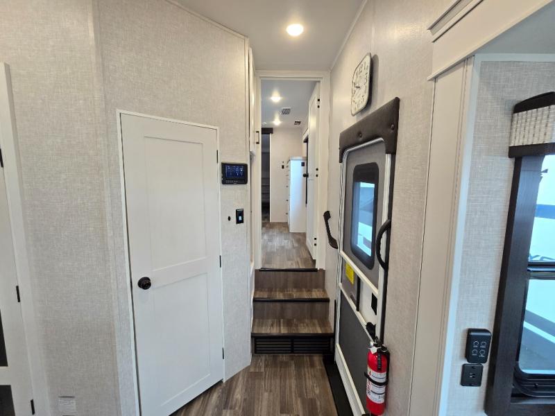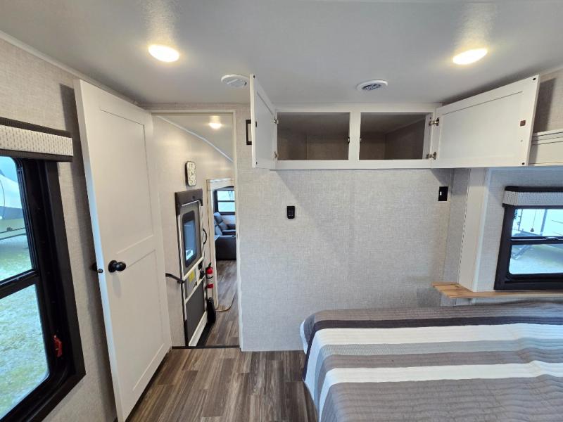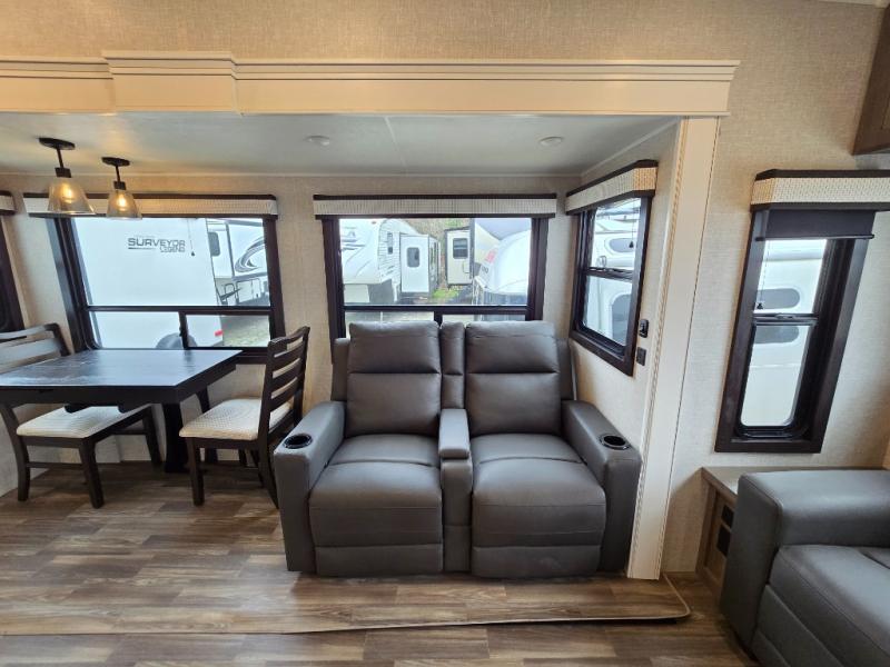 Enjoy a private bedroom suite in this fifth wheel! The king bed is positioned in a slide out for maximum room, and a sliding door leads to the front bath which is full of luxurious features. Enjoy a 30" x 60" shower with a seat. There's a walk-in front closet which has hanging space as well as prep for an optional washer and dryer. An additional wardrobe/linen closet provides some extra space. There's also a half-bath located off the kitchen, and that one has overhead storage also. You'll love the living area with its theater seats, tri-fold sofa, ceiling fan, and entertainment center with fireplace. The kitchen has a four-burner cooktop, center island with sink, 30" microwave oven over the range, and a 16 cu. ft. 12 volt refrigerator - perfect for cooking up great meals!