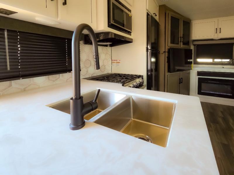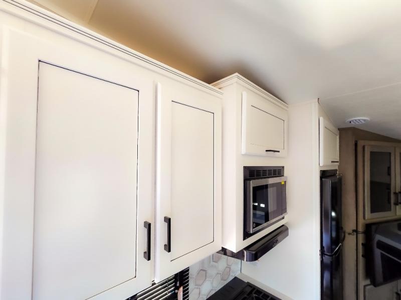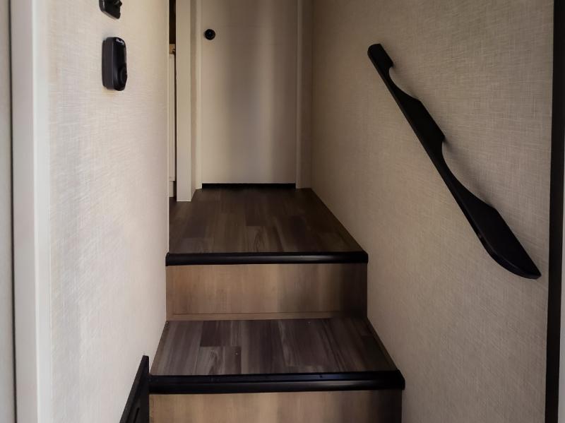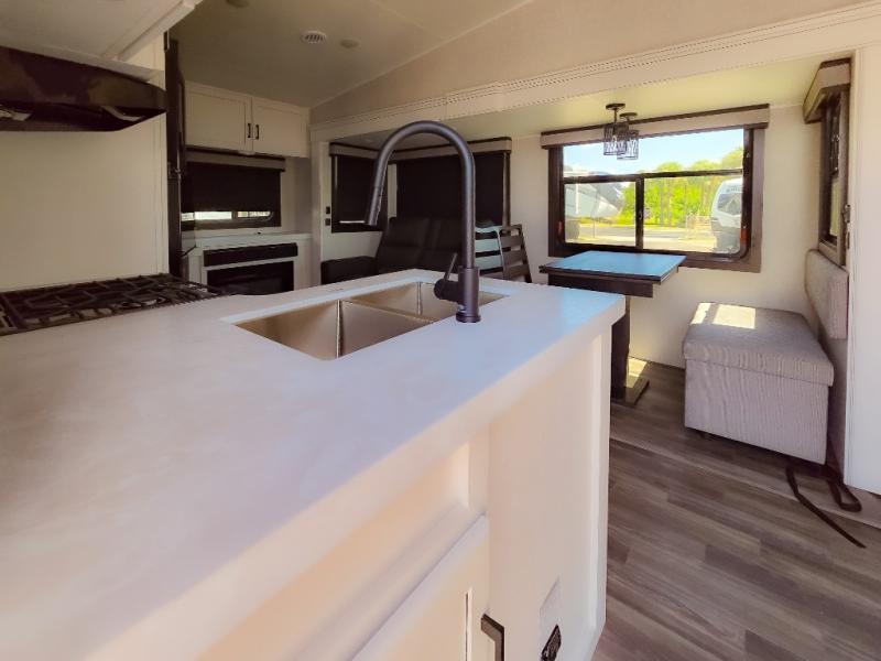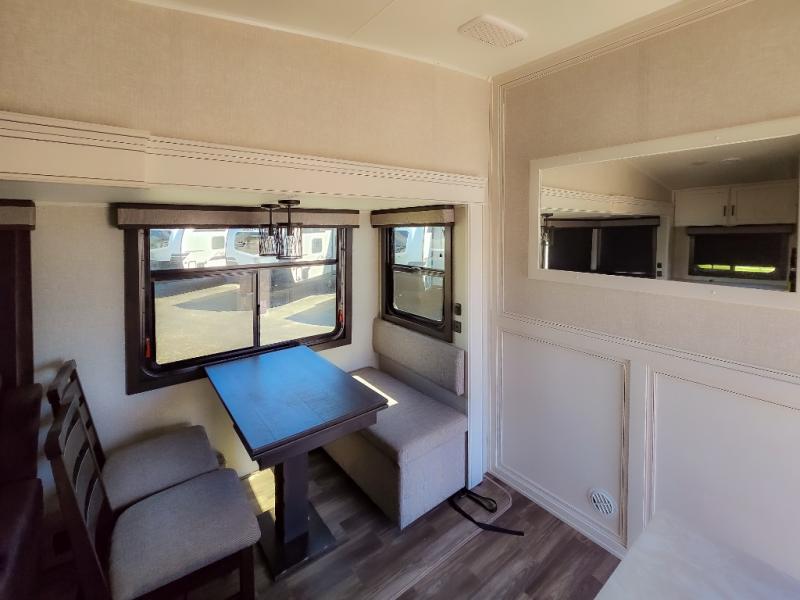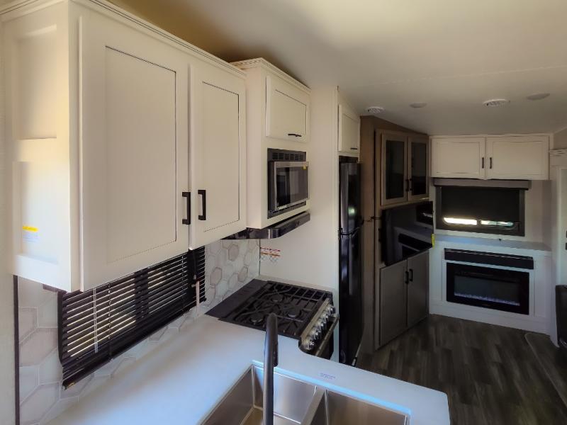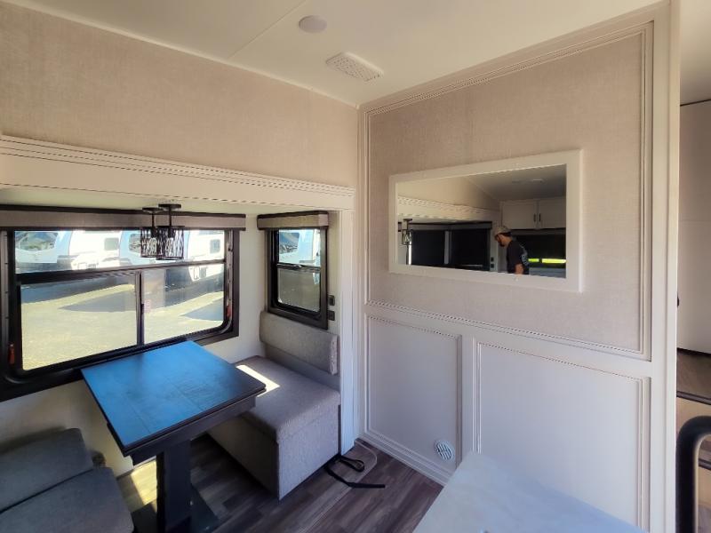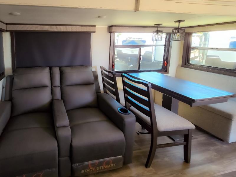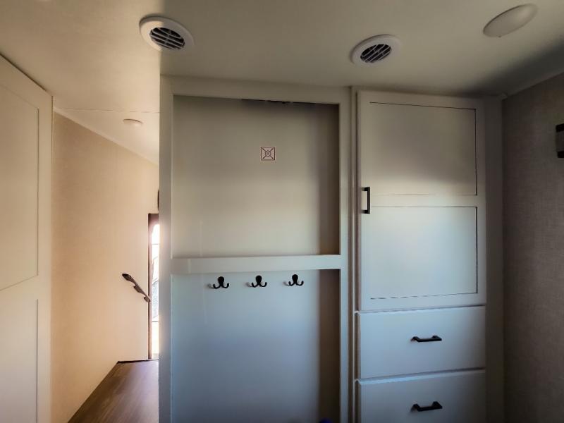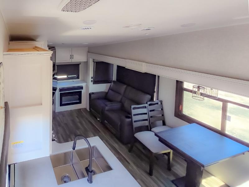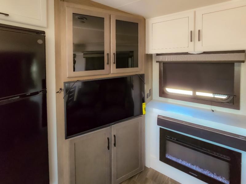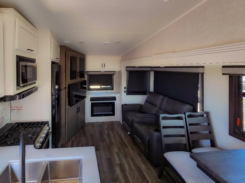 This is the perfect couple's fifth wheel since it features sleeping space for two up front! You can use the dual bedroom wardrobes to store your clothes in, and the full bath is close by so you can get ready each morning. After you've whipped up breakfast in the kitchen, you can dine at the table and chairs with bench seating, then relax with your coffee on the theater seat. There is an entertainment center across from the sofa for convenience, plus a hidden walk-in pantry behind the TV. You might even like to add the fireplace option to make it feel more like home!