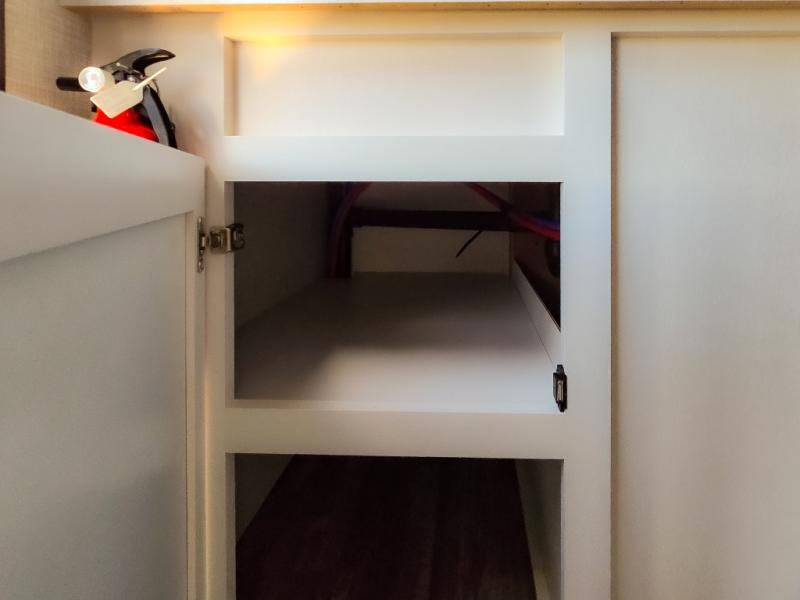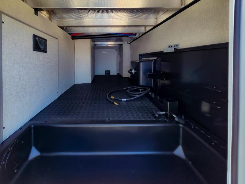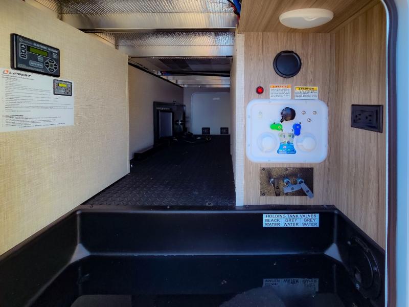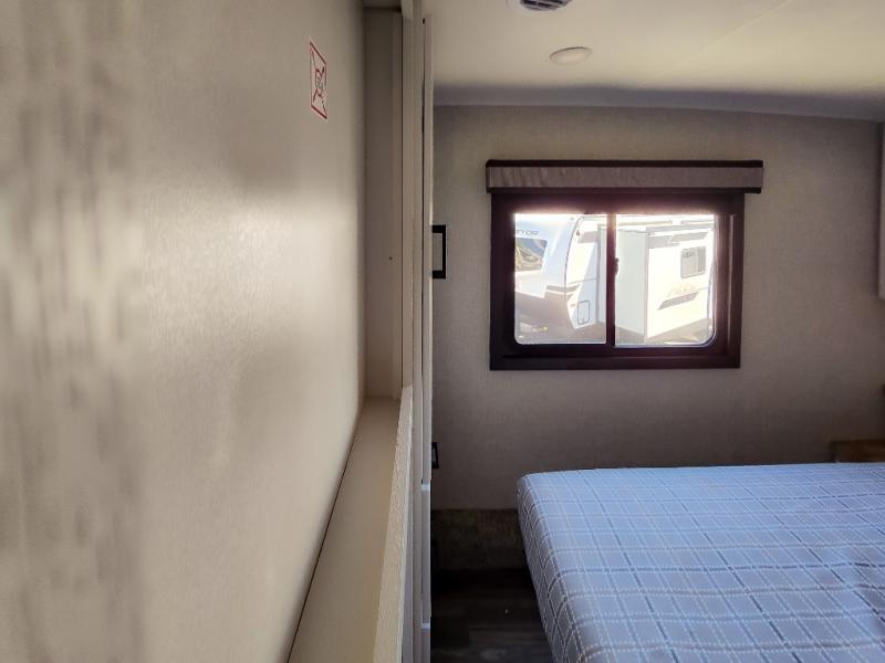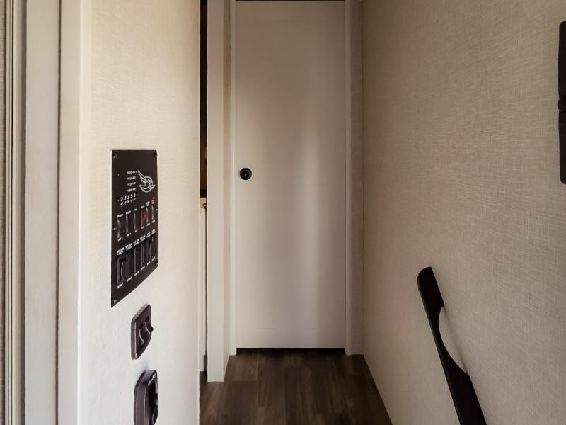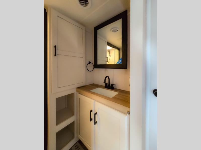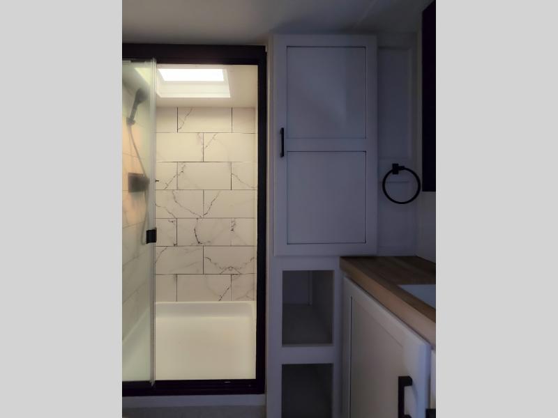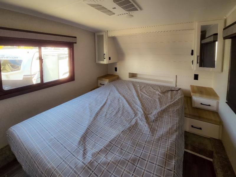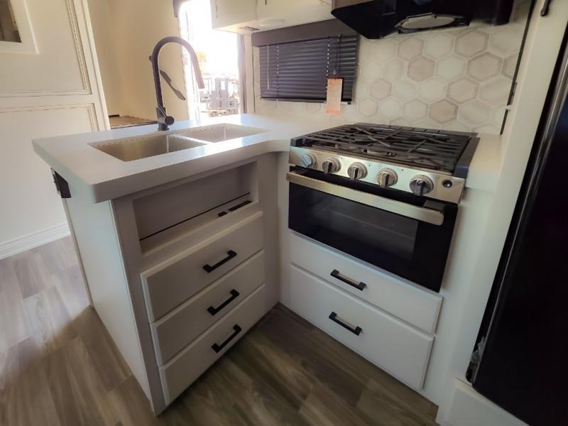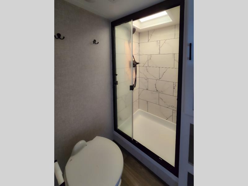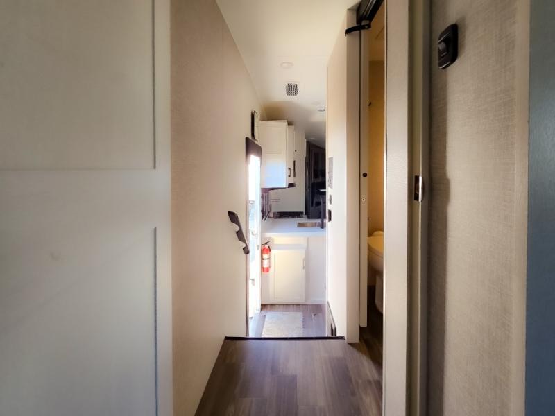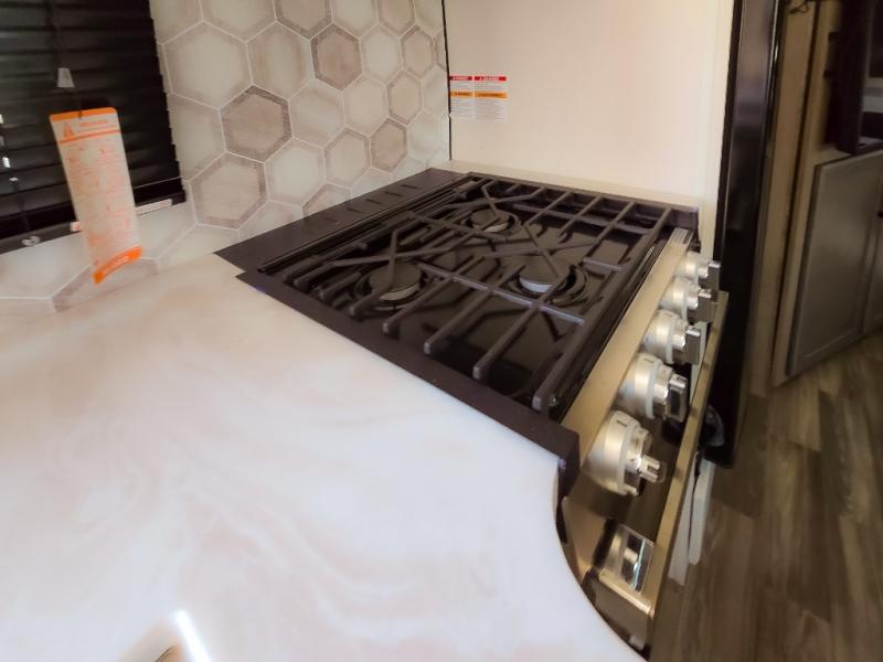 This is the perfect couple's fifth wheel since it features sleeping space for two up front! You can use the dual bedroom wardrobes to store your clothes in, and the full bath is close by so you can get ready each morning. After you've whipped up breakfast in the kitchen, you can dine at the table and chairs with bench seating, then relax with your coffee on the theater seat. There is an entertainment center across from the sofa for convenience, plus a hidden walk-in pantry behind the TV. You might even like to add the fireplace option to make it feel more like home!