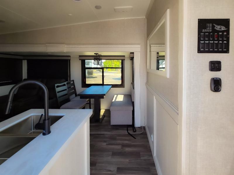 With any Eagle HT fifth wheel by Jayco you will enjoy a smooth drive thanks to the 4 Star Handling Package, Goodyear Endurance tires, and MORryde CRE-3000 rubberized suspension. The Customer Value Package includes amenities that are sure to make camping easier than ever, like the 60K on-demand water heater, Keyed-Alike lock system, electric awning with integrated LED lights, and more. Handcrafted and glazed door/drawer fronts will make your space feel more like home, along with residential vinyl flooring throughout, motion activated LED lights, and blackout roller shades with reflective side throughout to keep the sun out when you want to sleep in. The HELIX Cooling System features Jayco's exclusive insulated dual duct design, directional and closeable A/C vents, and larger return air vents with user friendly filters to keep your crew comfortable all summer long. Choose an entry-level Eagle HT fifth wheel today!