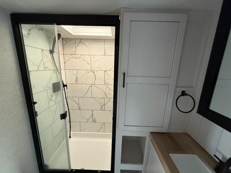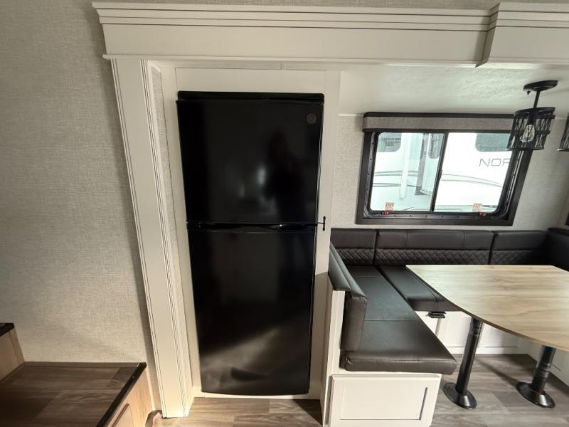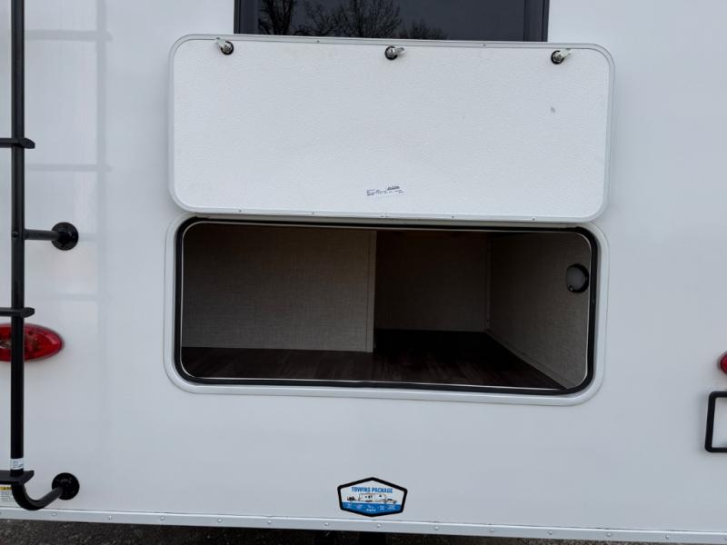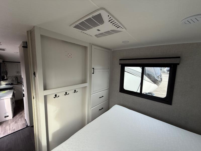If you're needing a fifth wheel with more sleeping space, this unit will be perfect for you! There are double-size bunks in the back with a wardrobe for your guests' things and TV prep if you want to add a TV here. The front private bedroom up front will have you feeling right at home with its queen bed and dual wardrobes, and any additional guests you have can sleep on the U-shaped dinette within the slide out. There is also a theater seat here where you can relax with a good book in the evenings. The Jayport with LP Quick Connect outside will let you add the optional griddle, and the 19' power awning will provide shade during the day!