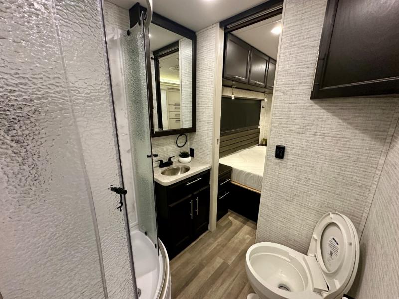 With any Greyhawk Class C gas motorhome by Jayco you will experience smooth sailing thanks to the JRIDE PLUS that comes with Koni shock absorbers, a computer-balanced driveshaft, Hellwig helper springs, and more. The Ford E-450 chassis with a 7.3L V8 325 HP engine will power your excursions, and you'll appreciate the added safety features for your peace of mind. Each model features a Sony infotainment center with Apple CarPlay and Android Auto, backup and side-view cameras, and a tire pressure monitor system the driver is sure to appreciate. Durable construction begins with Stronghold VBL roof, floor and sidewalls, bead-foam insulation, and a one-piece seamless fiberglass front cap. Head inside to find blackout night roller shades, LED-lit pressed countertops, an 84" interior ceiling height, and hardwood cabinet doors and drawers.