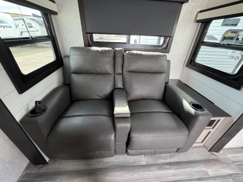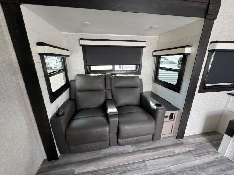 This travel trailer offers a lot of possibilities! During the day, relax in the spacious front living area with a jackknife sofa plus a pair of theater seats, both positioned for a great view of the entertainment center. A fully equipped kitchen with dual sinks, microwave, and three-burner range makes meals easy, and the theater seats have swing-out trays for you to dine. At night, pull down the 60" x 75" Murphy bed for a great night's sleep! wardrobes on either side of the bed provide plenty of storage for your clothing. The rear corner bath is convenient and private, and offers a linen closet plus a medicine cabinet for additional storage capability. Outside you will be sheltered from the sun beneath the 15' awning, and there is an exterior griddle for pancakes in the morning!
