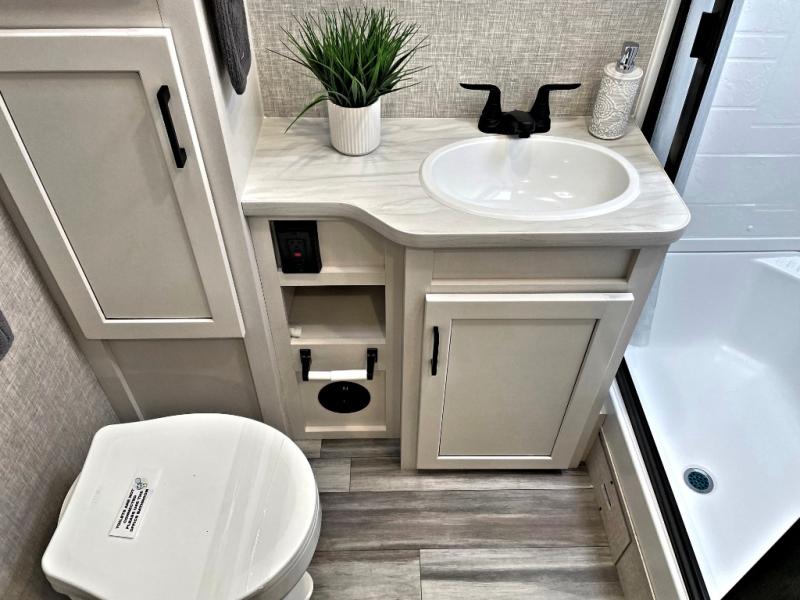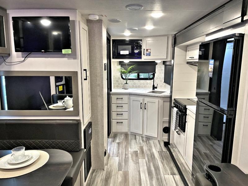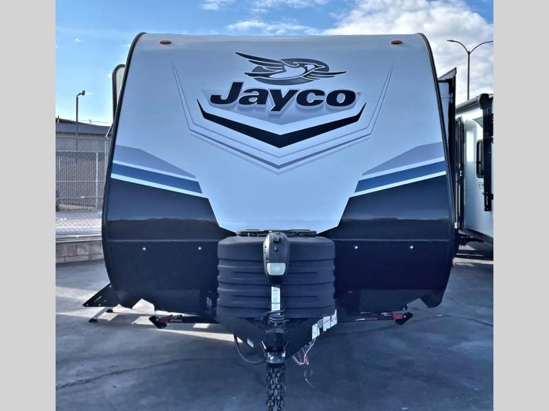 With any Jay Feather travel trailer by Jayco, you will enjoy lightweight towing, convenient exterior amenities, and at-home comforts inside! The Overlander 1 Solar Package included within the Jay Sport Package comes with a 200W solar panel and a 30-amp digital controller so you can enjoy some off-grid camping. There is also a modern graphics package with a dual-colored sidewall, LCI Solid Step fold-down aluminum tread steps on the main entry door, and Climate Shield 0 -100° F tested weather insulation package that will allow you to camp in all sorts of climates. The Customer Value Package will make time outdoors easier than ever with an outside shower, a power tongue jack and a Rock Solid stabilizer system, plus American-made nitro-filled Goodyear tires with self-adjusting electric brakes. More exterior features include a Keyed-Alike locking system, marine grade exterior speakers with blue LED accent lighting, a Magnum Truss roof system, and the list goes on! And we haven't even touched on the interior comforts, like the residential style kitchen countertops and vinyl flooring throughout, decorative backsplash, handcrafted hardwood door/drawer fronts, and multiple USB charging ports to keep you going!