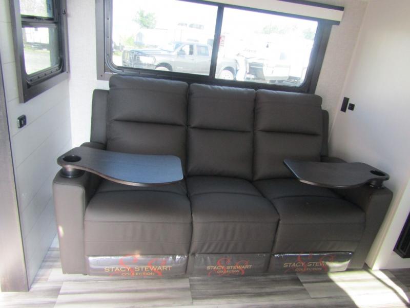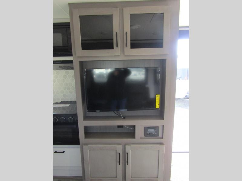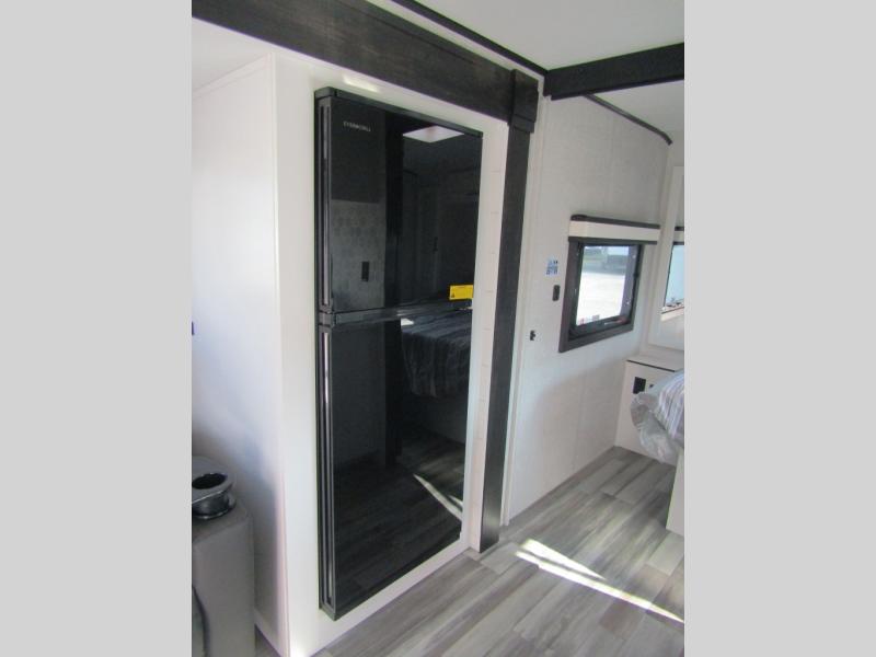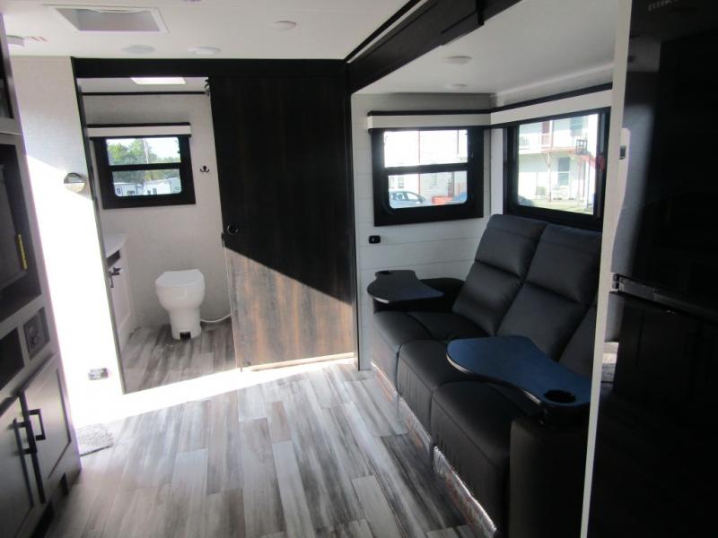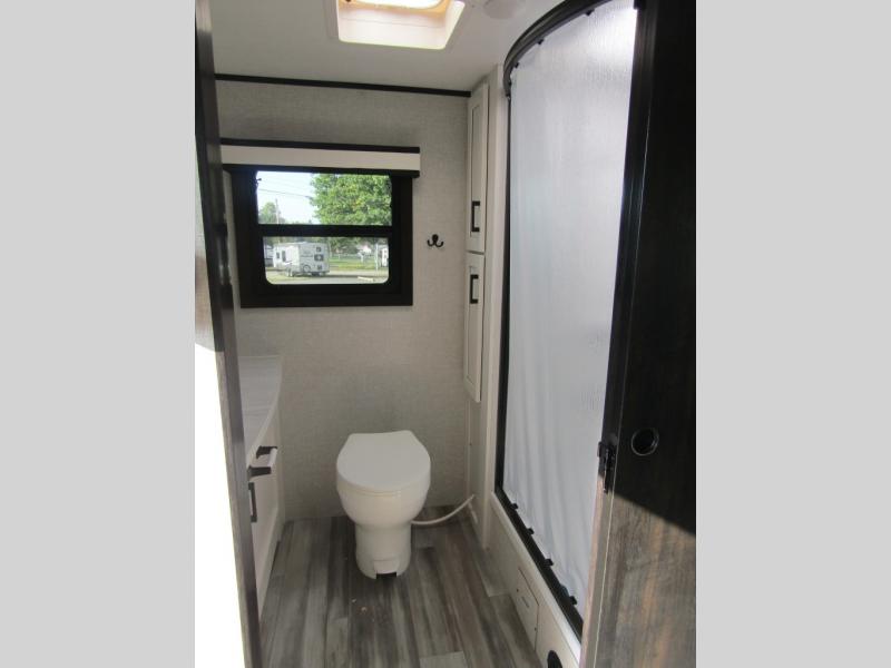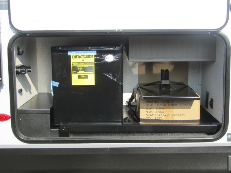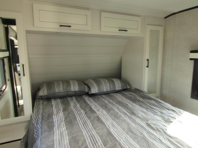 Whether you are a couple or a larger group, this trailer offers a spacious main living and kitchen area as well as rear bathroom for privacy. You will also find linen storage and ample counter space for toiletries. The space saving door even gives you more floor space in both the bathroom and the main area. The single slide holds the U-shaped dinette and 10 cu. ft. 12V refrigerator for even more floor space, the L-shaped kitchen area allows the cook their own space to make meals, and the walk-in pantry provides perfect for extra goodies on those longer camping trips. The front private bedroom provides privacy as well with its own space saving door, and you can sleep like royalty with a queen bed at night.