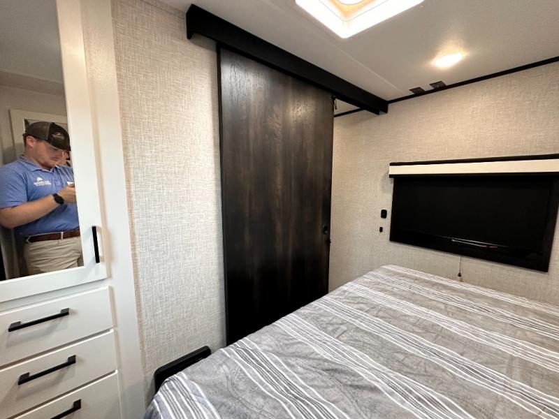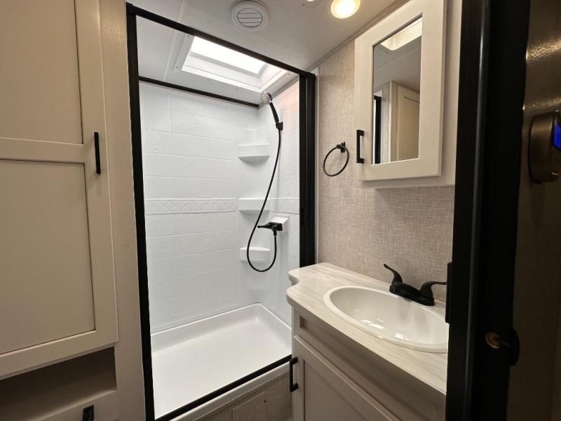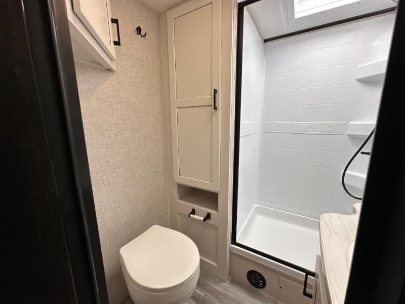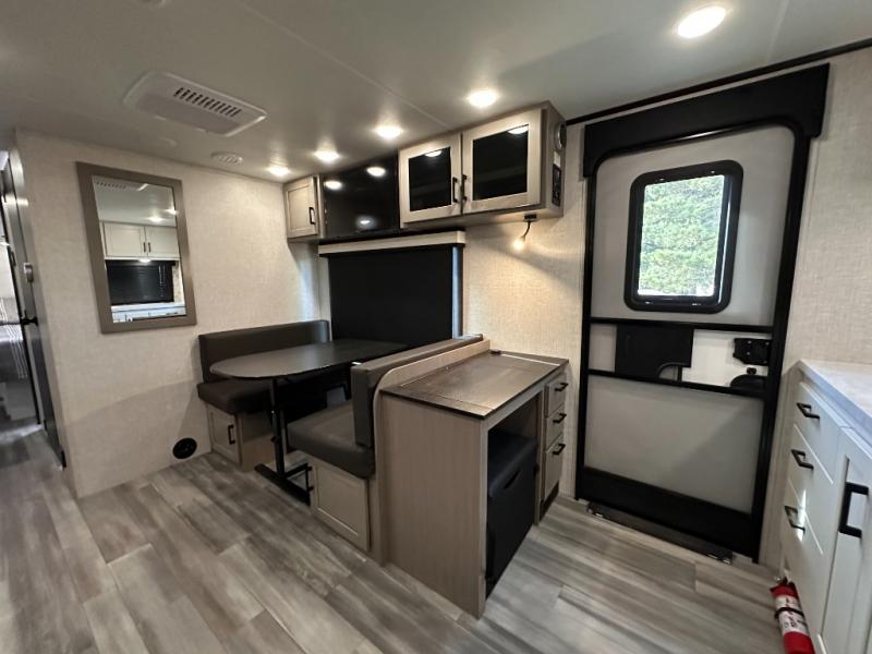 The chef of your group will love this rear kitchen trailer with generous counter space to prep meals plus an exterior griddle for breakfast outdoors! Your crew can dine at the booth dinette or under the 20' power awning with LED lights, and when you're ready to relax, the theater seat with table trays will provide comfort. There is also a storage/desk cabinet with a pull-out ottoman that will allow you to utilize this space however you need it! The spacious full bath will let you clean up each day, and the front private bedroom is sure to make you feel at home. Here, you'll find a queen bed, three wardrobes, plus one of the dual entry doors for added convenience!
