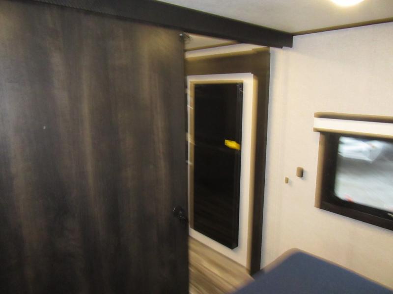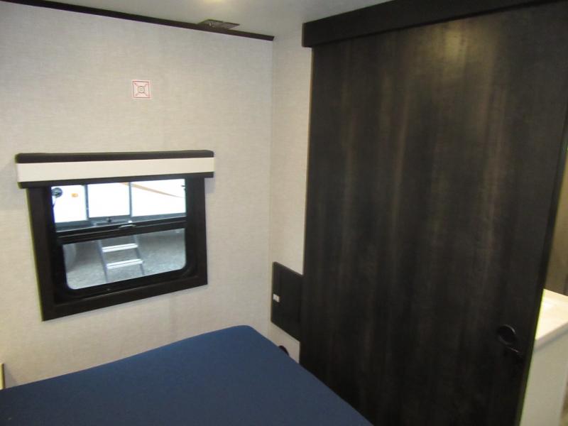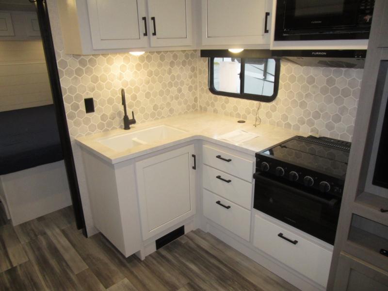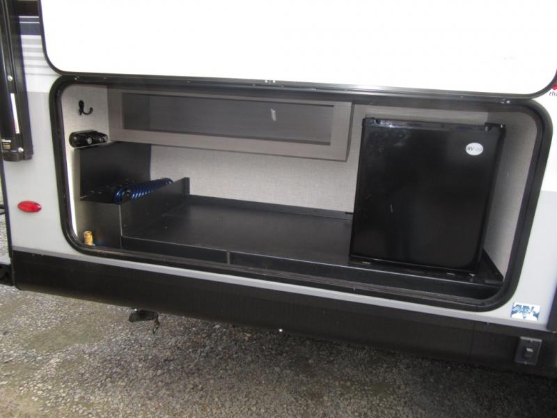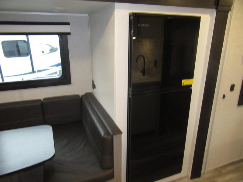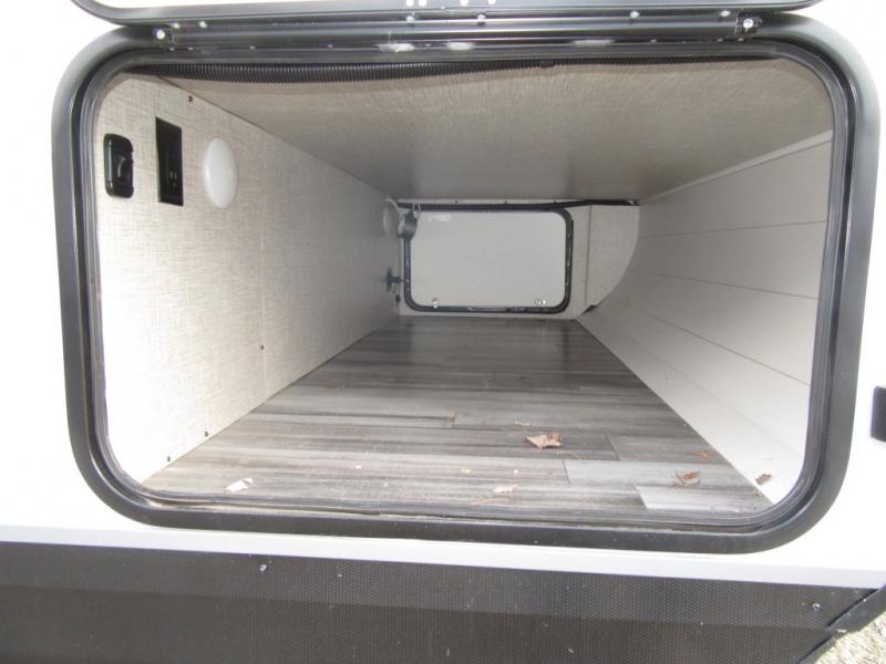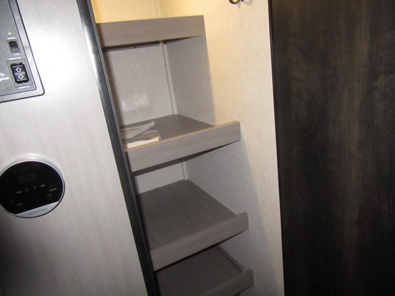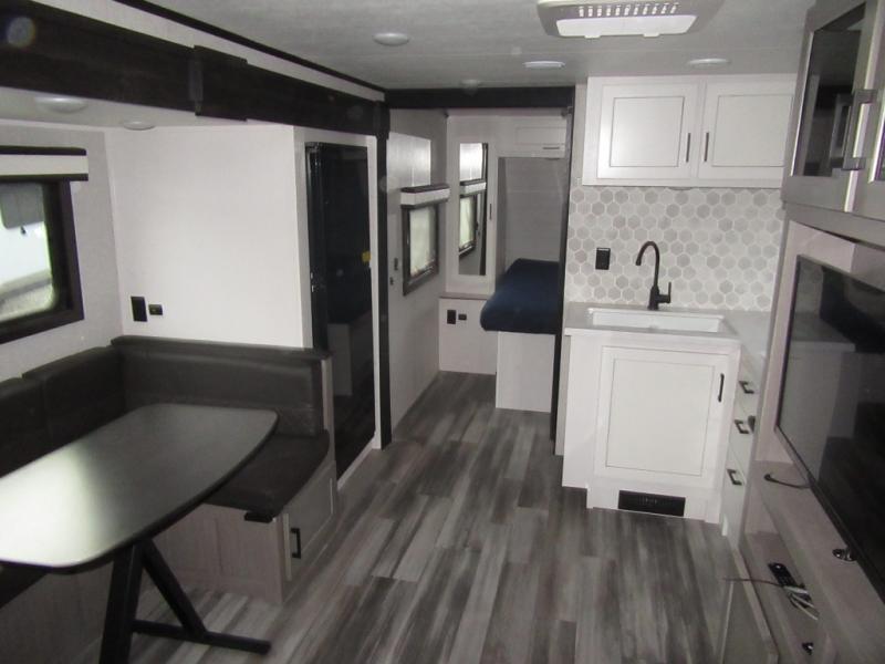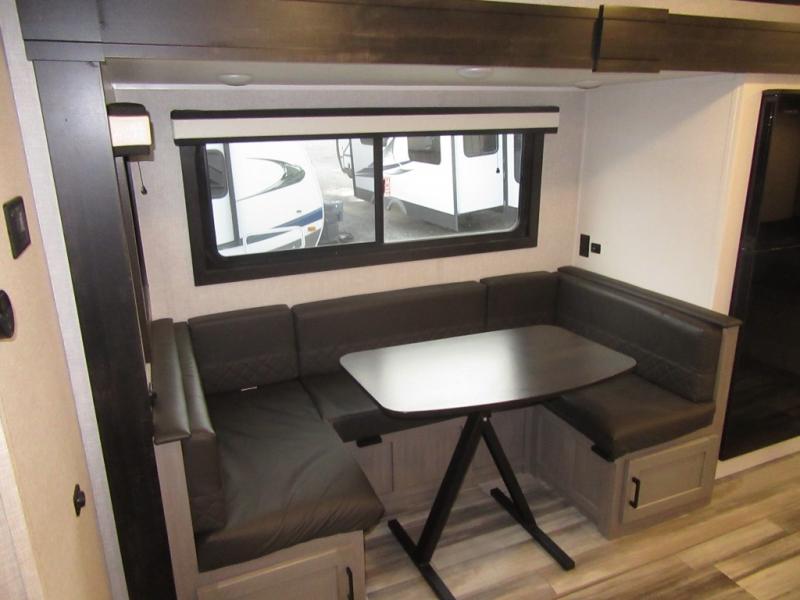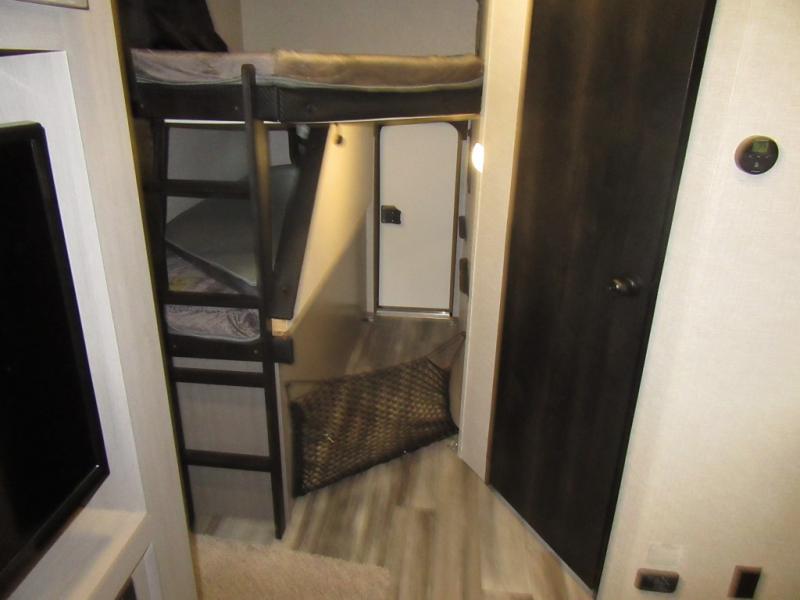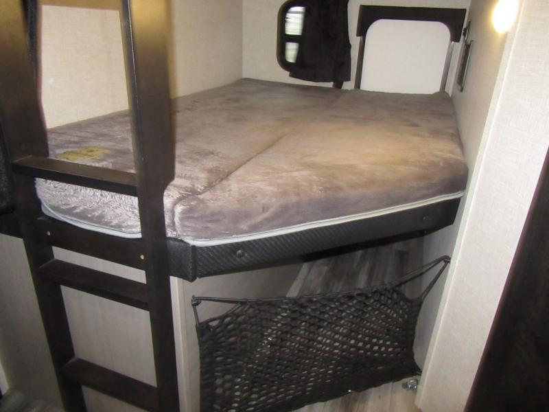 There is so much to love about this trailer from the double-size bunks in the rear with a ladder for easy access, plus the cargo door that allows you to stow larger items from the exterior to the interior underneath the bunks. You also have exterior storage compartments for outdoor gear. And the cook can choose to make meals using the outside kitchen including a refrigerator to store some cold items or the inside kitchen with full amenities including a 10 cu. ft. 12V refrigerator and ample counter space. The walk-in pantry is a nice feature as well especially when you have a big crew. There is a private bedroom up front with a queen bed and dual wardrobes for your things, and any other guests can sleep on the U-shaped dinette in the main living area!
