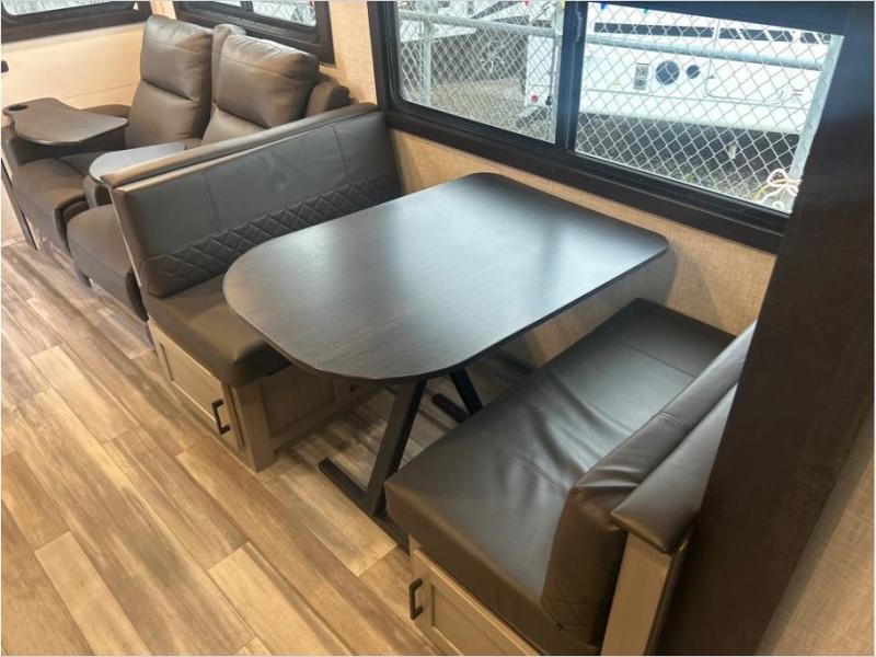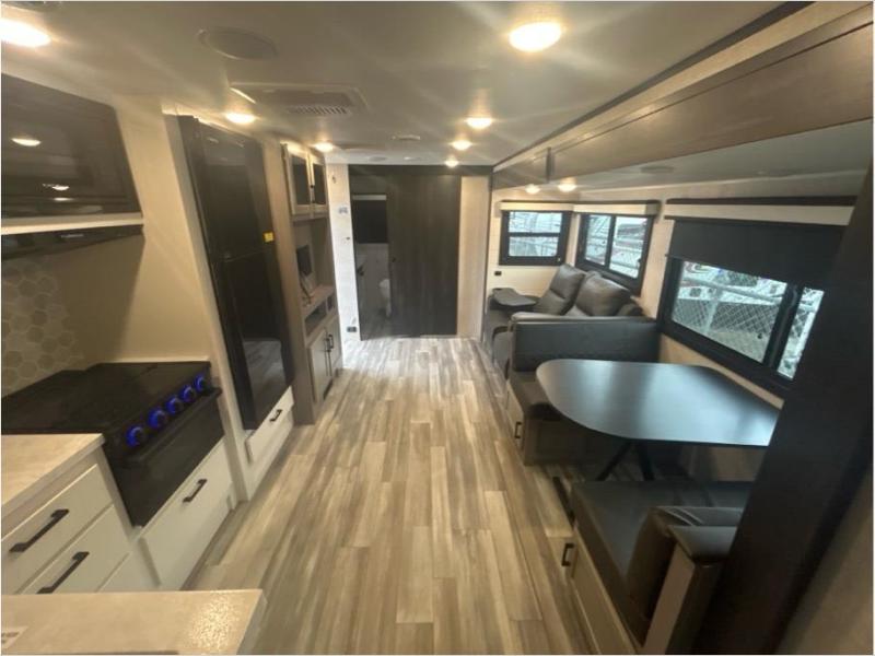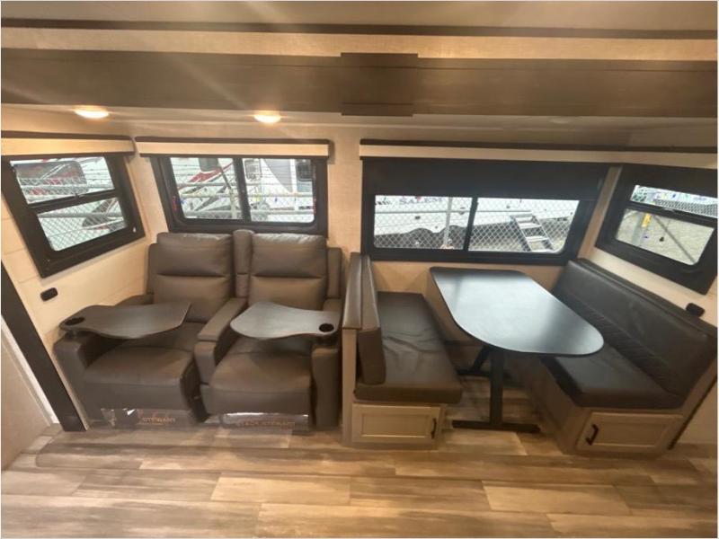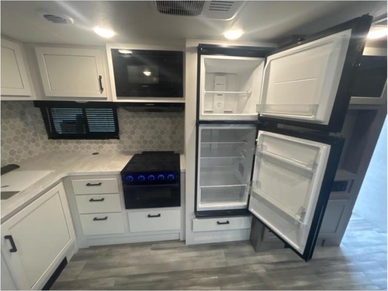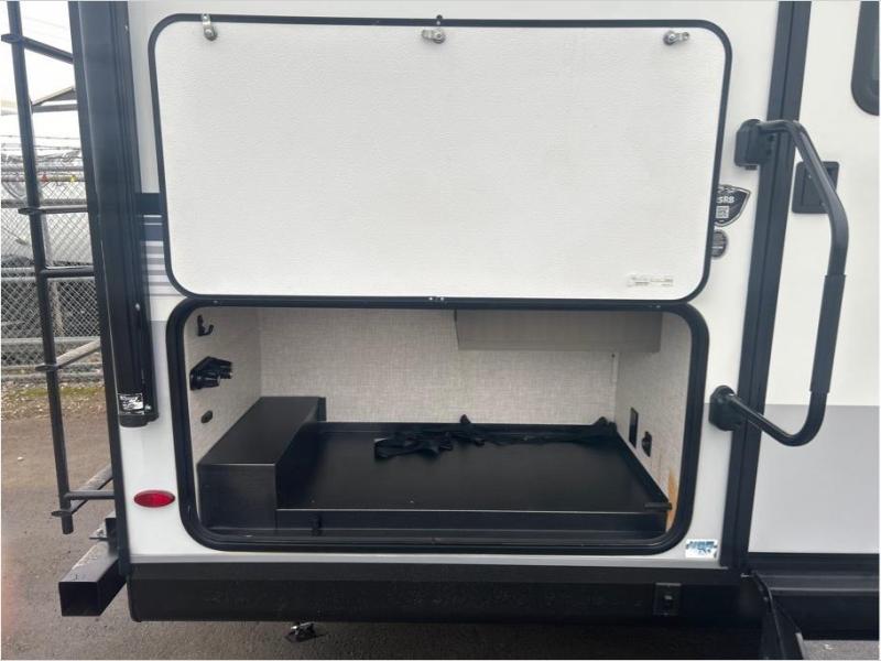 This travel trailer with a full rear bath is sure to bring you comfort wherever you camp. The front private bedroom with queen bed and dual wardrobes will have you feeling right at home. You can enjoy home cooked meals while at the campsite thanks to the three burner cooktop and 10 cu. ft. 12V refrigerator, plus there is a walk-in pantry to store all of your favorite snacks. The jackknife sofa and booth dinette within the slide out offer comfortable places to relax, yet you can switch the jackknife sofa out for the optional tri-fold sofa or the optional theater seating. You can even cook breakfast outdoors using the outside kitchen and stay protected from the elements by the 19' power awning!
