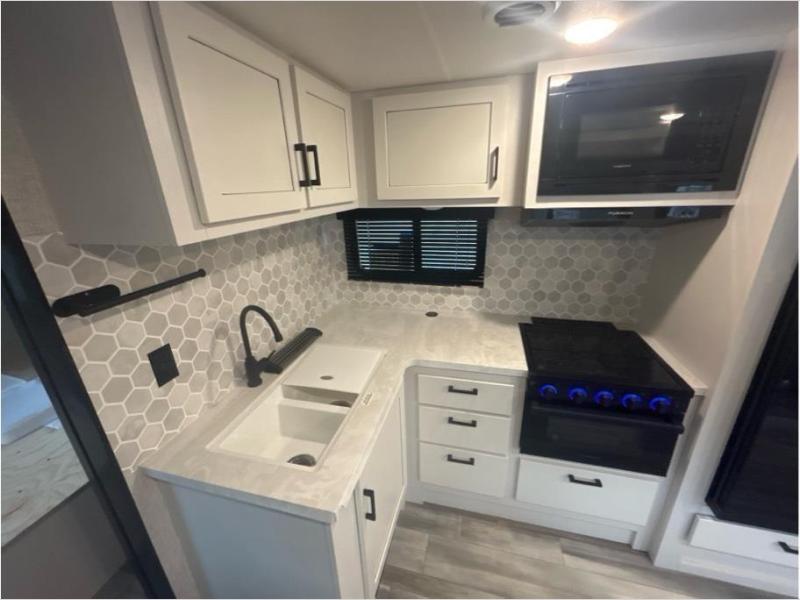 With any Jay Feather travel trailer by Jayco, you will enjoy lightweight towing, convenient exterior amenities, and at-home comforts inside! The Overlander 1 Solar Package included within the Jay Sport Package comes with a 200W solar panel and a 30-amp digital controller so you can enjoy some off-grid camping. There is also a modern graphics package with a dual-colored sidewall, LCI Solid Step fold-down aluminum tread steps on the main entry door, and Climate Shield 0 -100° F tested weather insulation package that will allow you to camp in all sorts of climates. The Customer Value Package will make time outdoors easier than ever with an outside shower, a power tongue jack and a Rock Solid stabilizer system, plus American-made nitro-filled Goodyear tires with self-adjusting electric brakes. More exterior features include a Keyed-Alike locking system, marine grade exterior speakers with blue LED accent lighting, a Magnum Truss roof system, and the list goes on! And we haven't even touched on the interior comforts, like the residential style kitchen countertops and vinyl flooring throughout, decorative backsplash, handcrafted hardwood door/drawer fronts, and multiple USB charging ports to keep you going!