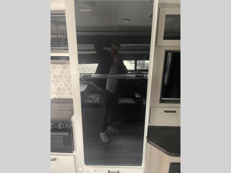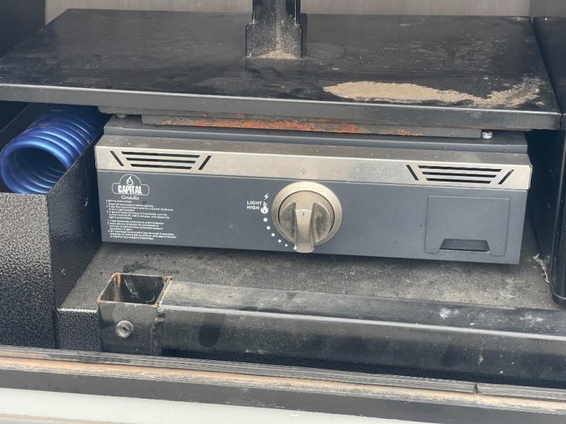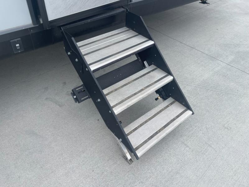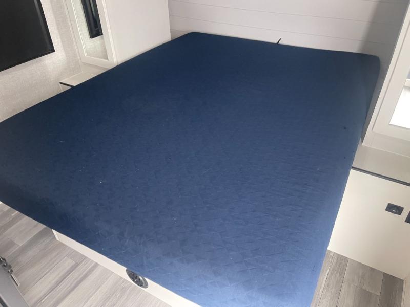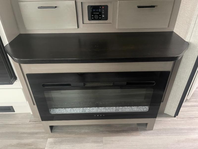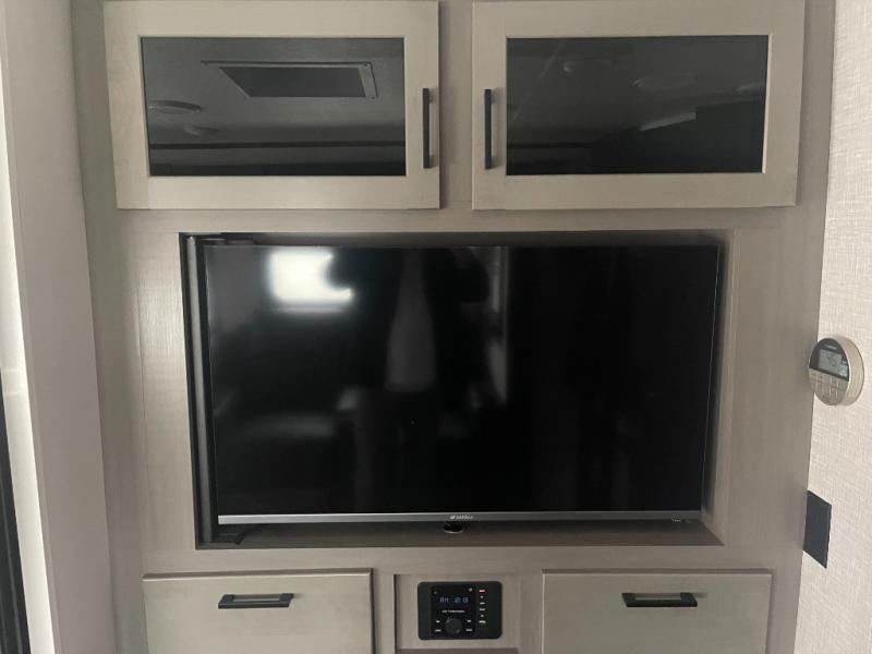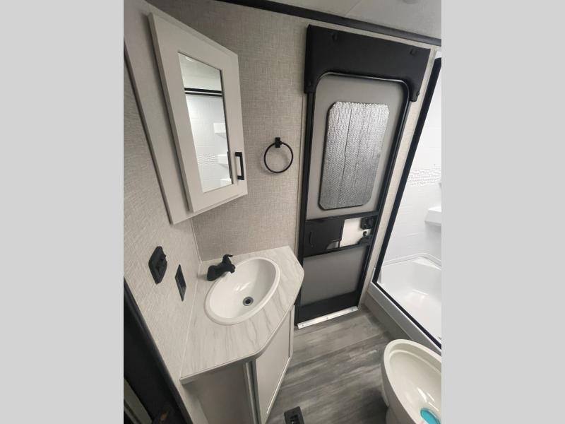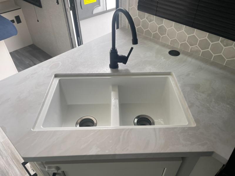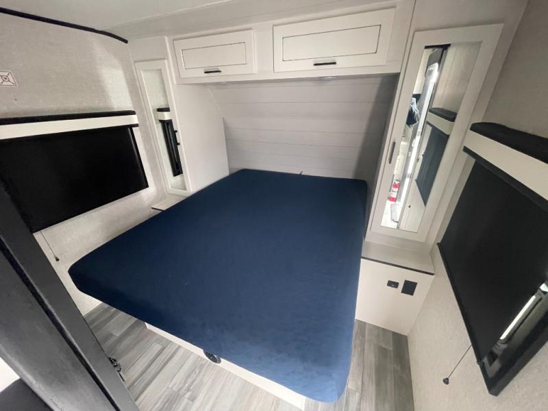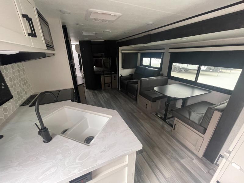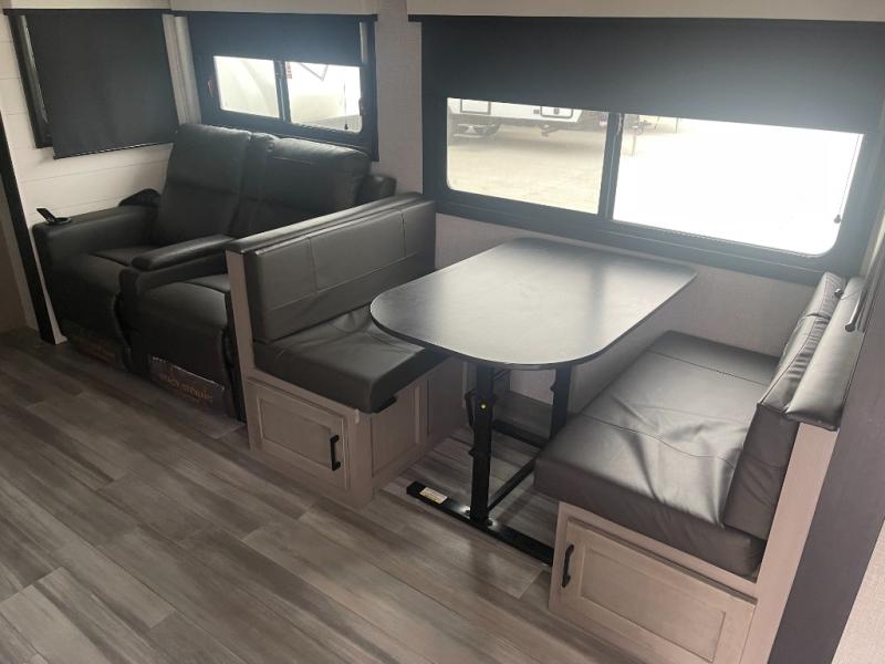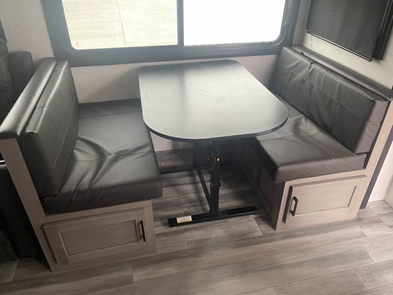 Get out and experience new campgrounds with this spacious trailer that offers a slide out jack knife sofa and booth dinette giving you dining, relaxing and sleeping space as well as more interior floor space to move from the front to the back. And having the second exterior entry/exit to the full bathroom is convenient for all. The cook will love the choice of making meals inside with full amenities or on the outside kitchen when relaxing under the 21' power awning with LED lights. And the front bedroom gives you a queen bed, dual wardrobes and windows for great views when inside.