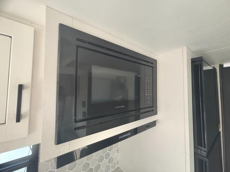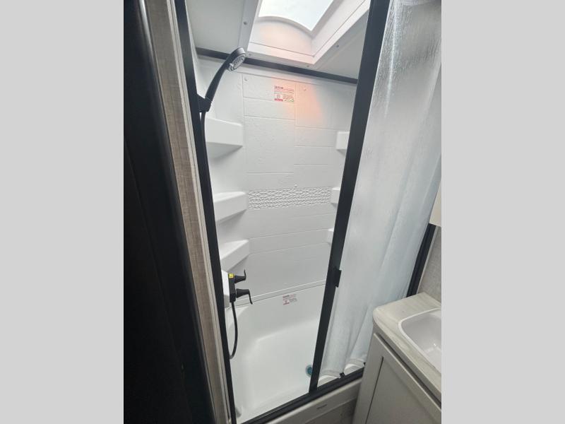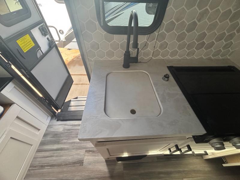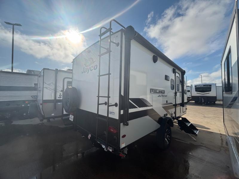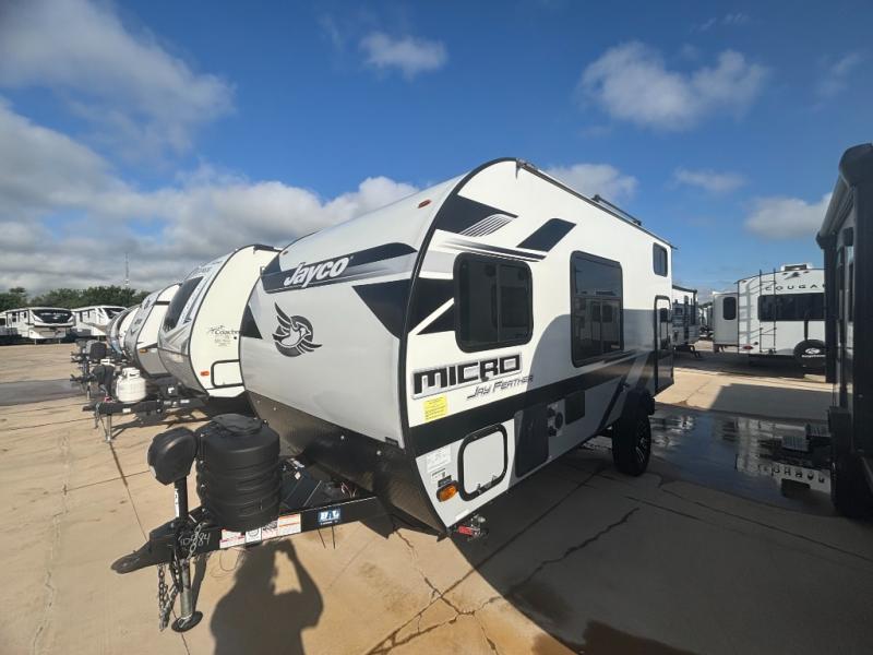Jayco's lightest travel trailer, the Jay Feather Micro is ready for adventure at the drop of a hat! The Climate Shield weather protection will let you camp well into the colder months and the Stronghold VBL with double-sized Azdel is ultra durable. The Jay Pro Package includes 16-inch American-made Goodyear off-road tires with self-adjusting brakes, a rear-mounted roof ladder, and the Overlander 1 Solar Package with a 200W solar panel. Additional exterior features include marine grade exterior speakers with blue LED accent lighting, a swing-out entry door assist handle, a power tongue jack, and more! Inside, you will love the 4-inch high-density dinette cushions with vinyl backing for easy cleaning, along with the handcrafted hardwood door/drawer fronts, residential style kitchen countertops, and decorative roller shades with a reflective barrier for better insulation.
