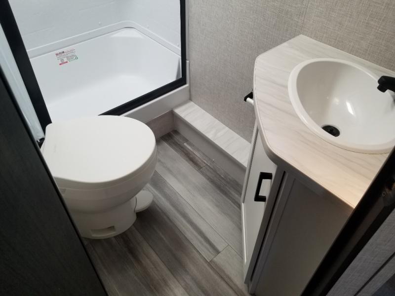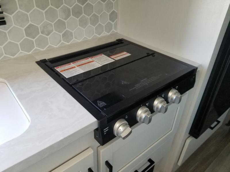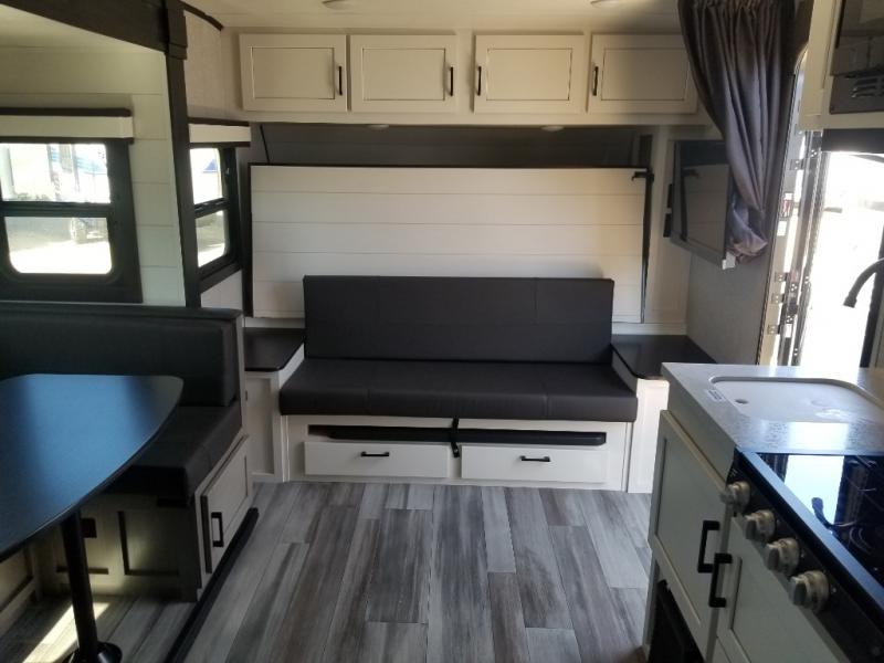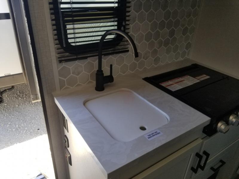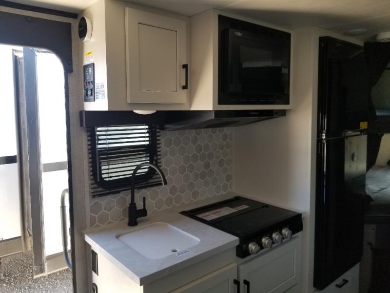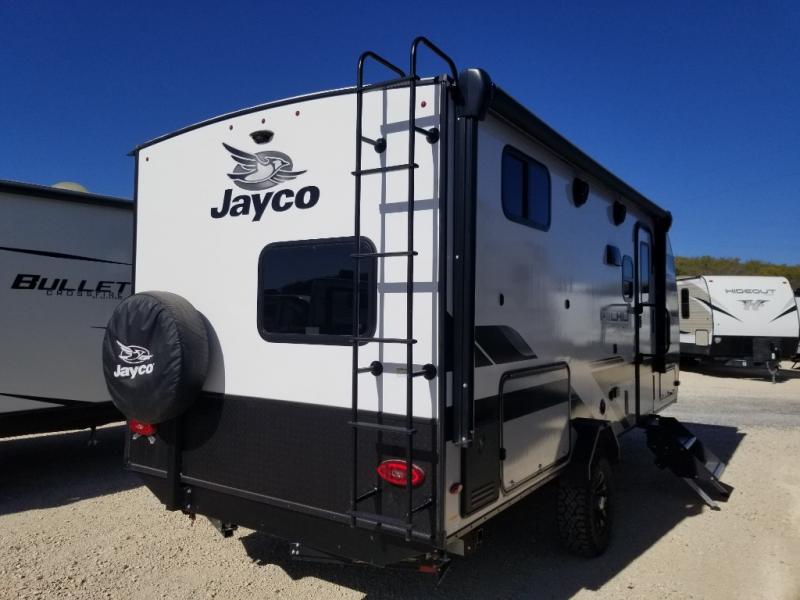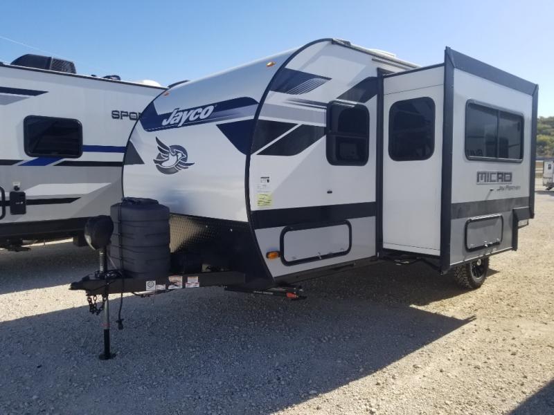Jayco's lightest travel trailer, the Jay Feather Micro is ready for adventure at the drop of a hat! The Climate Shield weather protection will let you camp well into the colder months and the Stronghold VBL with double-sized Azdel is ultra durable. The Jay Pro Package includes 16-inch American-made Goodyear off-road tires with self-adjusting brakes, a rear-mounted roof ladder, and the Overlander 1 Solar Package with a 200W solar panel. Additional exterior features include marine grade exterior speakers with blue LED accent lighting, a swing-out entry door assist handle, a power tongue jack, and more! Inside, you will love the 4-inch high-density dinette cushions with vinyl backing for easy cleaning, along with the handcrafted hardwood door/drawer fronts, residential style kitchen countertops, and decorative roller shades with a reflective barrier for better insulation.