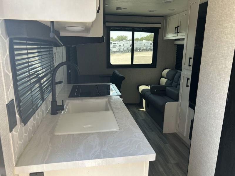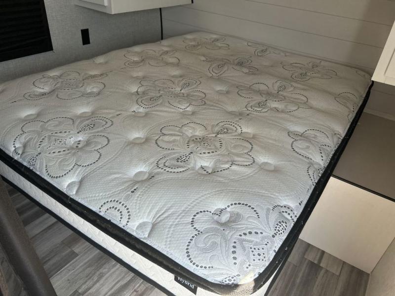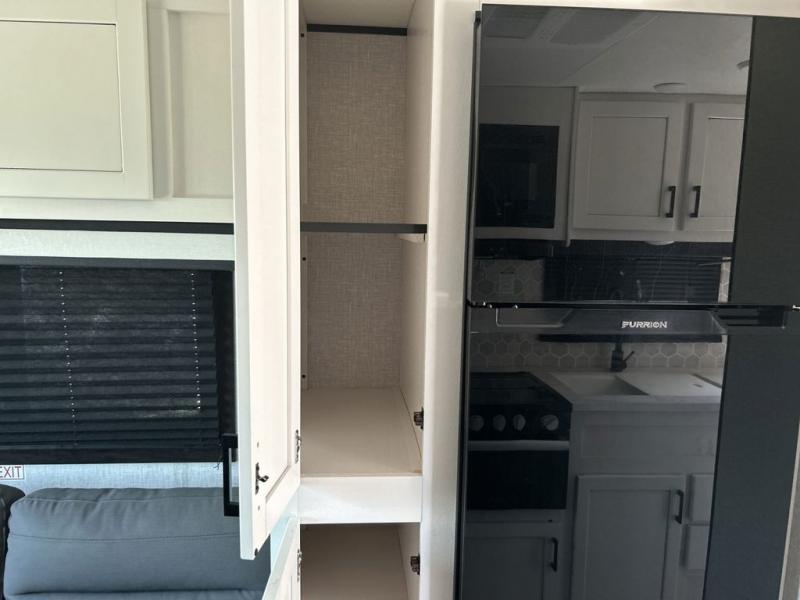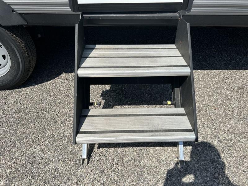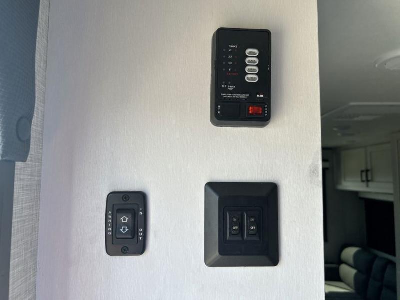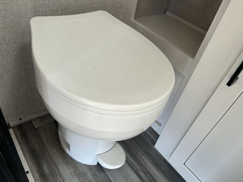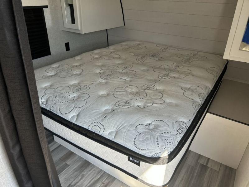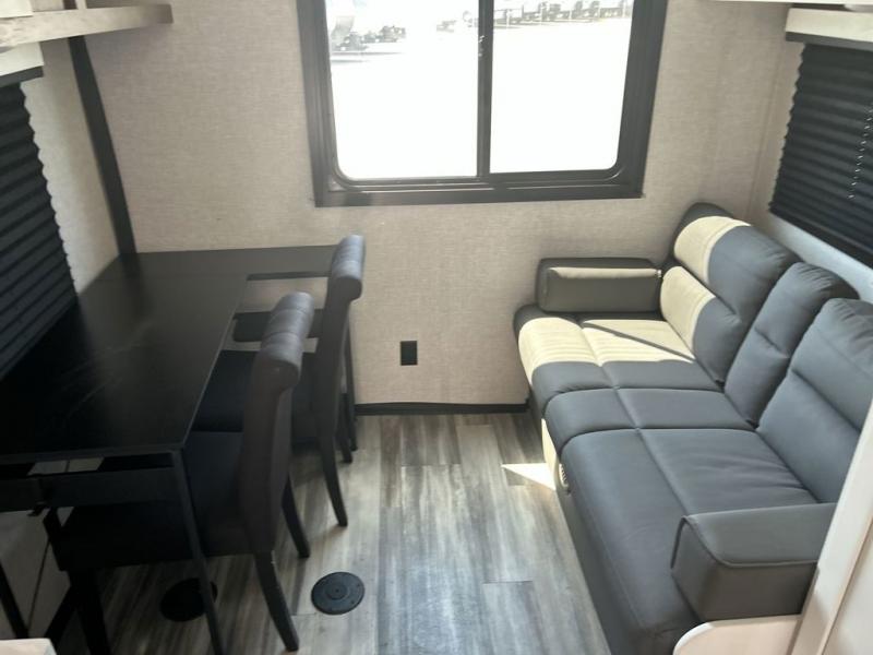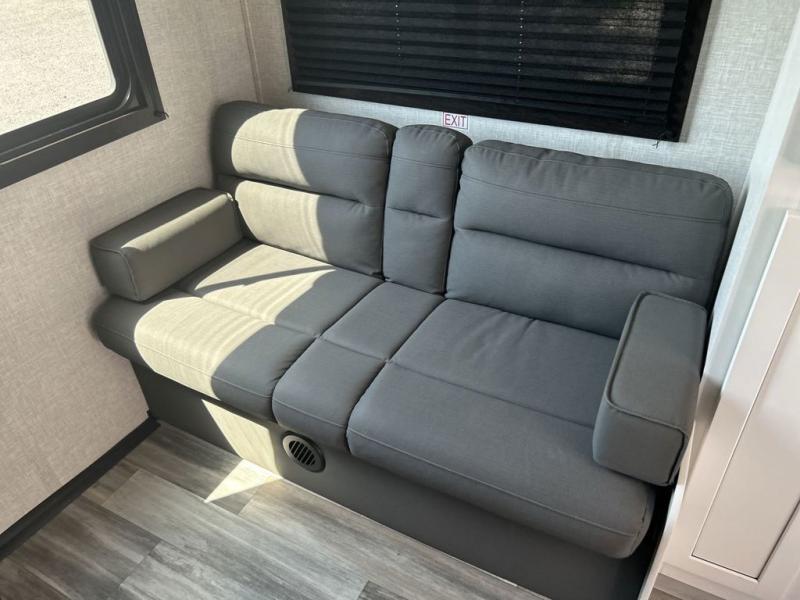 Looking for a couples trailer or a manageable RV that will sleep four when you utilize the furniture as sleeping space? Look no further to find a queen bed up front for two, and the jackknife sofa plus the booth dinette provide sleeping space for two more. The cook will enjoy making meals with everything nearby to keep everyone fed, plus the refrigerator and pantry offer food storage. Everyone can get cleaned up in the full bathroom either in the morning or before bedtime, and the bathroom will come in handy during those night time trips. The outside offers a 16' power awning to relax under as you plan your activities, and there is storage for camping games, charcoal and such along the exterior.