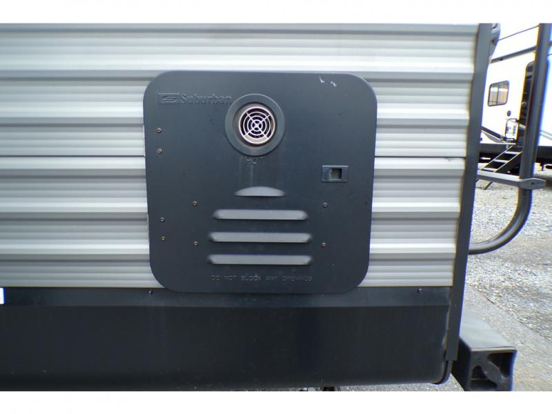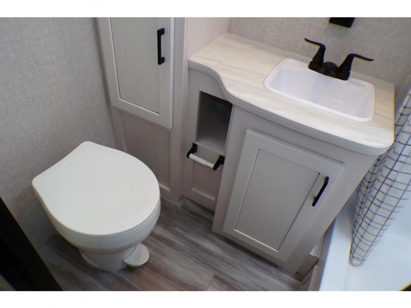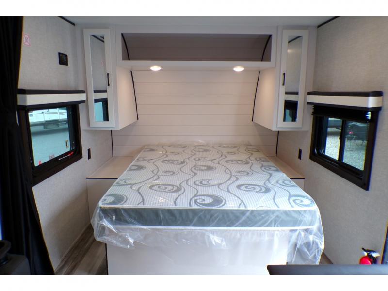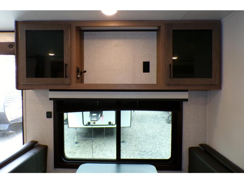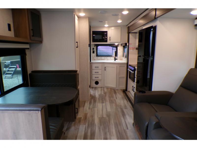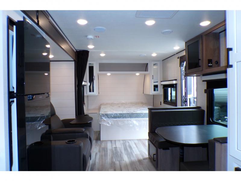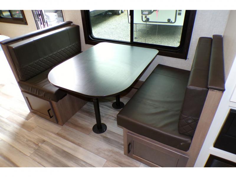 You will have a comfortable camping trip in this travel trailer! It offers full kitchen amenities including a pantry for snacks and such, plus a full rear corner bathroom for privacy and includes a shower. When you need a break, the semi-private bedroom up front offers a queen bed, dual wardrobes and a curtain to close, and the booth dinette can transform into a sleeping space as well. There is a 18' power awning with LED lights for you to enjoy this outdoor space into the night, plus exterior storage for your outdoor games and gear.