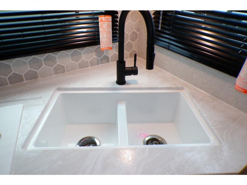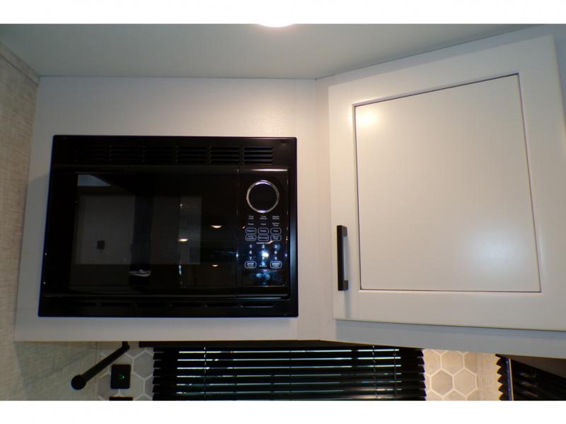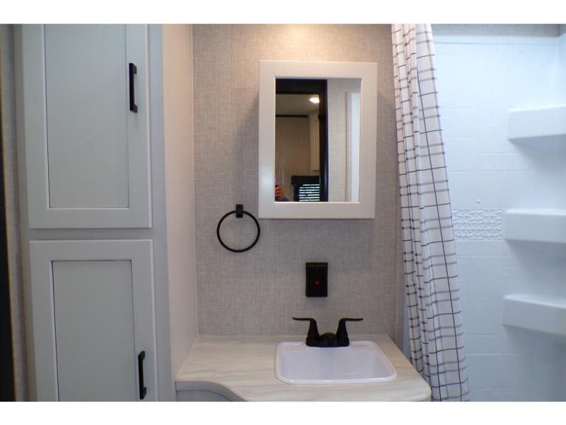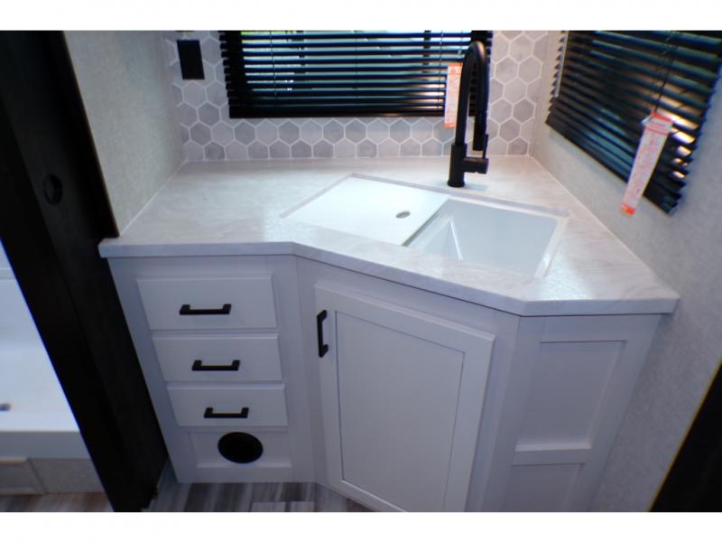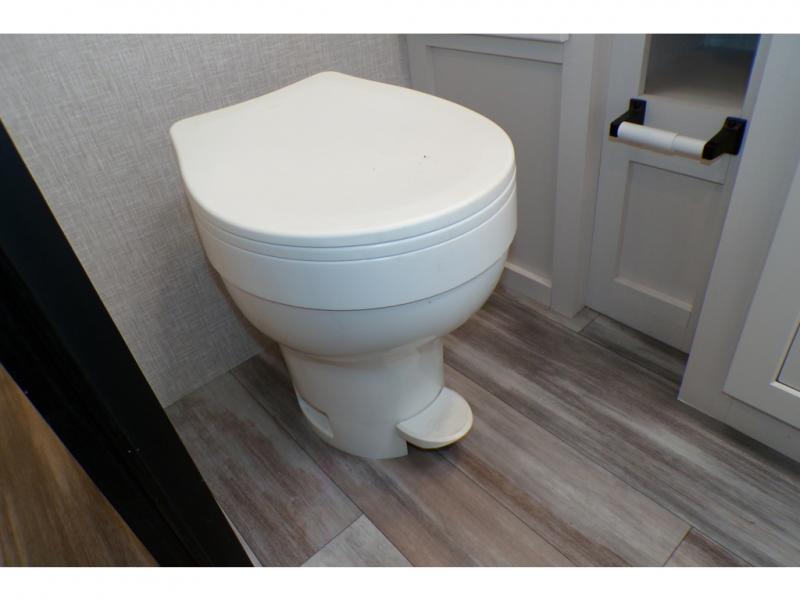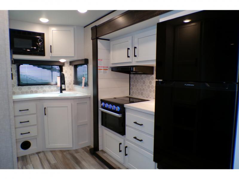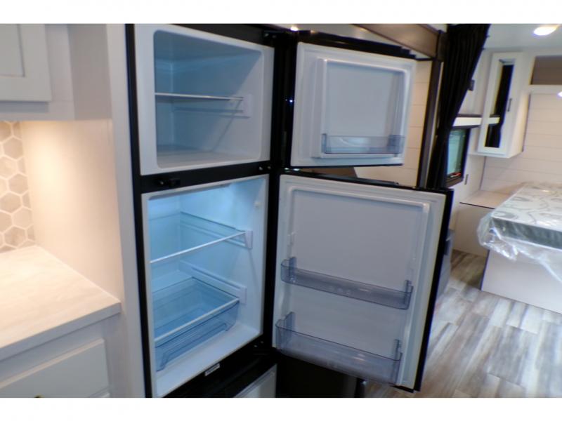 You will have a comfortable camping trip in this travel trailer! It offers full kitchen amenities including a pantry for snacks and such, plus a full rear corner bathroom for privacy and includes a shower. When you need a break, the semi-private bedroom up front offers a queen bed, dual wardrobes and a curtain to close, and the booth dinette can transform into a sleeping space as well. There is a 18' power awning with LED lights for you to enjoy this outdoor space into the night, plus exterior storage for your outdoor games and gear.