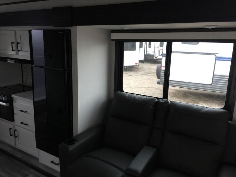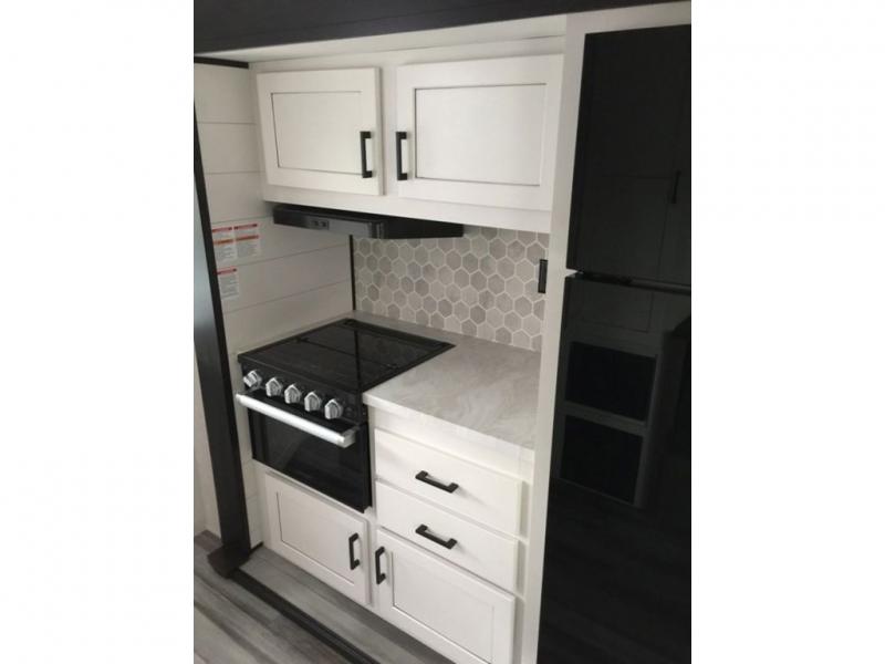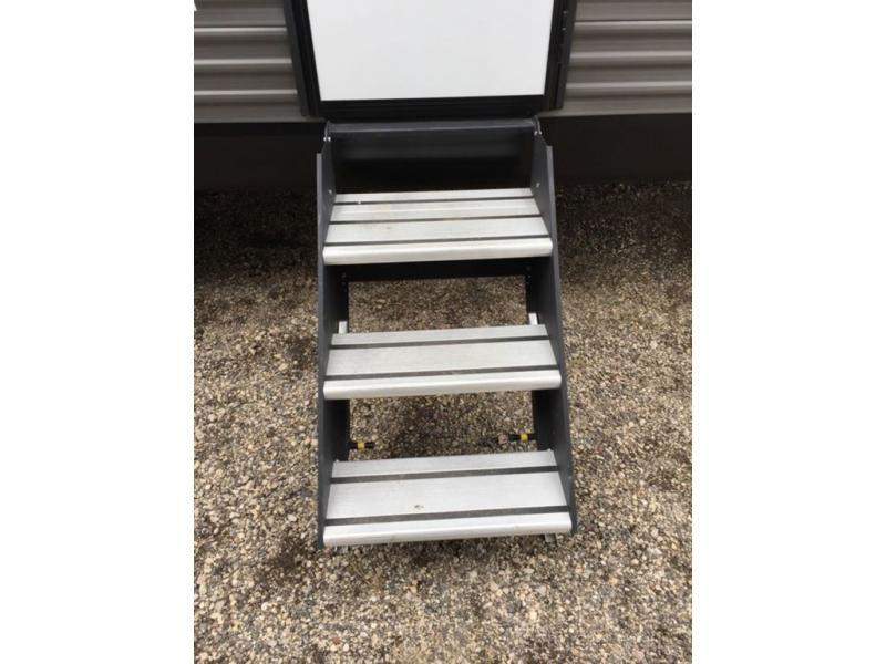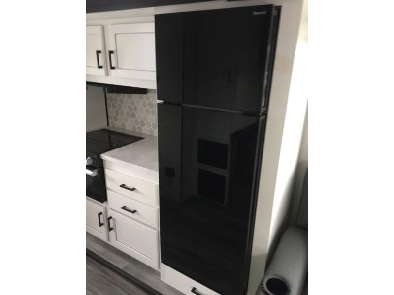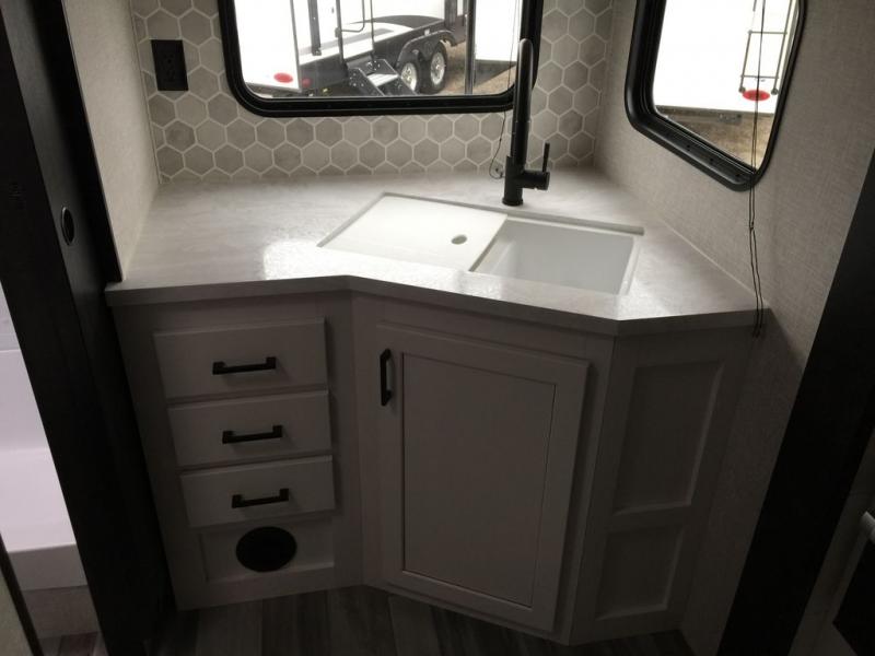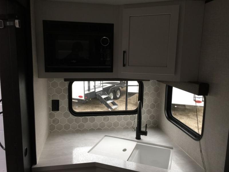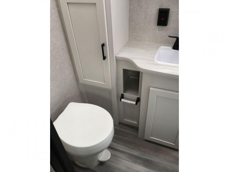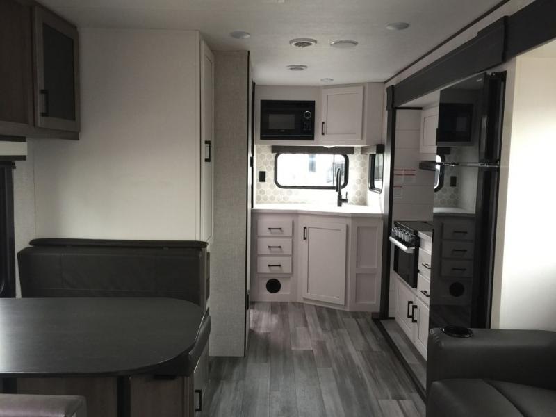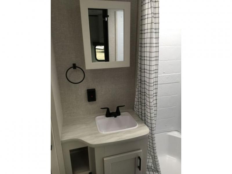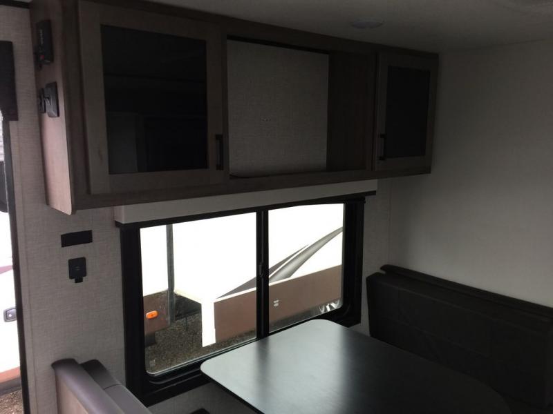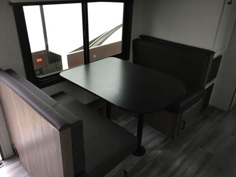 You will have a comfortable camping trip in this travel trailer! It offers full kitchen amenities including a pantry for snacks and such, plus a full rear corner bathroom for privacy and includes a shower. When you need a break, the semi-private bedroom up front offers a queen bed, dual wardrobes and a curtain to close, and the booth dinette can transform into a sleeping space as well. There is a 18' power awning with LED lights for you to enjoy this outdoor space into the night, plus exterior storage for your outdoor games and gear.