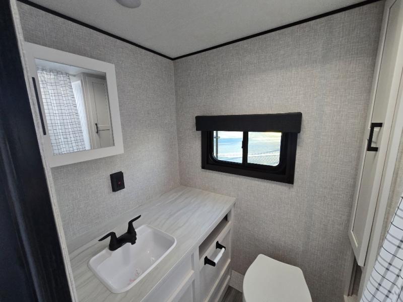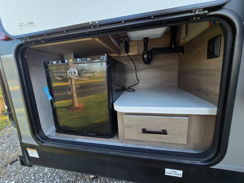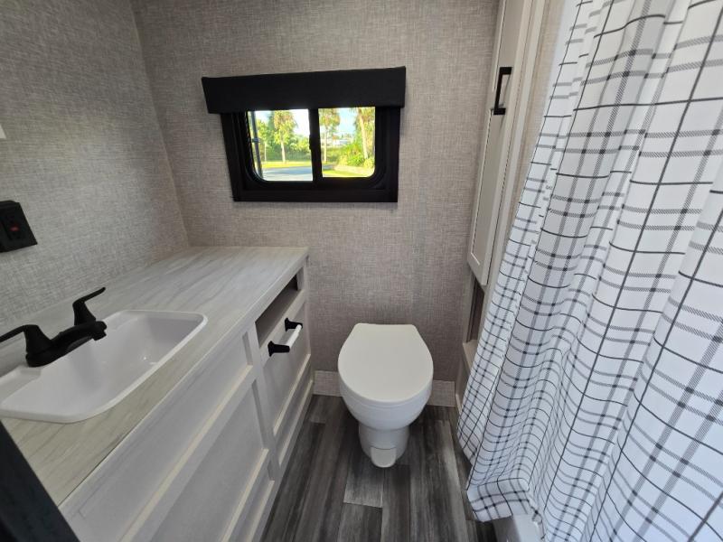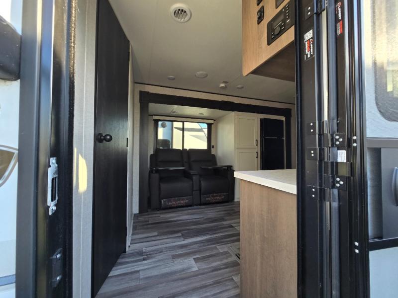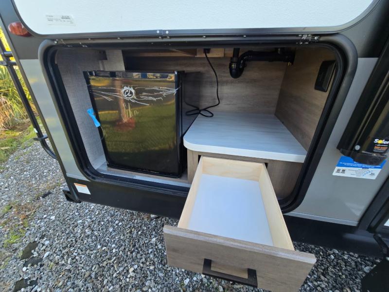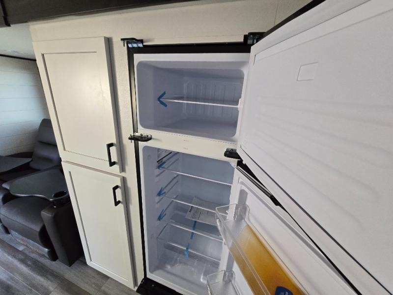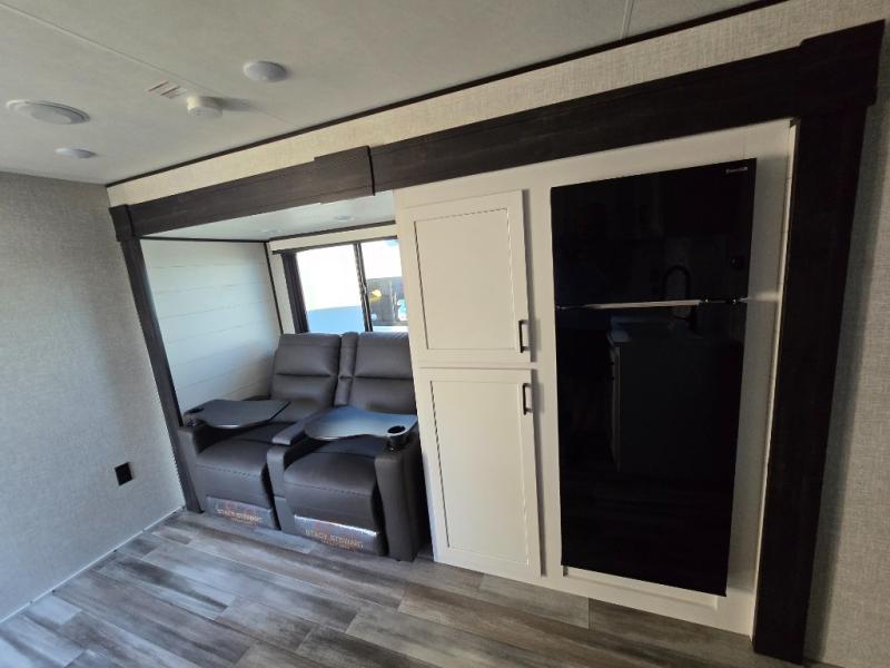 You will feel right at home in this travel trailer! It features a front private bedroom with a 60" x 75" queen bed that has wardrobes on either side and a shelf above to set your books. The kitchen has everything you will need to prepare a delicious home cooked meal including a large pantry to store your favorite snacks. The theater seats are directly across from the entertainment center and can also be switched out for an optional tri-fold sofa. The full rear bathroom has an abundance of room for you to walk around as you get ready each morning. You can grab a jacket on those crisp mornings and head to the outside fridge for a cold beverage in between outdoor games!