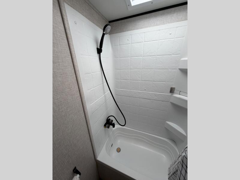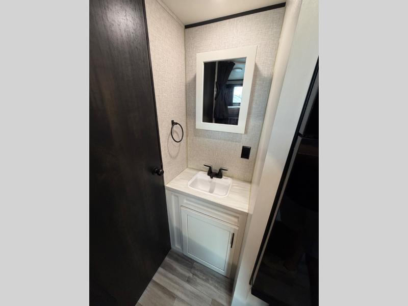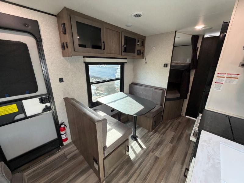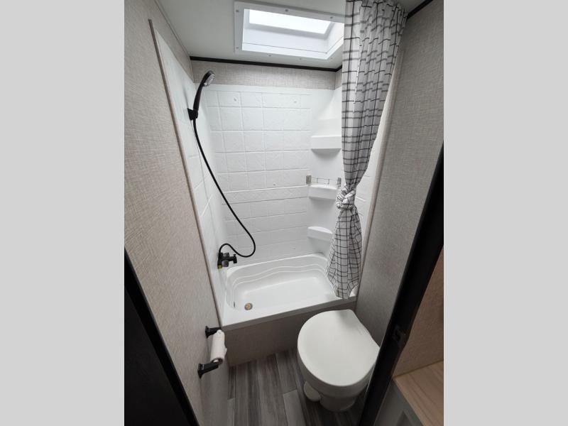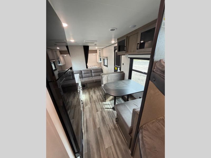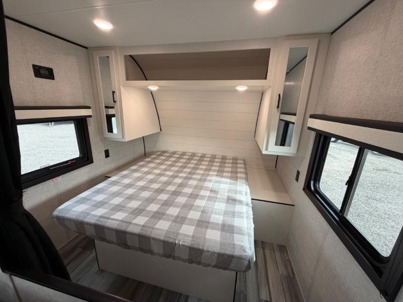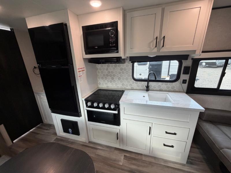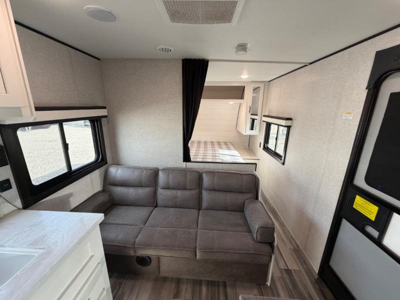 This easy to setup trailer offers a semi-private bedroom up front with a queen bed, semi-private double size bunks in the rear thanks to the curtains, and a private toilet and tub/shower room. The bathroom sink is just outside the door allowing two people to get ready for bed at once. The galley kitchen offers full amenities, and two can dine at the booth dinette and some can relax on the jackknife sofa. Both furnishings offer extra sleeping space. And you might like to add the Chil N' Stor option which adds a fridge and counter space along the exterior to serve meals outside and store extra beverages.