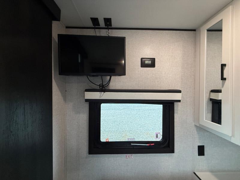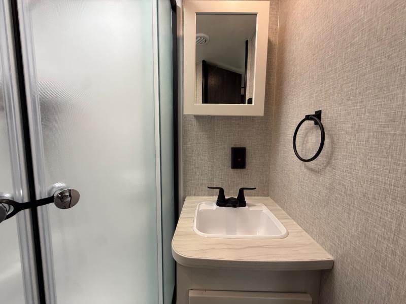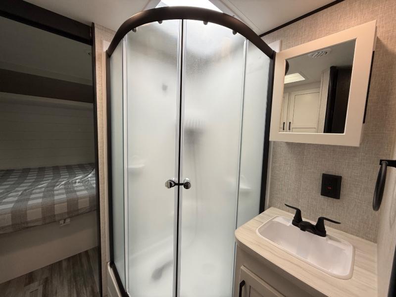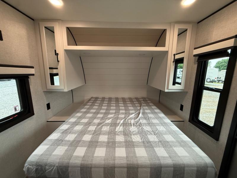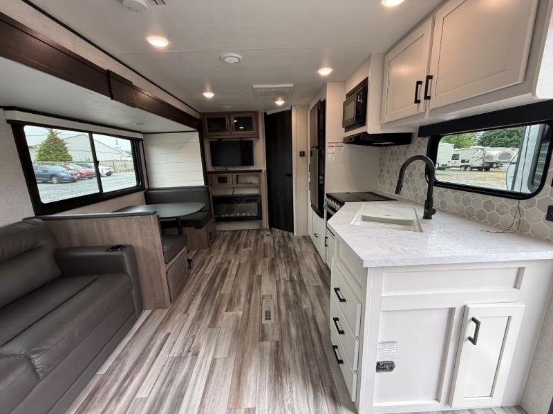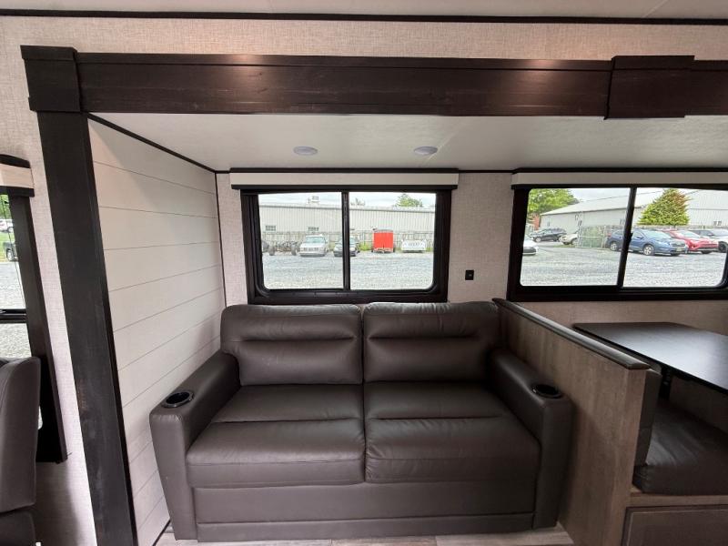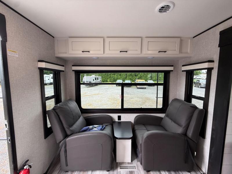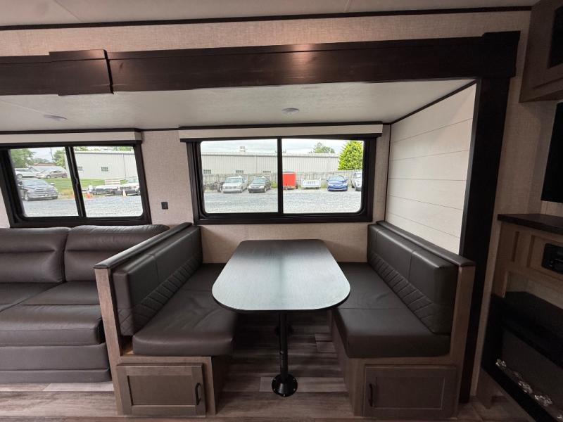 When you want to travel and see new places, this trailer gives you the flexibility to sleep two to four, plus offers a full walk-through bathroom with access from the main area and the front private bedroom. You will also appreciate having a second entry/exit door in the bedroom, a walk-around queen bed, plus dual wardrobes giving you your own side of the bed. The bathroom also has a radius shower and linen storage. The kitchen includes full amenities to make your own meals, and a pantry to keep your dry goods and snacks. You will love the rear swivel rockers with table in between to place your drinks, and the jackknife sofa plus booth dinette offer more seating, sleeping space, and extra floor space since they are within a slide.