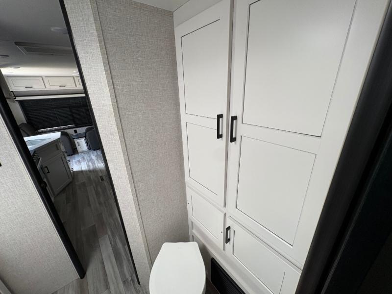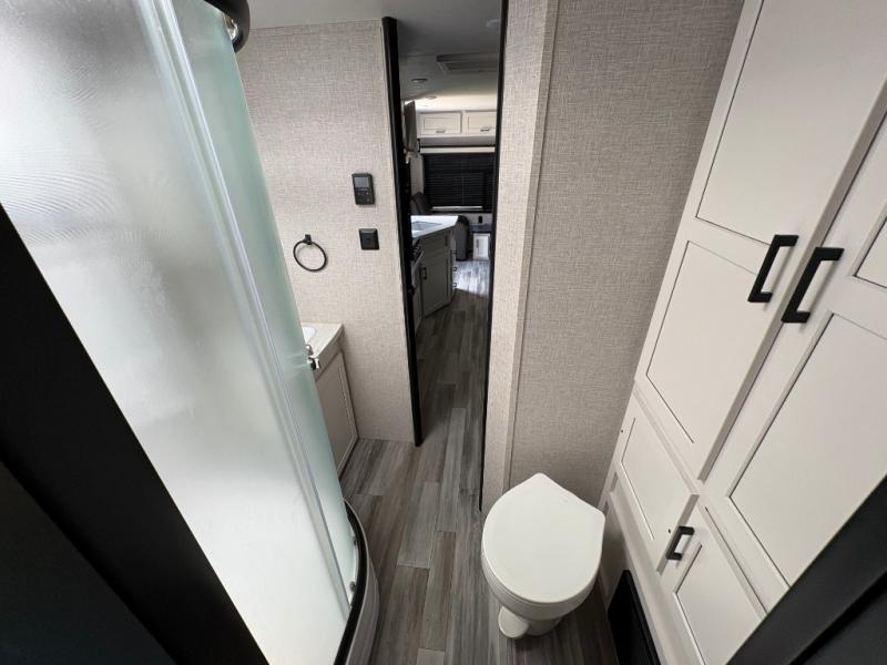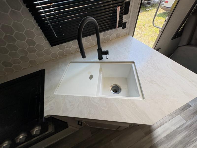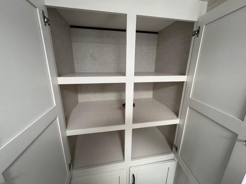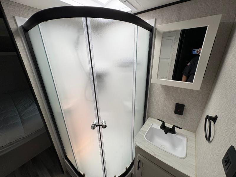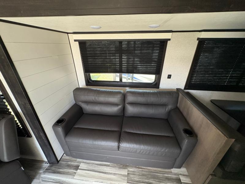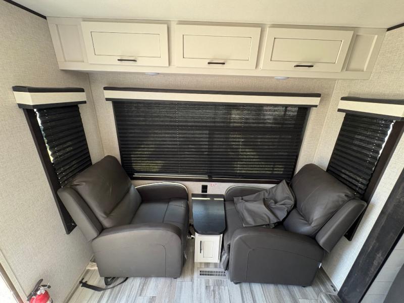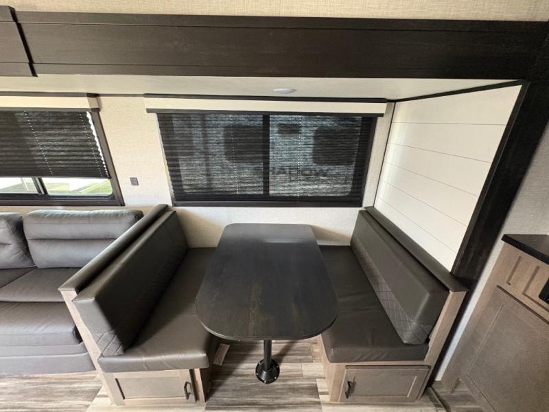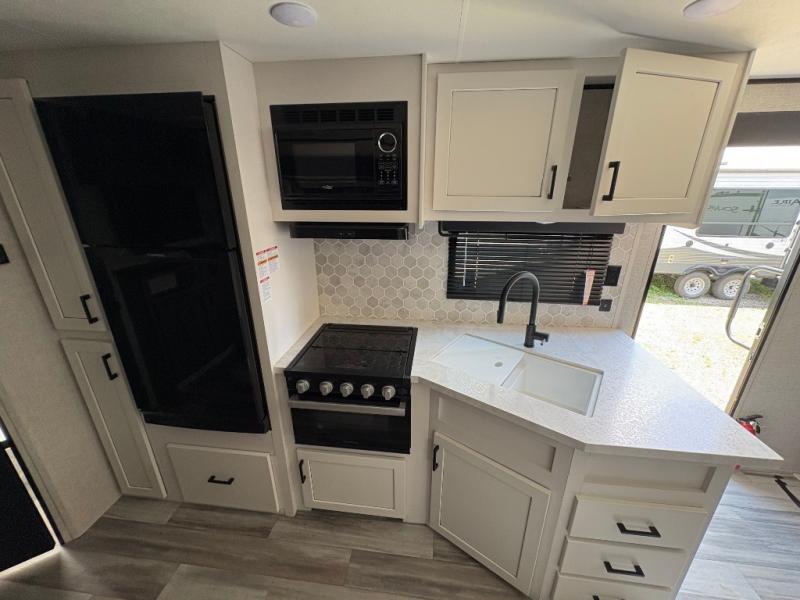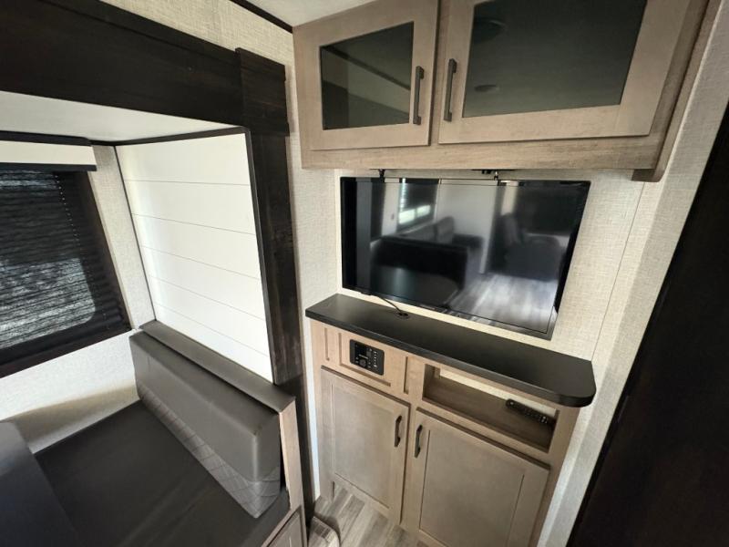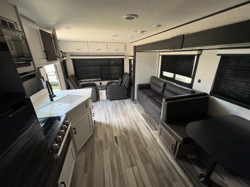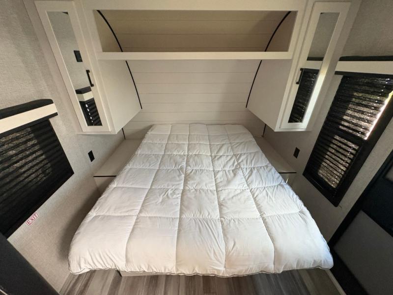 When you want to travel and see new places, this trailer gives you the flexibility to sleep two to four, plus offers a full walk-through bathroom with access from the main area and the front private bedroom. You will also appreciate having a second entry/exit door in the bedroom, a walk-around queen bed, plus dual wardrobes giving you your own side of the bed. The bathroom also has a radius shower and linen storage. The kitchen includes full amenities to make your own meals, and a pantry to keep your dry goods and snacks. You will love the rear swivel rockers with table in between to place your drinks, and the jackknife sofa plus booth dinette offer more seating, sleeping space, and extra floor space since they are within a slide.