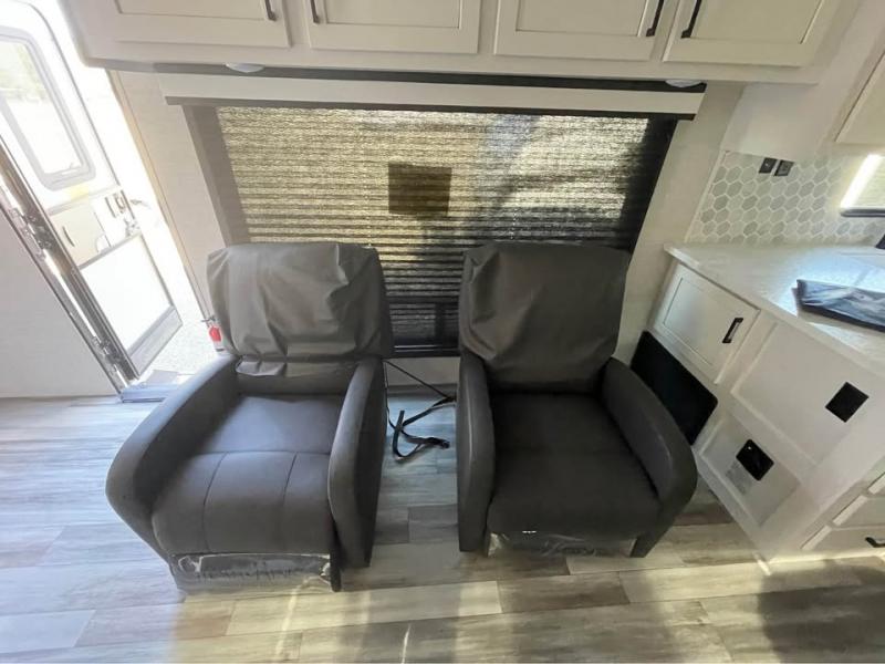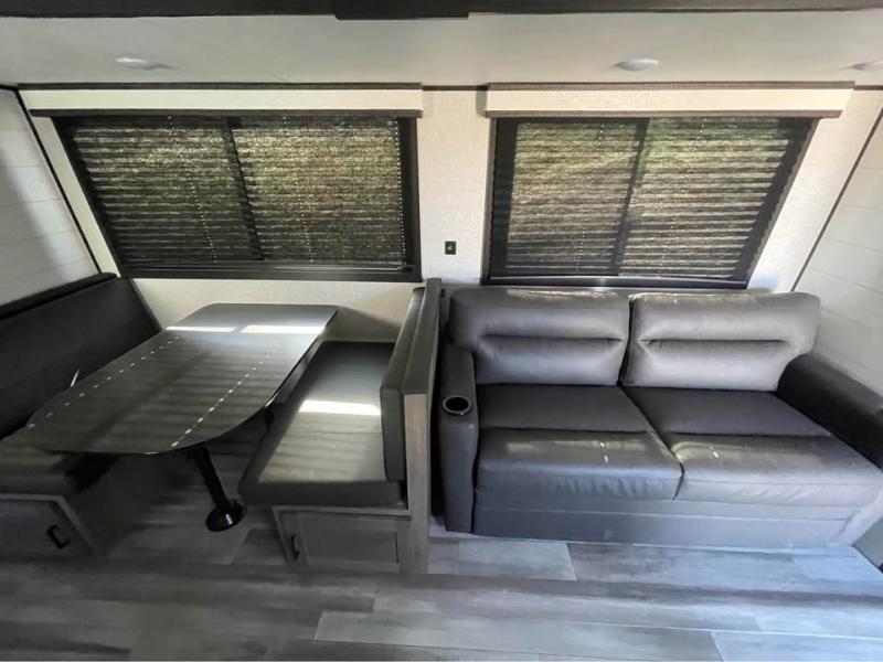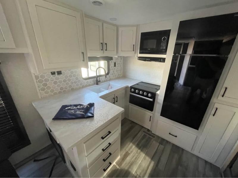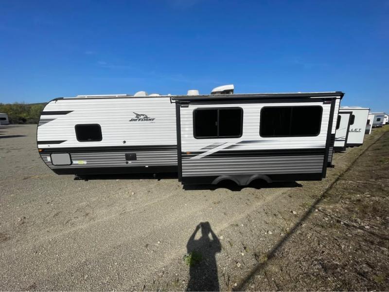 Enjoy all of your camping trips with this Jay Flight in tow! You will find ample seating throughout with dual recliners in the living area opposite a jackknife sofa and booth dinette slide. Not only can you easily entertain company, but the jack-knife sofa and dinette will also allow you to sleep added family or friends. The rear kitchen layout has everything you need to prepare your favorite home classics or camp favorites with a range top plus oven, and microwave as well. The U-shaped counter provides added prep space and you will also find plenty of storage in the overhead cabinets and storage drawers and cupboards below. A dual entry bath makes it easy to access from the hall or from the private bedroom where you will get a great night's rest after each full day of adventure!