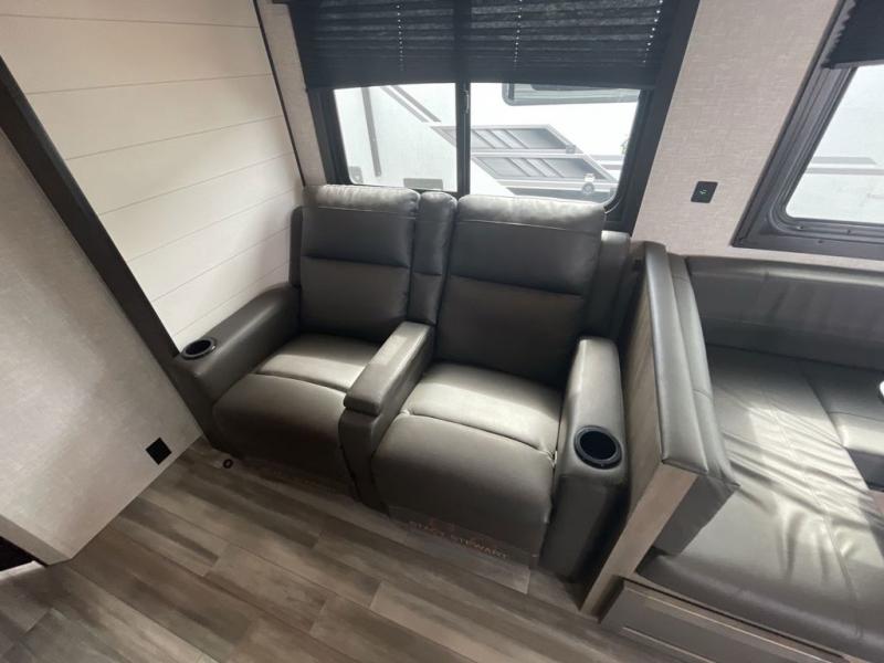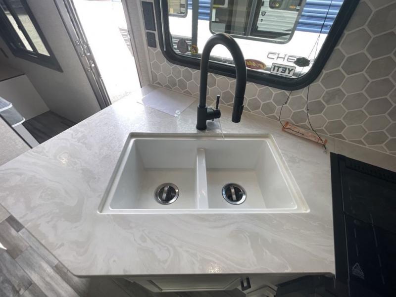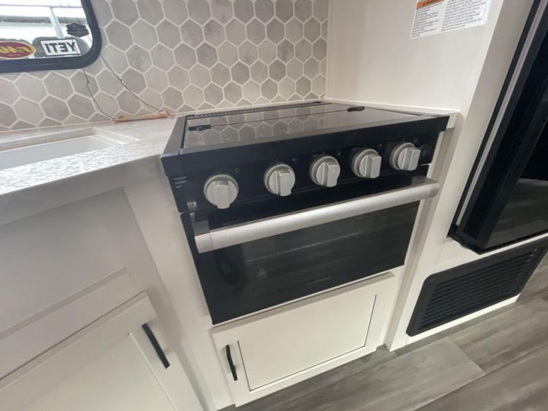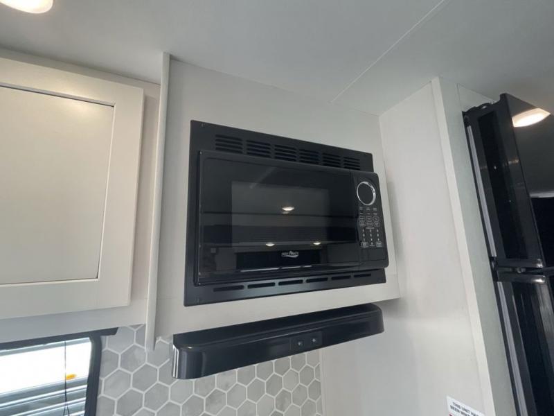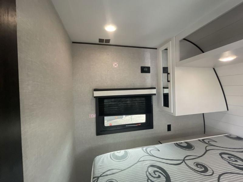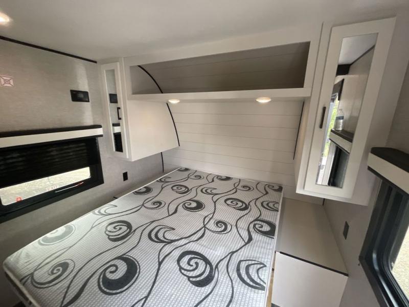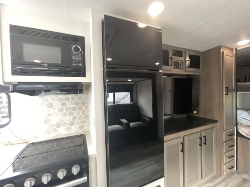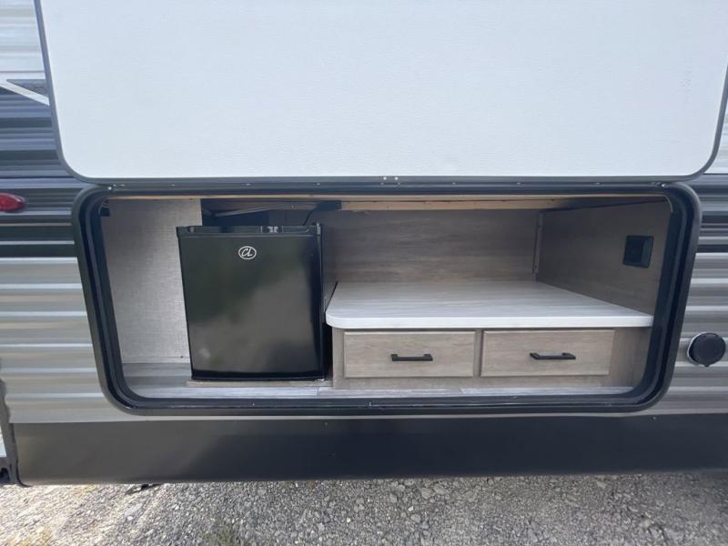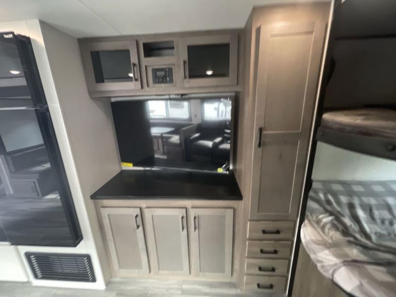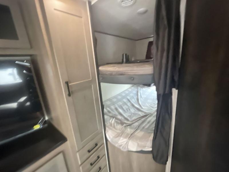 Loads of fun like hiking, fishing, and playing outdoor camping games are waiting for you to make that reservation, hitch up and head out! This trailer allows the owners to sleep in privacy behind the space saving sliding door on a 60" x 75" queen bed. And the kids or grandkids can sleep on the double size bunks in the rear next to the full bathroom including a tub/shower. They even have a wardrobe nearby for their things. The slide out jackknife sofa and U-shaped dinette offers more floor space, a place to relax and dine, plus you can play games at the dinette. The kitchen includes full amenities at your fingertips, plus you all can enjoy the entertainment center with TV when inside. When you want to be outdoors, relax under the 16' power awning after grabbing your camping chairs, and you can grab a beverage from the outside fridge!