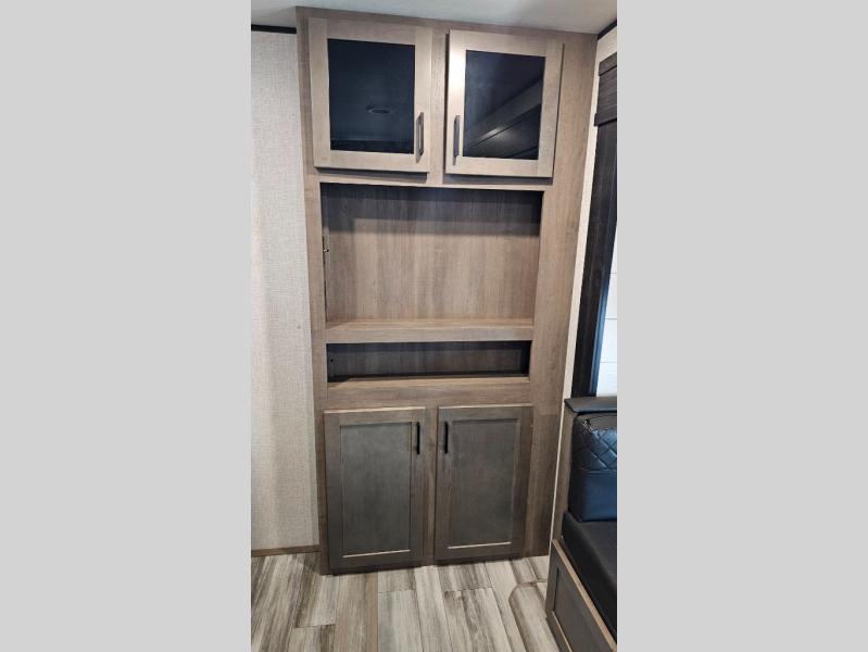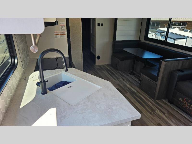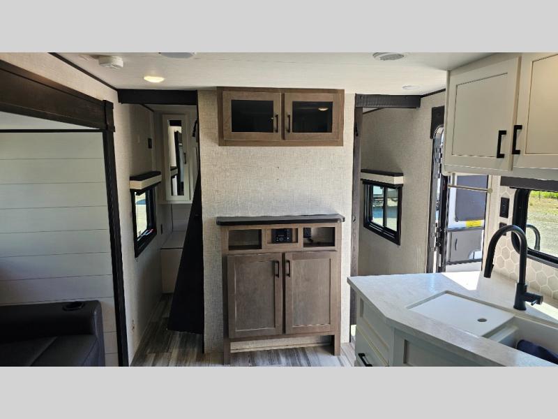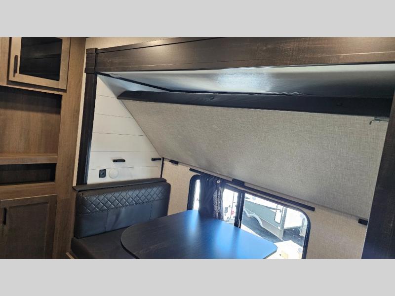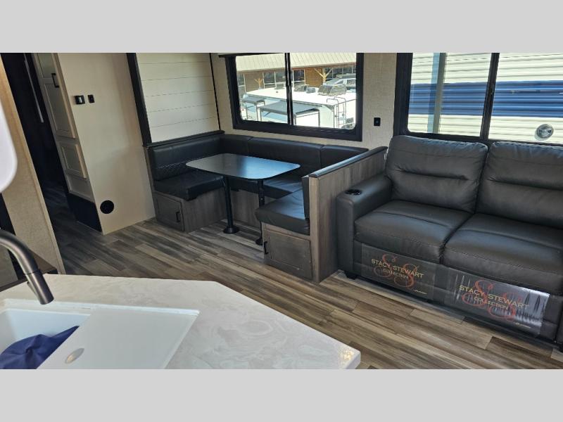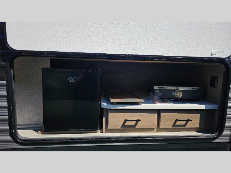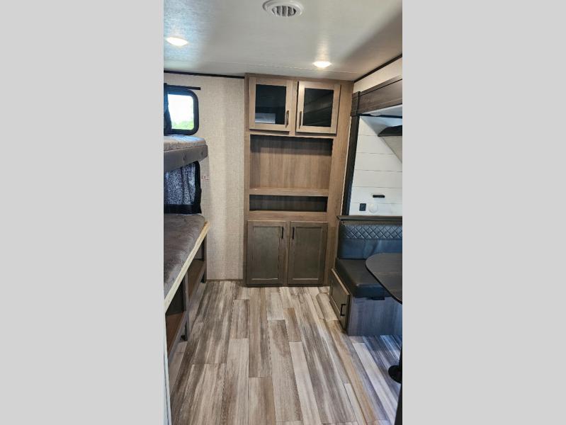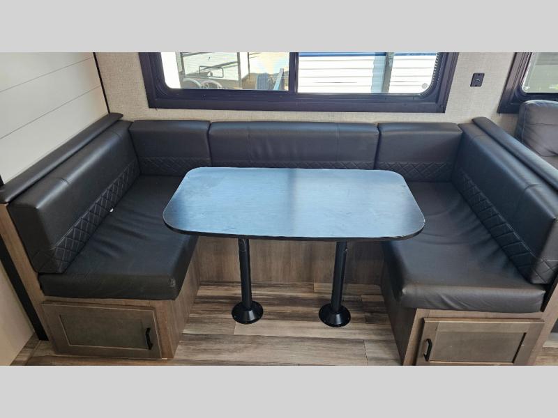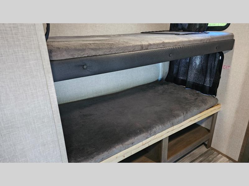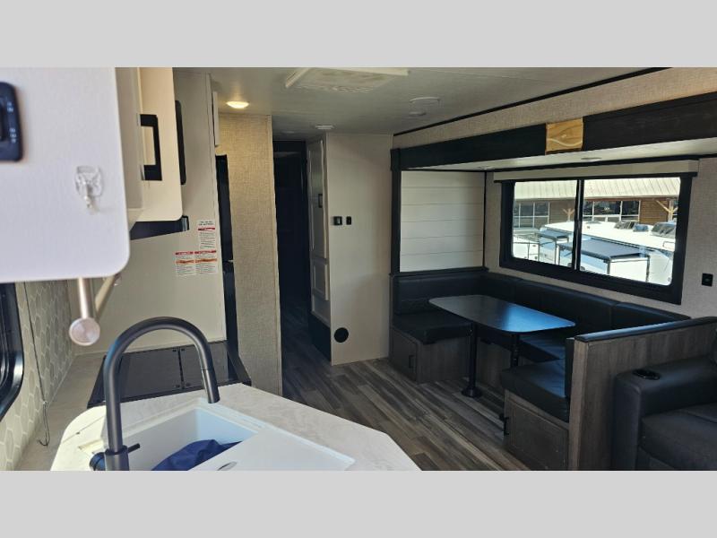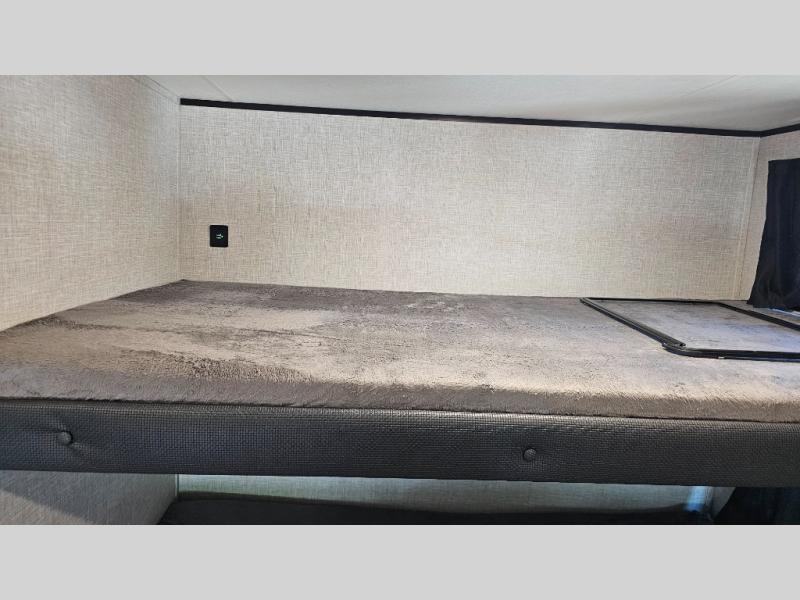 Get ready for a whole lot of memories being made when you have this trailer at the campgrounds! From the kids telling stories at night while they sleep on the three bunks and the booth dinette in the rear bunkhouse to you relaxing on the jackknife sofa and U-shaped dinette. Both furnishings offer more sleeping space when the whole family joins you. And the slide out gives you more floor space! The full bathroom has an interior and exterior entry for convenience, and the inside kitchen offers full amenities while the outside kitchen gives you more choices when cooking for everyone. You will also appreciate privacy in the front bedroom with dual access, two wardrobes and windows for views of the scenery.