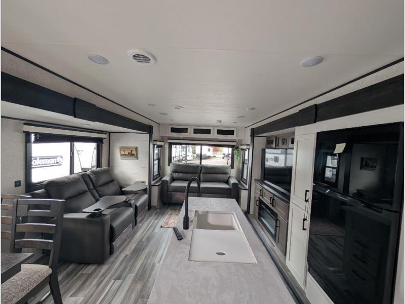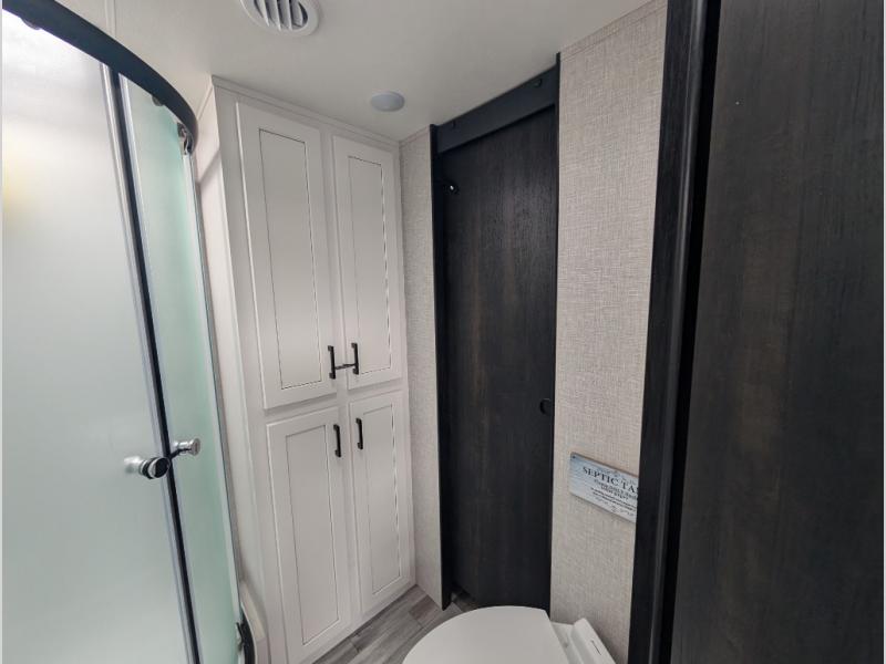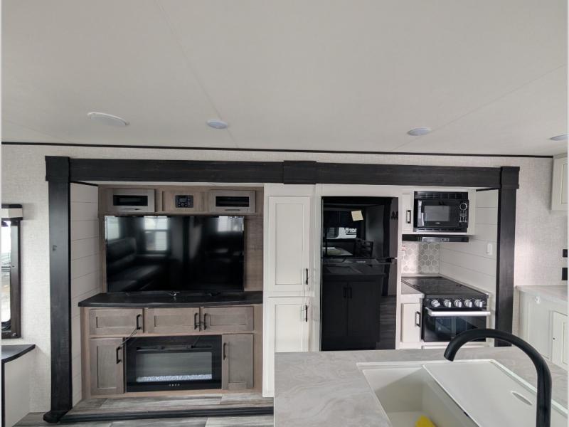 Enjoy a relaxing weekend getaway in this travel trailer! The dual entry bathroom with radius shower creates a front master suite with a queen bed slide, a dresser, and a front large wardrobe with storage space next to it that is prepped to add an optional washer and dryer. The chef will have an easy time preparing their best home cooked meals with the kitchen island, hutch, three burner cooktop, and 12V refrigerator. Enjoy your meals at the booth dinette then play a card game or transform it into an extra sleeping space. The rear living area has a rear jackknife sofa for a quick afternoon nap and theater seating across from the entertainment center with a fireplace for the perfect spot on movie night!
