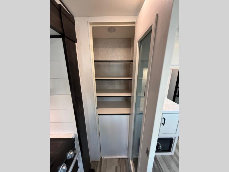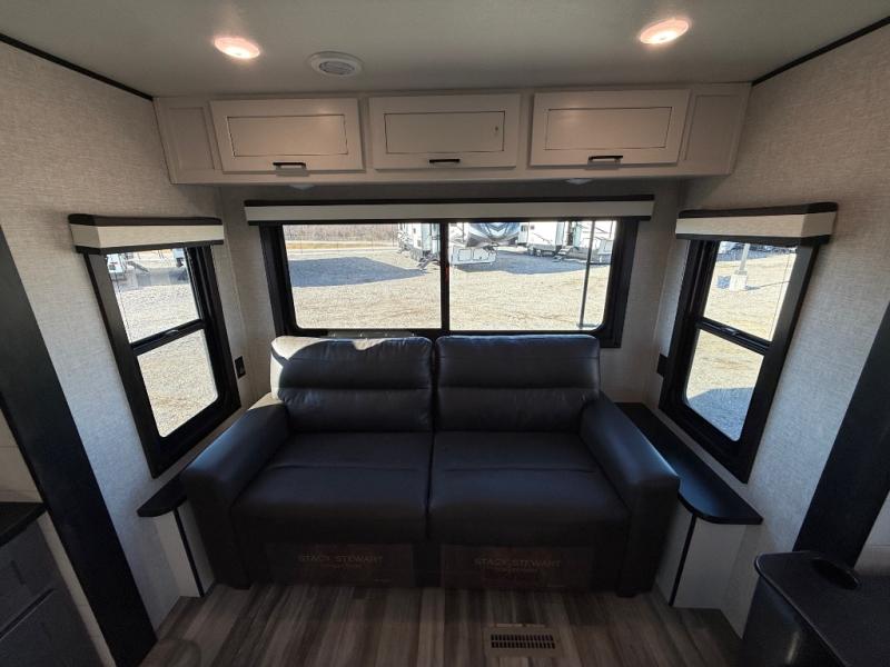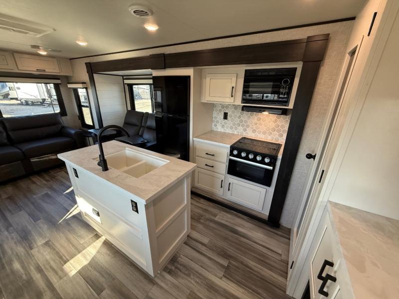Take this travel trailer to all of your favorite campgrounds! The front private bedroom not only has a queen bed slide to lay your head on at night, but also a dresser and a front large wardrobe for your clothes, a storage area for an optional washer and dryer, and even an entrance into the dual entry bathroom with a radius shower to freshen up in each morning. Now that you're rested and cleaned, you can fill your belly with some delicious scrambled eggs on the three burner cooktop and a kitchen island with a double sink for easy clean up. Eat your meals at the free standing dinette and play a couple card games at night there too. You even have an outside kitchen with a refrigerator to keep your beverages cold while you play outside, and a rear living area with a jackknife sofa, theater seating, and an entertainment center with a fireplace!