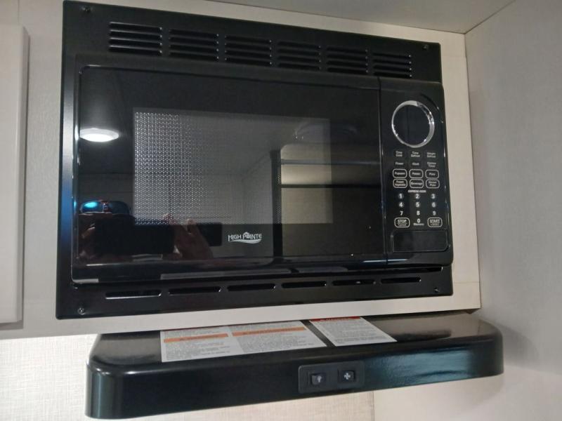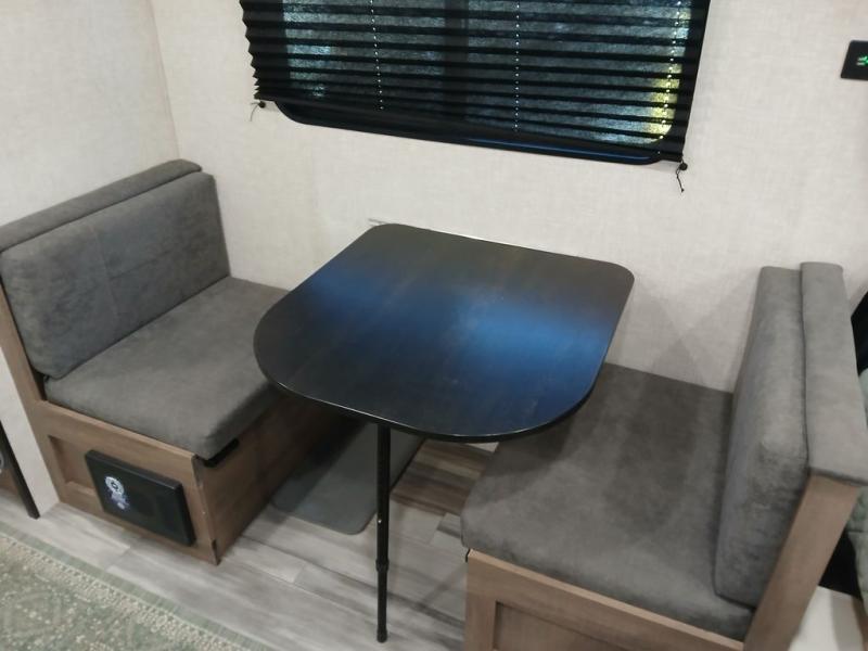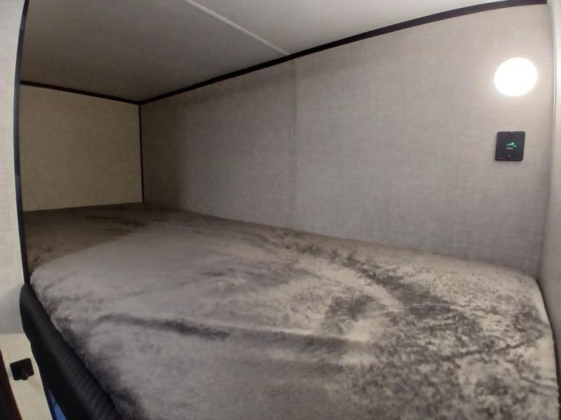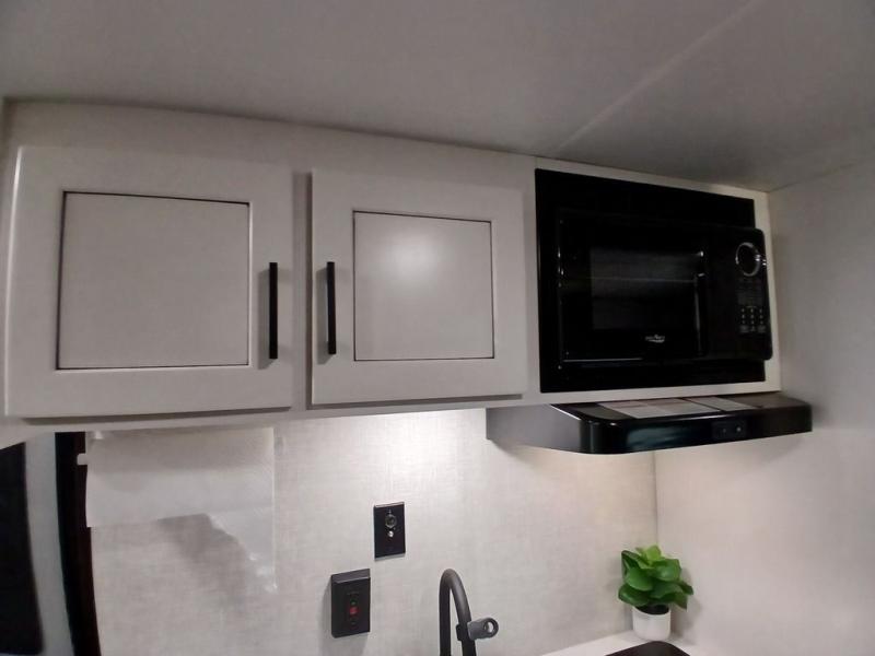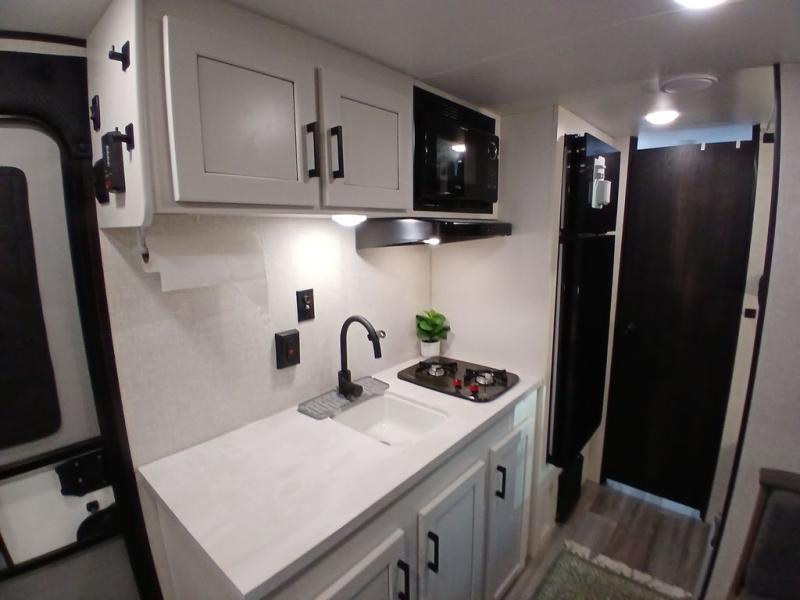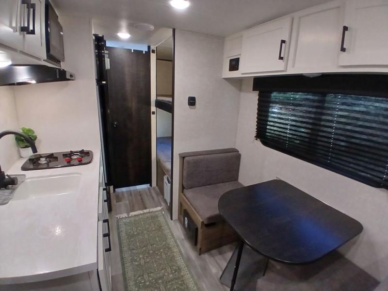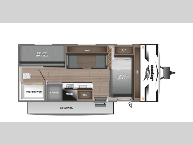 This Jay Flight SLX travel trailer offers you a queen-size bed for sleeping at night, and there is even a privacy curtain that you can draw to separate the bed from the rest of the trailer too. The 29" x 75" bunk beds are another sleeping location, and you can even create a bed for one more person by transforming the booth dinette. Overhead cabinets will help you keep your belongings organized, and the kitchen has a two-burner range, 8 cu.ft. 12V refrigerator, microwave oven, and a high-rise faucet at the sink to help you prepare meals.