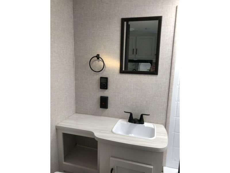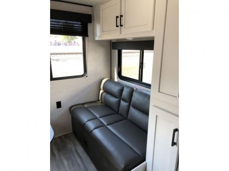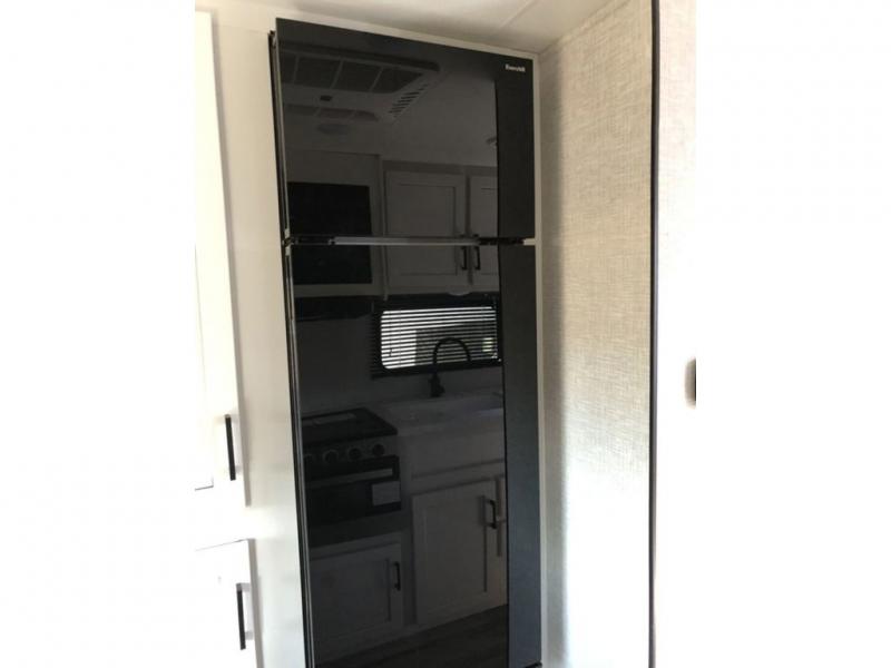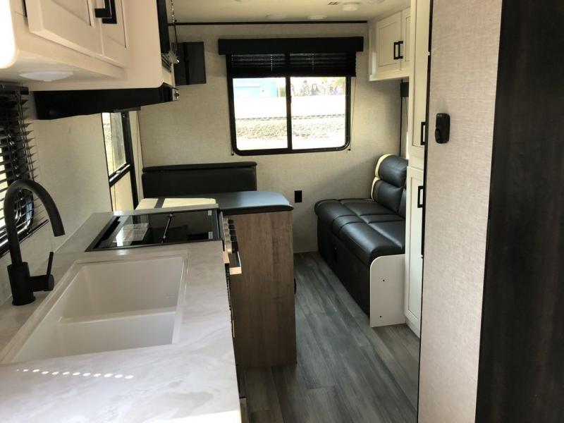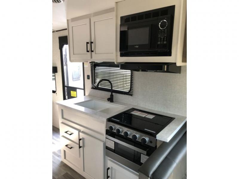 Camping in the woods is just what the doctor ordered and this trailer will provide all the interior comforts you need! There is a three burner cooktop and a microwave oven to prepare meals each day, plus an 8 cu. ft. 12V refrigerator for cold items. After your meal is made, you can dine at the booth dinette or relax on the jack-knife sofa, and these areas can become sleeping space for two to three guests at night. The full bath with a tub/shower means you won't have to use the camp's facilities and the 16' power awning will provide protection from the sun as you visit with other campers!