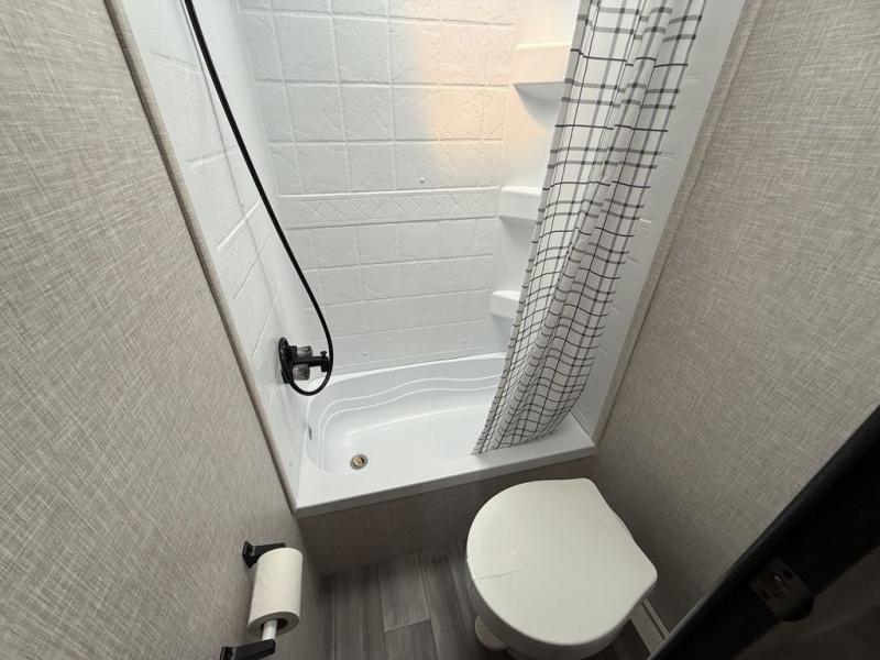 You can comfortably sleep up to 10 people in this trailer thanks to the double-size bunks, the RV queen bed in the front bedroom, plus the booth dinette and jack-knife sofa in the main living area! The chef of your crew will have a three burner cooktop and microwave oven to prepare meals, and everyone can store their favorite drinks in the 8 cu. ft. 12V refrigerator. The bathroom includes a tub/shower and a toilet, with the sink just outside of this room so others can brush their teeth if one is taking a shower before bed. The outside storage will let you bring along fishing poles and the 16' power awning with LED lights will create a nice place to gather in the evenings!