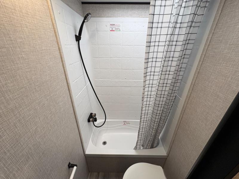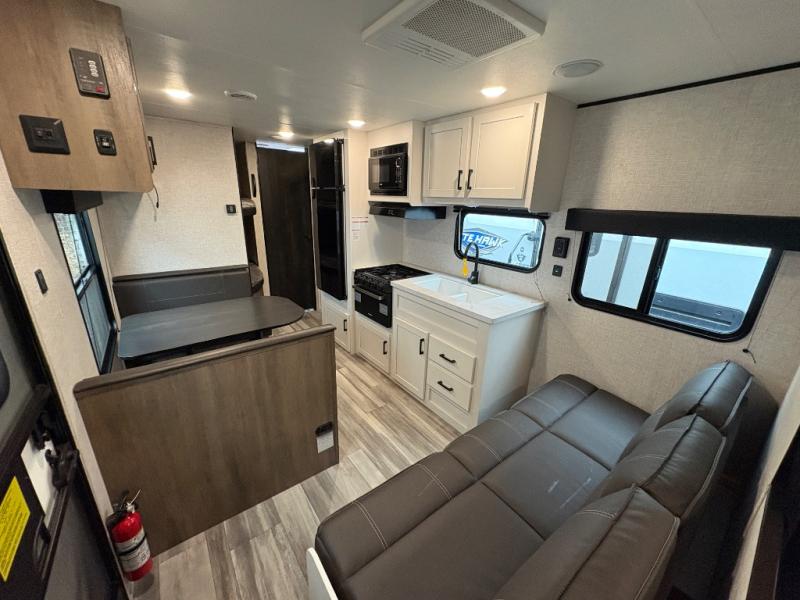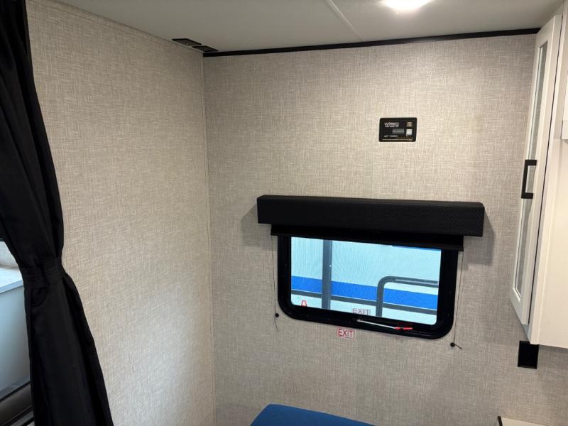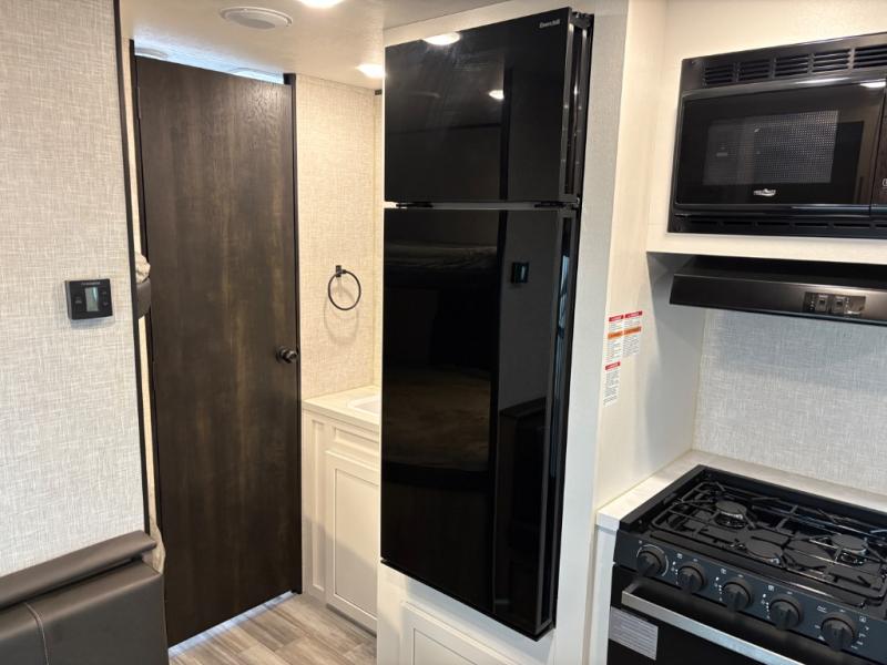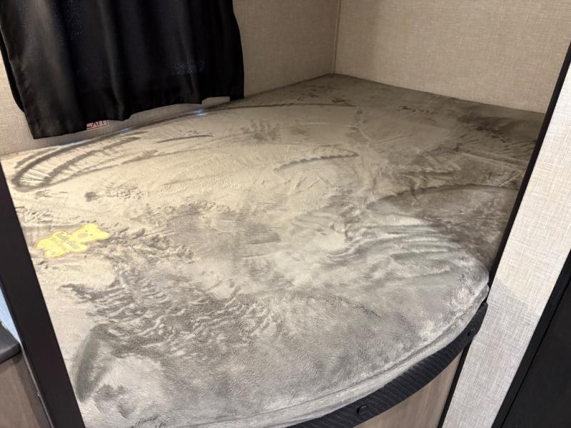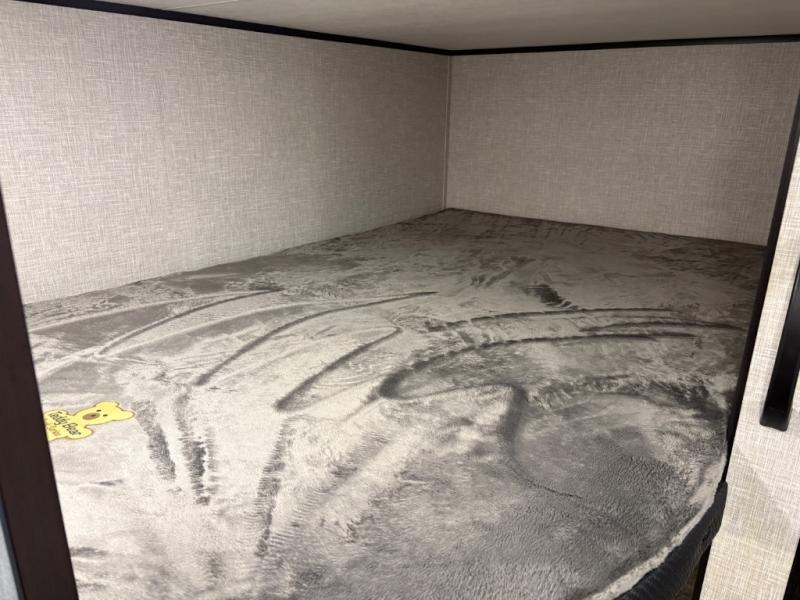 Get ready for family fun or a friend's weekend at the campgrounds in this trailer! This trailer offers full kitchen amenities including a pantry for snacks and such, plus a full rear corner bathroom for privacy and includes a shower. When you need a break, the semi-private bedroom up front offers a queen bed, dual wardrobes and a curtain to close, and the double size bunks offer a curtain to close as well. There is a 13' power awing with LED lights for you to enjoy this outdoor space into the night, plus exterior storage for your outdoor games and gear.